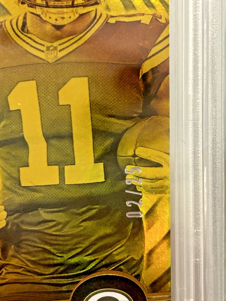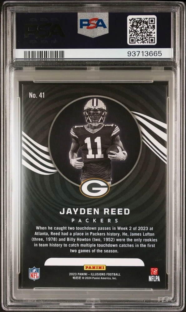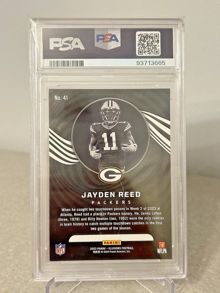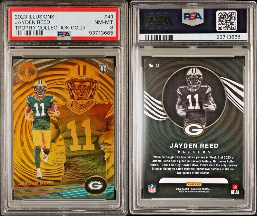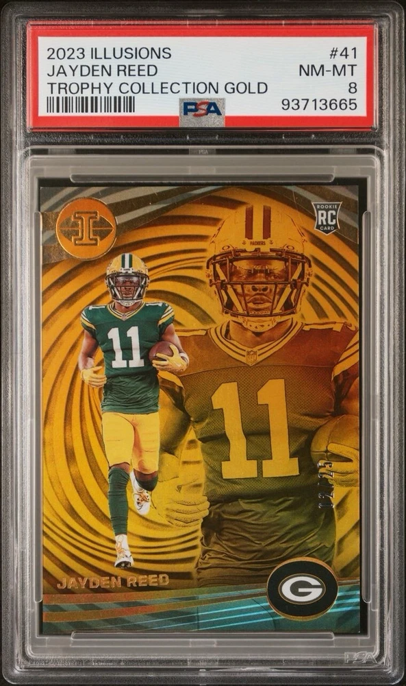 This Jayden Reed RC 2023 Illusions Trophy Collection Gold PSA 8 card is a must-have for any Green Bay Packers fan or sports trading card collector. With a print run of only 25, this card is a rare find and features a gold parallel/variety. The card is also serial numbered and is a rookie card, making it an even more valuable addition to any collection. The card has been professionally graded by the Professional Sports Authenticator (PSA) and has a grade of 8. It is part of the 2023 Panini Illusions set and has the card number 41. This card is a great investment for any fan or collector looking to add a unique and valuable piece to their collection.