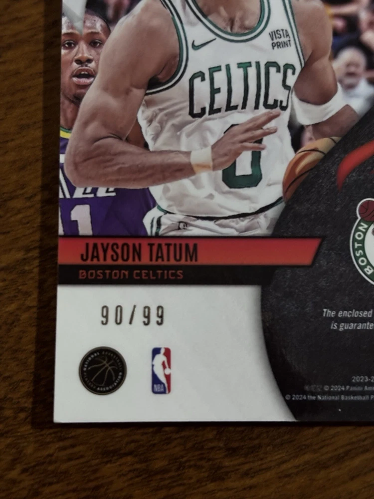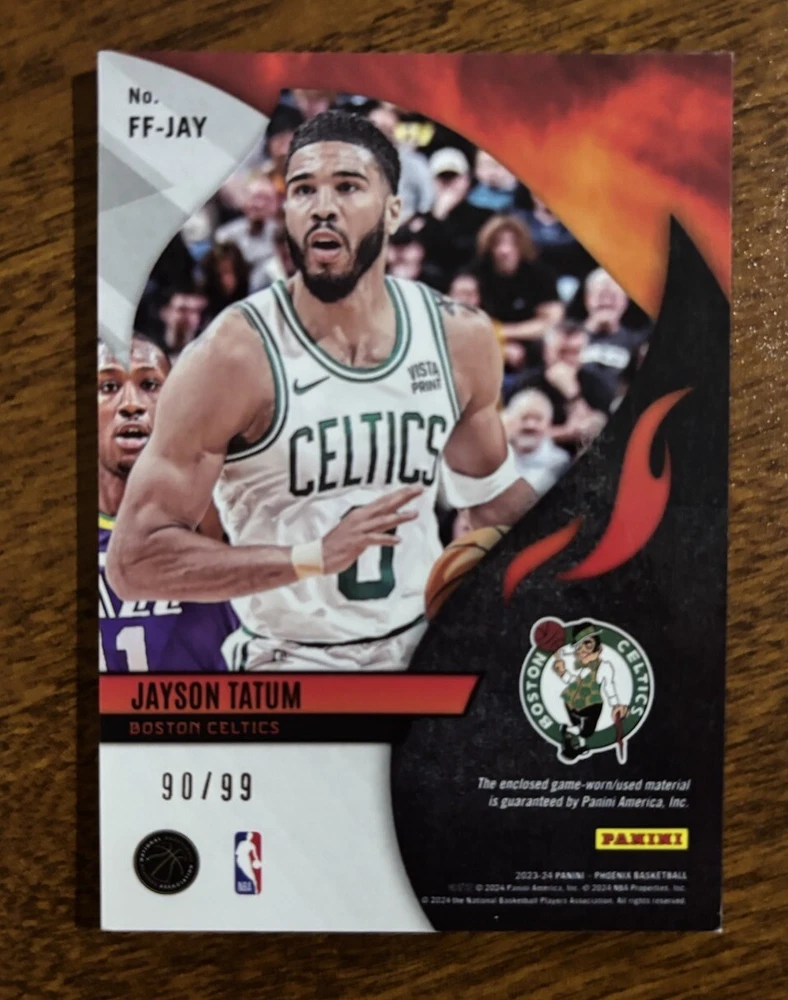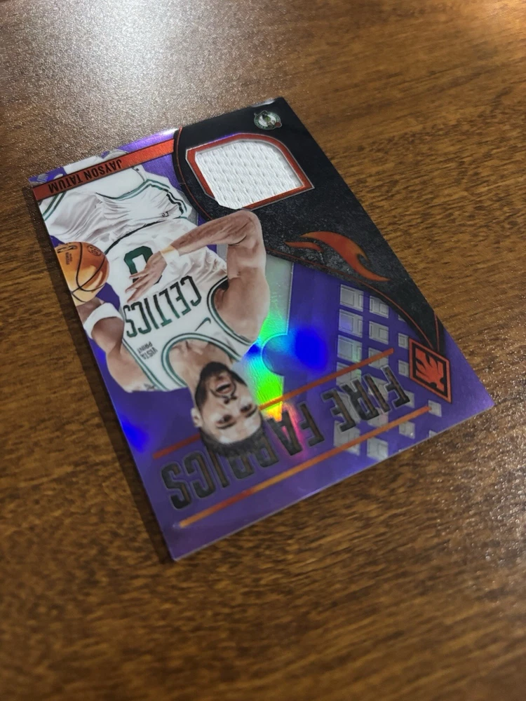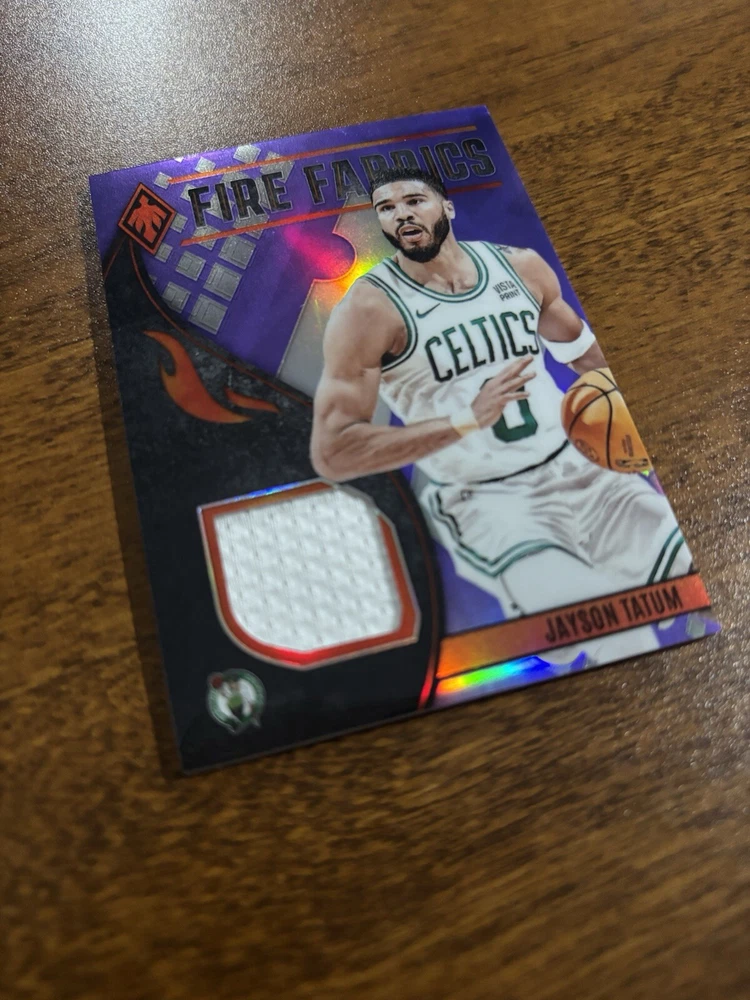 Autographed: No Type: Sports Trading Card Player/Athlete: Jayson Tatum Features: Memorabilia, Insert, Parallel/Variety, Serial Numbered, Game Worn Patch Print Run: 99 Parallel/Variety: Purple Set: 2023 Panini Phoenix Team: Boston Celtics League: National Basketball Association (NBA) Season: 2023 Insert Set: Fire FabricsPurple /99 Sport: Basketball Manufacturer: Panini Card Number: FF-JAY Card Name: Fire Fabrics Year Manufactured: 2023