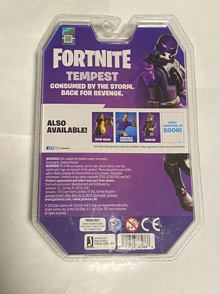 Brand:JazwaresMaterial:PlasticCountry/Region of Manufacture:ChinaAge Level:8+Signed:NoModel:TempestVintage:Nogtin13:191726385868Character:TempestSeries:Solo ModeFranchise:FortniteTheme:TV, Movie & Video GamesOriginal/Licensed Reproduction:OriginalType:Action FigureTime Period Manufactured:2020-NowPersonalize:NoYear Manufactured:2020Color:MulticolorScale:1/18UPC:191726385868MPN:FNT0600