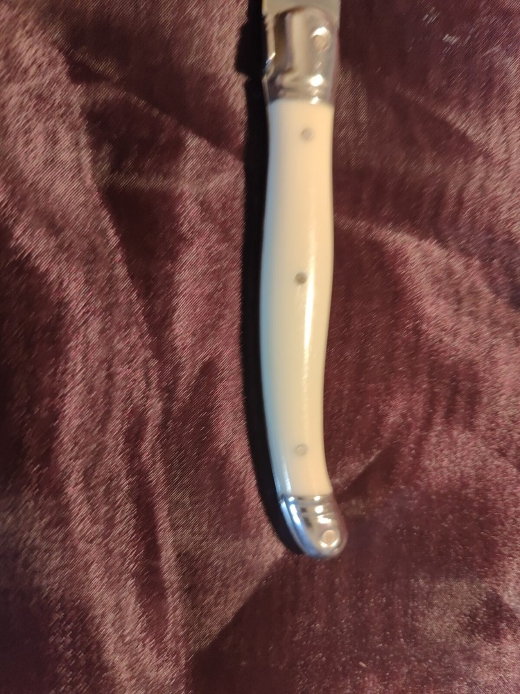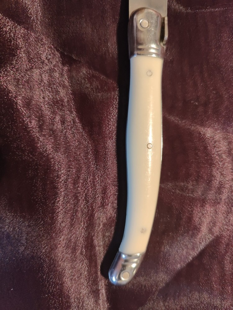 The Jean Dubost Laguiole Replacement Steak Knife in Ivory color with a silver bee emblem between the blade and handle is a high-quality utensil made in France. The Laguiole brand is known for its craftsmanship and attention to detail, making this knife a reliable choice for any kitchen looking to replace or add to your current set. The knife is preowned, and it does show wear from use including scratches, scrapes and buffs to the blade and handle.