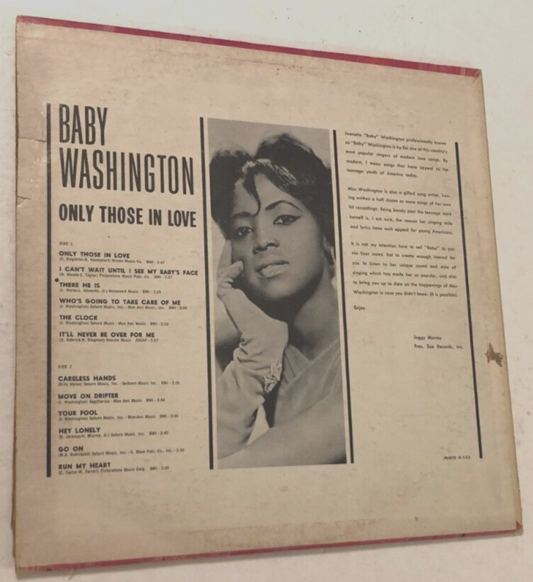This is a vintage 1965 vinyl LP record titled "Only Those In Love" by artist Jeanette "Baby" Washington, released by Sue Records. The record is in a cardboard sleeve with a black vinyl material and plays at 33 RPM. It features original cover art and falls under the genres of soul and R&B & soul. This 12" record is from the 1960s era and was manufactured in the United States. I have been collecting since the early 70s and have over 5,000 plus albums and 45s combine in my collection. I am downsizing and will list as many as I can daily. Please check my listings in the records category in my eBay store @ https://stores.ebay.com/thesixties. Any questions or concerns, feel free to contact me. Thank you. Sale conditions for all new/old stock vintage (20+ years) still-sealed record albums only *Please read the condition description carefully. *Visual grading only, to the best of my ability. *No returns accepted on all sealed albums if opened or shrinkwrap removed. *All returns must be in same condition when received. *All sealed albums are listed and sold as collectible, investment, and/or future PSA grading, and not as a playing copy. *For playing and enjoyment, I recommend an excellent to near mint copy. *Vinyl with no warping. *Please note: (New and sealed only) Album cover with minor creases, and flaws such as dented and/or creases corners, shrink-wrap with partial tears, and ring wear are possible. *If you have any questions or concerns before buying, feel free to contact me. Thank you. Vintage 60s Sue Records LP 1042 Jeanette "Baby" Washington "Only THose In Love" (1965) Vinyl LP Condition: Pre-owned. *This was recently pulled from storage after 35+ years of collecting. See photos provided for more details and condition.