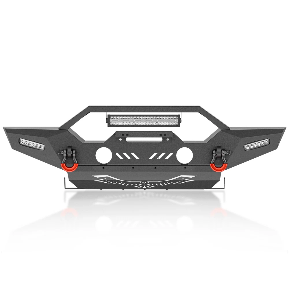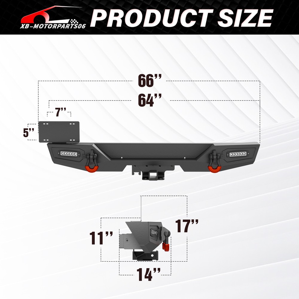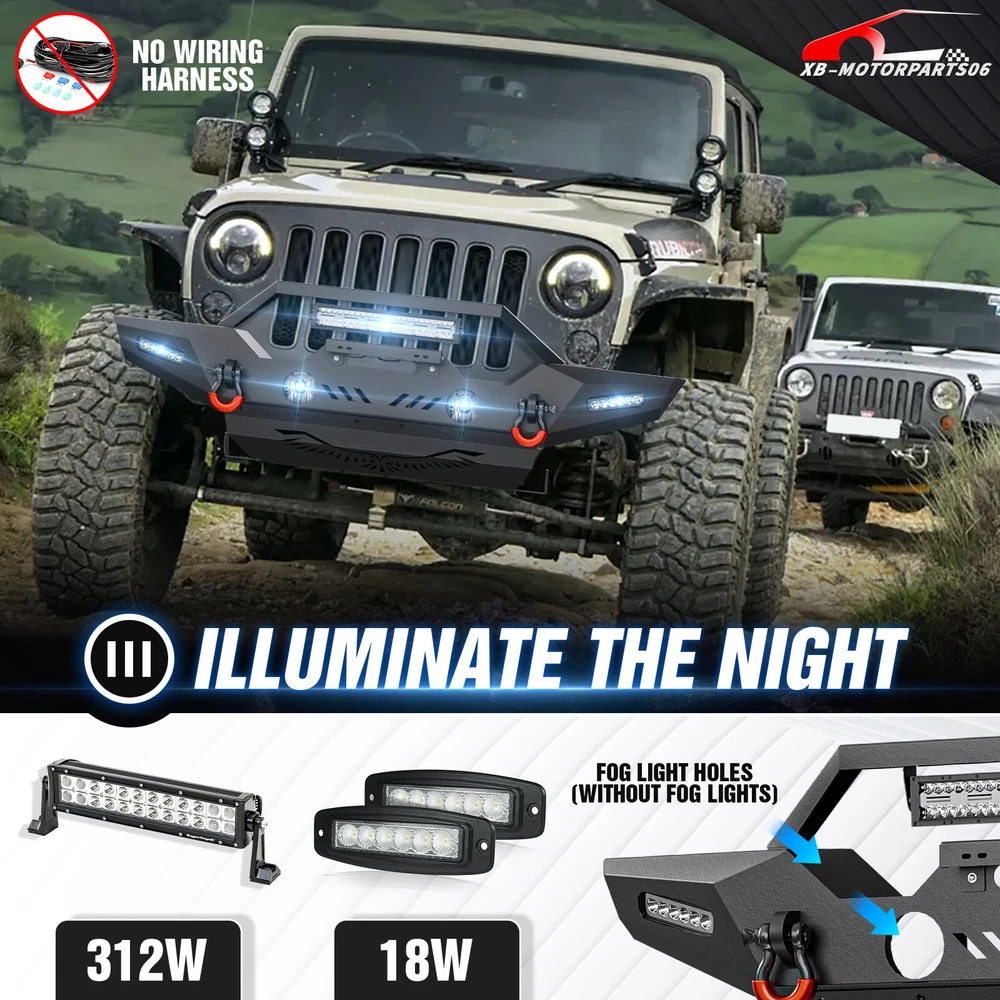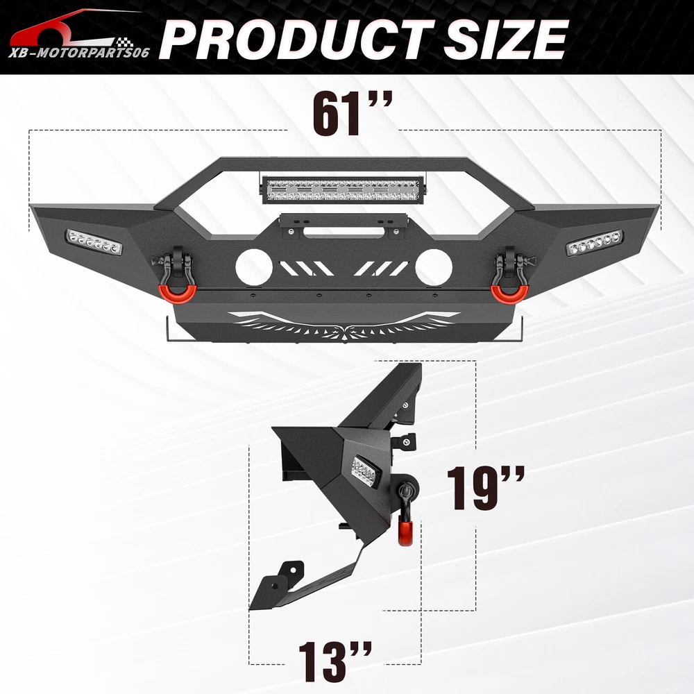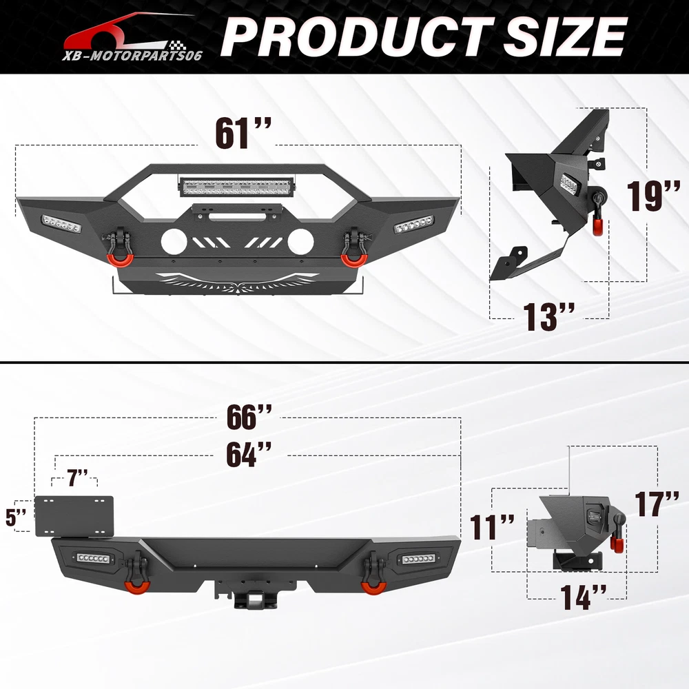 Front /Rear Bumper W/ License Plate Frame For 07-2017 2018 Jeep Wrangler JK JKU Please pay attention to the product options you select: If you choose Front & Rear Bumper,You can get 1 × Front Bumper, 1 × Rear Bumper and Mounting Hardware; If you choose Only Front Bumper,You can get 1 × Front Bumper and Mounting Hardware; If you choose Only Rear Bumper,You can get 1 × Rear Bumper and Mounting Hardware; Suitable Models : Compatible with 2007-2018 Jeep Wrangler JK JKU Unlimited 2/4 Doors Package Includes : ① Front & Rear Bumper option : 1 x Front Bumper, 1 x Rear Bumper, 5 x LED Lights, 2 x License Plate Bracket , 1 x Winch Plate , 4 x D-rings, 2" Hitch Receiver , Skid Plate, 2 x manual, screw fittings ② Fro nt Bumper option : 1 x Front Bumper, 1 x License Plate Bracket, 1 x Winch Plate, 3 x LED Lights, 2 x D-rings, Skid Plate, 1 x manual, screw fittings ③ Rear Bumper option : 1 x Rear Bumper, 2 x D-rings, 2 x LED Lights, 2" Hitch Receiver, 1 x manual, License Plate Frame, screw fittings Product Information : Package Dimensions : 65.16"D x 12.99"W x 16.73"H Installation mode: Bolt-On With Sensor Holes: No Steel thickness: 3mm Placement on Vehicle: Front/Rear Item Weight: Front Bumper: 69 Pounds; Rear Bumper: 65 Pounds Material: Carbon Steel Color: Black (hand measurements may have an error of 2-3 mm/0.078-0.118 in) Feature : Front bumper : ① The front bumper comes with a rugged style skid plate, a 12,000 lbs winch plate, a license plate bracket, two 4.75-ton D-rings (rated at 9500 lbs), pre-drilled holes for OE Fog Lights, a 312W LED spotlight and two 18W LED spotlights for strong illumination; ② The package includes all necessary mounting hardware and detailed installation instructions. The bumper with skid plate can be easily installed using bolt-on installation, without the need for drilling; ③ Strong steel front bumper and skid plate with two-stage black powder coating resists rust, ensuring durability and lasting appeal, even with minor damage; ④ Powder Coated, Durability, Waterproof; Rear Bumper : ① This bumper includes 4.75-ton capacity D-rings (rated at 9500 lbs.), 2X upgraded LED lights for illumination, Universal License Plate Bracket and a standard 2" receiver hitch; ② The package comprises mounting hardware and user-friendly installation instructions for a straightforward bolt-on installation—no drilling needed; ③ High-strength steel, durable rear bumper. Textured black powder coating resists rust for long-lasting performance and appearance; ④ Durability, Waterproof, Rust-proof; Warranty Period :2 year Standard Shipping (FedEx Ground or FedEx Home Delivery) Will usually ship within 3 business days of receiving cleared payment Please pay attention to the product options you select: If you choose Front & Rear Bumper,You can get 1 × Front Bumper, 1 × Rear Bumper and Mounting Hardware; If you choose Only Front Bumper,You can get 1 × Front Bumper and Mounting Hardware; If you choose Only Rear Bumper,You can get 1 × Rear Bumper and Mounting Hardware; Suitable Models : Compatible with 2007-2018 Jeep Wrangler JK JKU Unlimited 2/4 Doors Package Includes : ① Front & Rear Bumper option : 1 x Front Bumper, 1 x Rear Bumper, 5 x LED Lights, 2 x License Plate Bracket , 1 x Winch Plate , 4 x D-rings, 2" Hitch Receiver , Skid Plate, 2 x manual, screw fittings ② Fro nt Bumper option : 1 x Front Bumper, 1 x License Plate Bracket, 1 x Winch Plate, 3 x LED Lights, 2 x D-rings, Skid Plate, 1 x manual, screw fittings ③ Rear Bumper option : 1 x Rear Bumper, 2 x D-rings, 2 x LED Lights, 2" Hitch Receiver, 1 x manual, License Plate Frame, screw fittings Product Information : Package Dimensions : 65.16"D x 12.99"W x 16.73"H Installation mode: Bolt-On With Sensor Holes: No Steel thickness: 3mm Placement on Vehicle: Front/Rear Item Weight: Front Bumper: 69 Pounds; Rear Bumper: 65 Pounds Material: Carbon Steel Color: Black (hand measurements may have an error of 2-3 mm/0.078-0.118 in) Feature : Front bumper : ① The front bumper comes with a rugged style skid plate, a 12,000 lbs winch plate, a license plate bracket, two 4.75-ton D-rings (rated at 9500 lbs), pre-drilled holes for OE Fog Lights, a 312W LED spotlight and two 18W LED spotlights for strong illumination; ② The package includes all necessary mounting hardware and detailed installation instructions. The bumper with skid plate can be easily installed using bolt-on installation, without the need for drilling; ③ Strong steel front bumper and skid plate with two-stage black powder coating resists rust, ensuring durability and lasting appeal, even with minor damage; ④ Powder Coated, Durability, Waterproof; Rear Bumper : ① This bumper includes 4.75-ton capacity D-rings (rated at 9500 lbs.), 2X upgraded LED lights for illumination, Universal License Plate Bracket and a standard 2" receiver hitch; ② The package comprises mounting hardware and user-friendly installation instructions for a straightforward bolt-on installation—no drilling needed; ③ High-strength steel, durable rear bumper. Textured black powder coating resists rust for long-lasting performance and appearance; ④ Durability, Waterproof, Rust-proof; Warranty Period :2 year