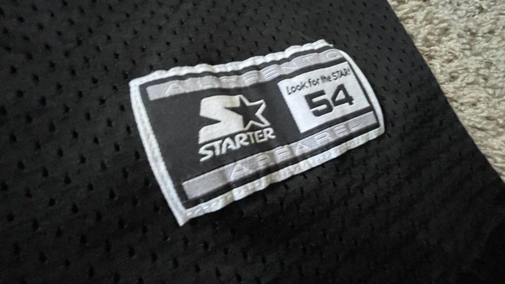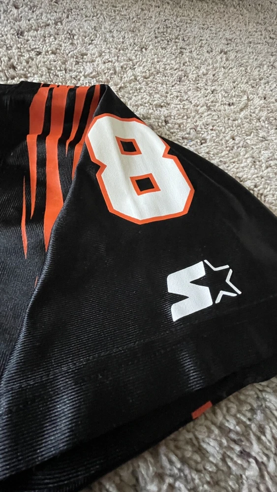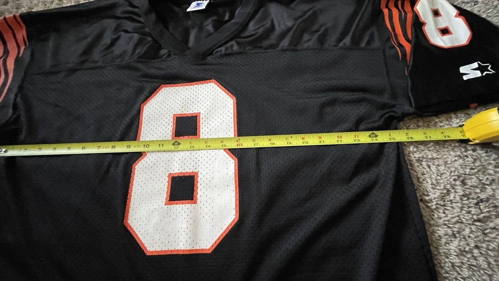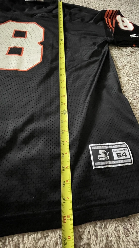 SELLING A RARE EXCELLENT CONDITION STARTER SIZE 54 XXL CINCINATI BENGALS FOOTBALL JERSEY #8 QB JEFF BLAKE - THIS IS A MUST HAVE FOR ANY WHO DEY FAN FOR GAME DAY! - THE ONLY FLAW I SEE IS VERY TINY MARK IN ONE OF THE STARTER LOGO - PICKY - ALSO SOME WHITE ON FRONT 8 IS STILL FULL SEE PIC - SHIPPING IS GROUND ADVANTAGE - FAST SHIPPING! MESSAGE ME WITH ANY QUESTIONS AND TAKE A LOOK AT MY OTHER SPORTS LISTINGS!