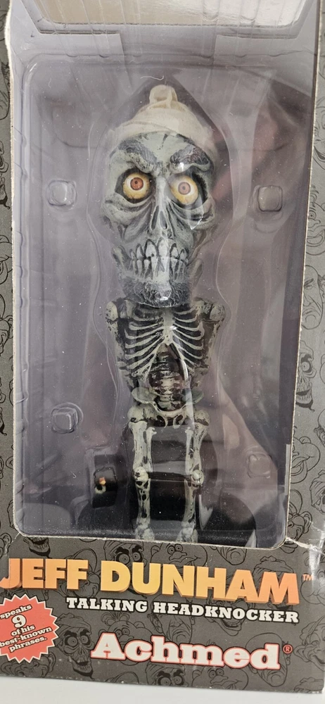 Experience the quirky humor of Jeff Dunham's "Achmed" Talking Headknocker from NECA. This collectible 3” wide x 7.75” tall bobble head doll, released in 2006, features the iconic silent character in a humorous design that perfectly captures the essence of Dunham's comedy. It's a must-have for fans and collectors alike, bringing a touch of laughter to any setting. Crafted with care by NECA, this bobblehead is a true representation of the character Achmed, with attention to detail that brings the figure to life. It's a unique addition to any collection, and a delightful way to celebrate the artistry of Jeff Dunham. Suitable for ages 14 and up, it's a fun gift for collectors or a playful treat for yourself.