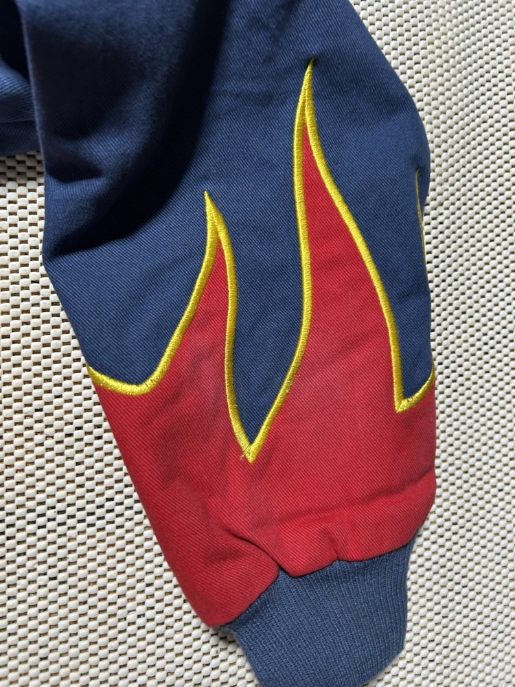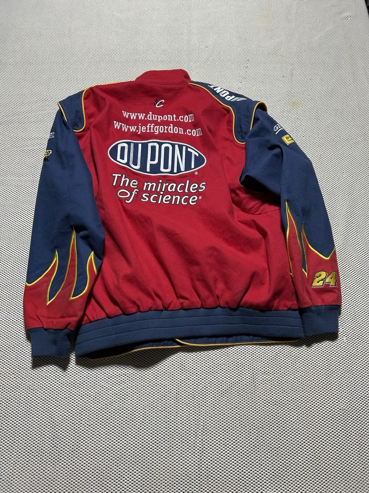The product is a rare Jeff Gordon #24 Dupont Flames Specialty Racing Jacket in men's size large. This jacket features the iconic flames design associated with Jeff Gordon's NASCAR car, making it a unique and sought-after piece for fans of the sport. Made for auto racing enthusiasts, this jacket represents a piece of memorabilia from one of the most popular drivers in NASCAR history.