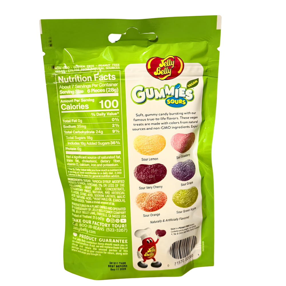 Jelly Belly Gummy Sours – 7 oz Bag | Vegan Sour Gummy Candy Enjoy bold, tangy flavor with Jelly Belly Gummy Sours from Jelly Belly Candy Company . These soft, chewy sour gummies are vegan, made with no animal gelatin, non-GMO ingredients, and colors from natural sources. Flavors: Lemon, Strawberry, Very Cherry, Grape, Orange, Green Apple. Product Highlights: • 7 oz factory-sealed bag • Vegan – no animal gelatin • Non-GMO • Colors from natural sources • Sweet and sour fruity flavors • Soft, chewy texture • Ships fast and carefully packaged Perfect for sour candy lovers who want a plant-based gummy option without sacrificing flavor. Order today and enjoy premium Jelly Belly quality in every bite.
