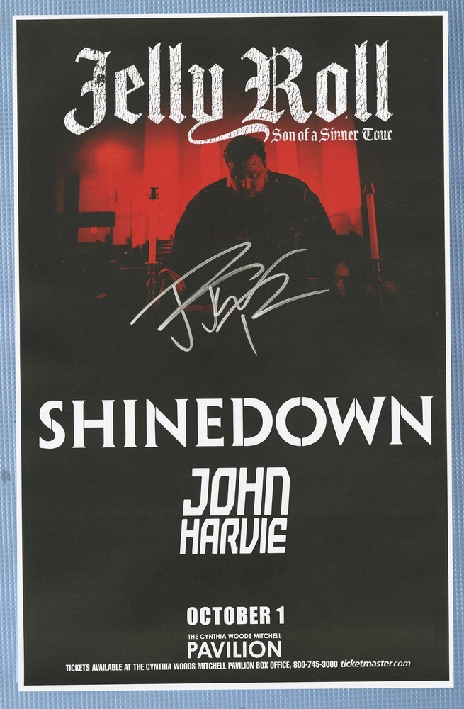 Jelly Roll, Shinedown, John Harvie Son of a Sinner Tour 2022 concert poster Woodlands, TX Signed by Jelly Roll after the show Size 11" x 17"