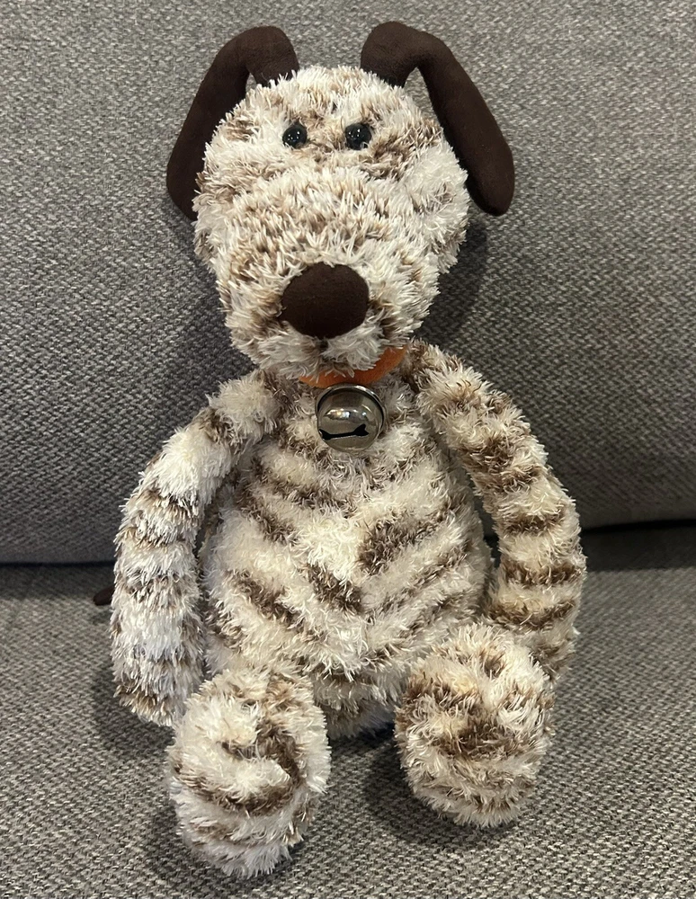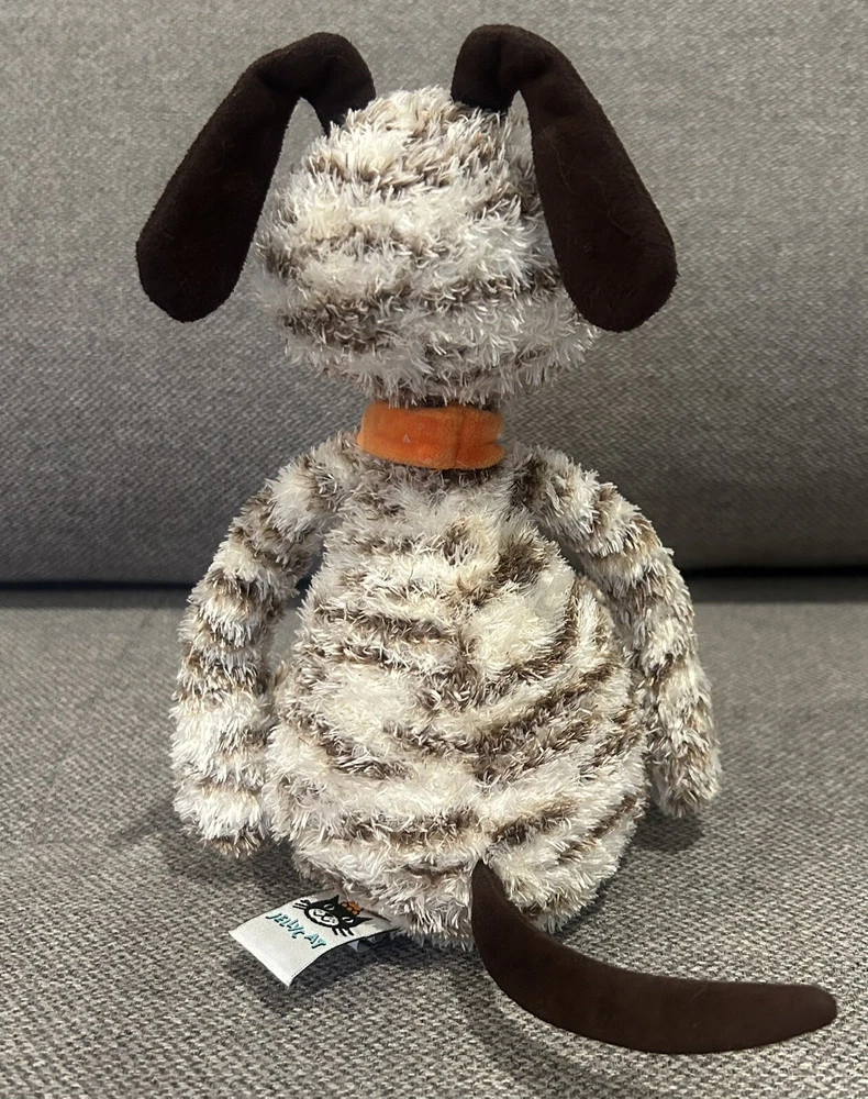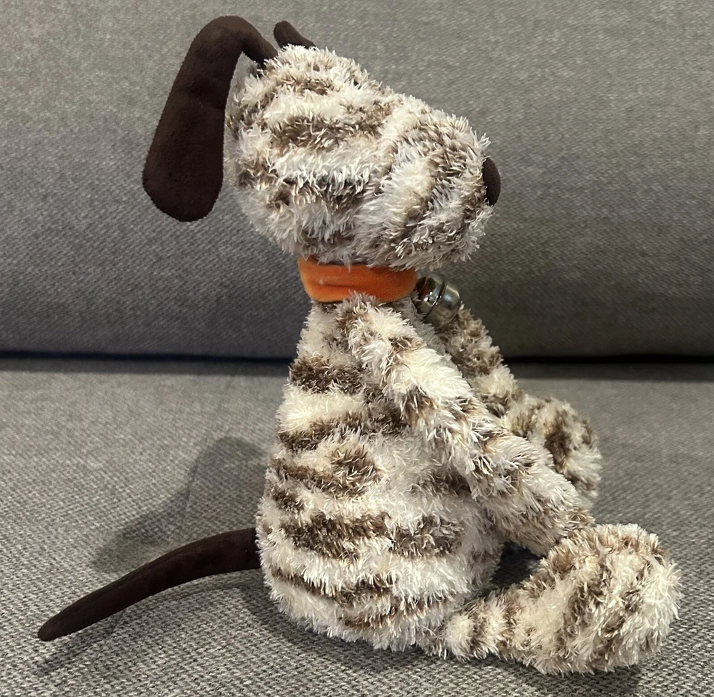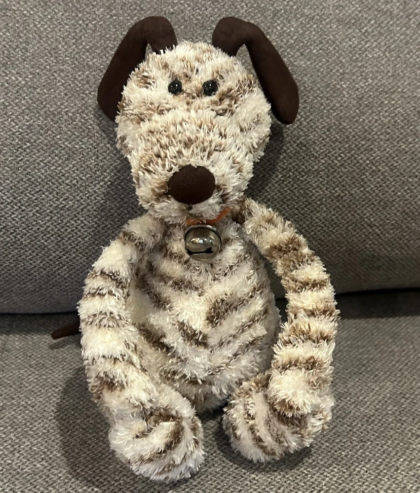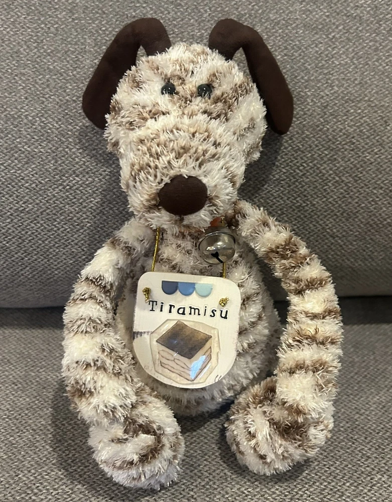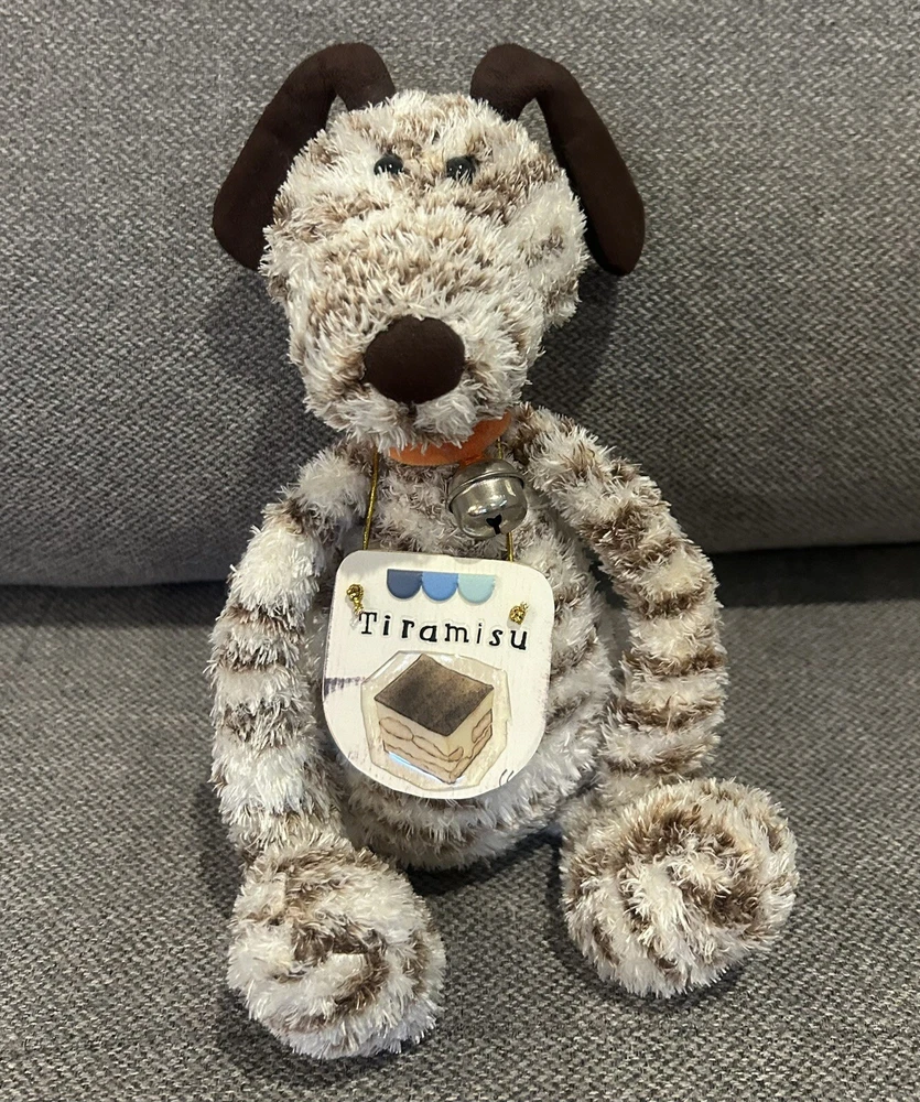 Very good used condition. Bum tag only. Velvet collar and bell are in good shape. Super rare and retired This Jellycat Ciao Bella Tiramisu Dog Puppy is a must-have for any stuffed animal collector. With its adorable stripes and brown cream color, it is sure to bring a smile to your face. The bell on its neck adds an extra touch of cuteness. The brand Jellycat is known for their high-quality stuffed animals, and this one is no exception. It is small in size, measuring between 6-14 inches, making it perfect for cuddling and playing with. Add this rare find to your collection today!