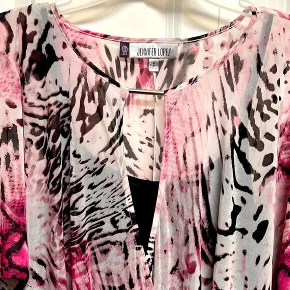 Elevate your wardrobe with this stunning Jennifer Lopez blouse featuring a unique pink and black abstract print. The blouse has a V-neckline and 3/4 dolman sleeves, making it perfect for any occasion, whether it's a casual day out or a fancy party. The lightweight, stretchy material with a shearling fabric type ensures a comfortable fit, while the collarless design and pullover closure add a touch of convenience. This blouse is perfect for the summer, fall, or spring seasons and can be easily paired with any bottom, whether it's jeans, a skirt, or shorts. The blouse is hand wash only and comes in size S. With its hipster, designer, and colorful theme, this blouse is a must-have for any fashion-forward woman. Very good pre owned condition mesh Shell 100% sheer polyester jersey Shell 95% polyester 5% spandex lining 95% polyester 5% spandex 16’ across chest inside top 16.50’ across bottom band side gathers 27’ long from collar seam to bottom front elastic around end of sleeve