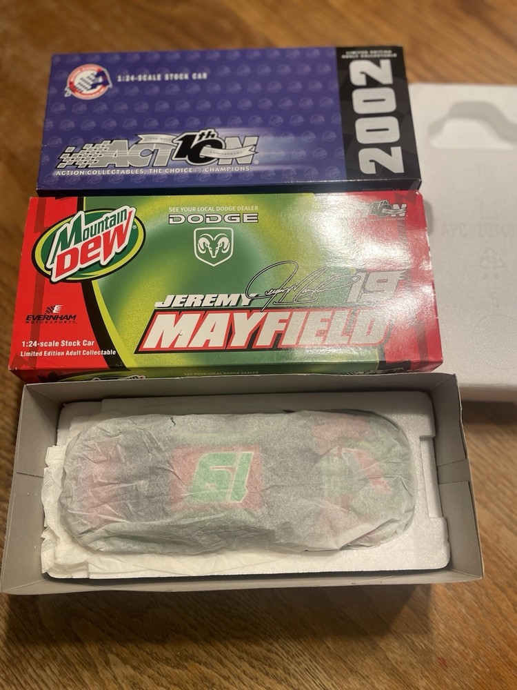 The product is a 1:24 scale diecast model of Jeremy Mayfield's #19 Dodge Dealers Mountain Dew 2002 Dodge Intrepid NASCAR racecar. It is a green-colored replica of the actual racing car driven by Mayfield during the NASCAR races. The model is a bank, which suggests it has a slot for storing coins. Produced by Action, this collectible item is part of the "Cars" character family and is made in China. It is suitable for ages 17 years and up.