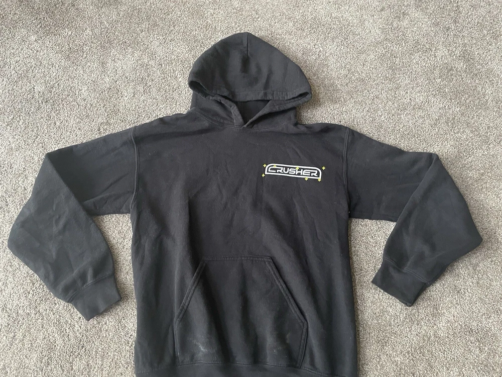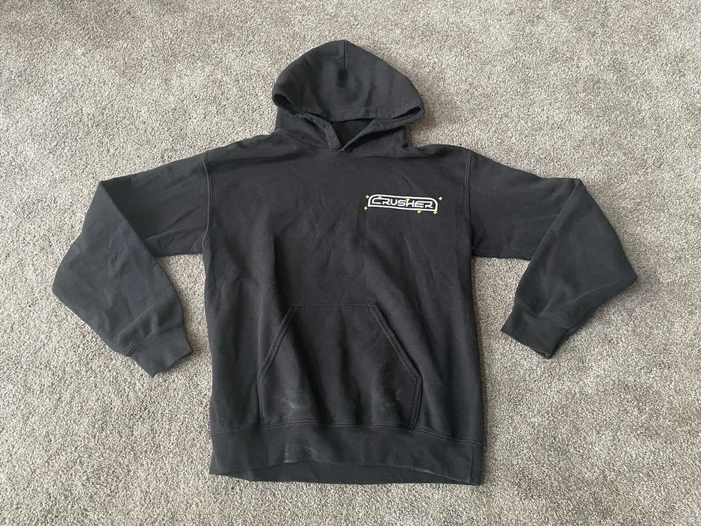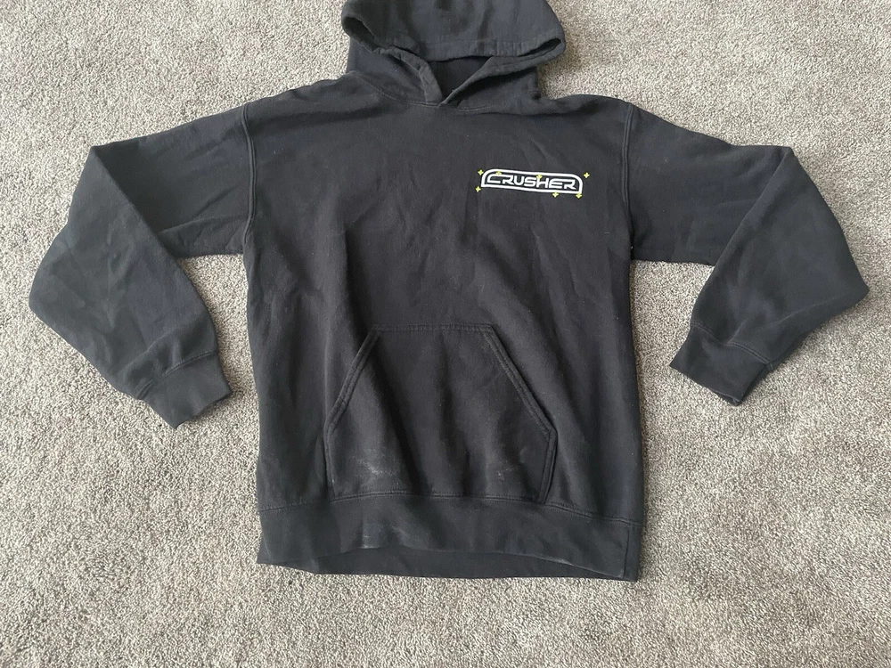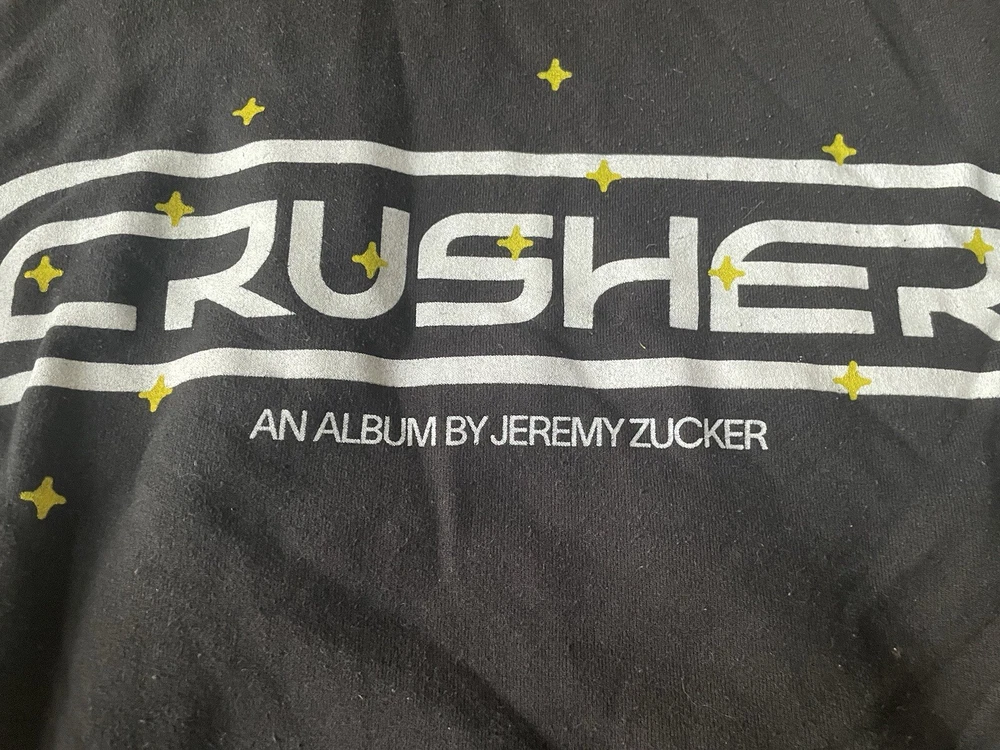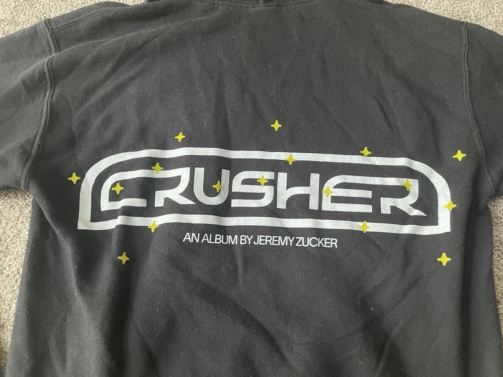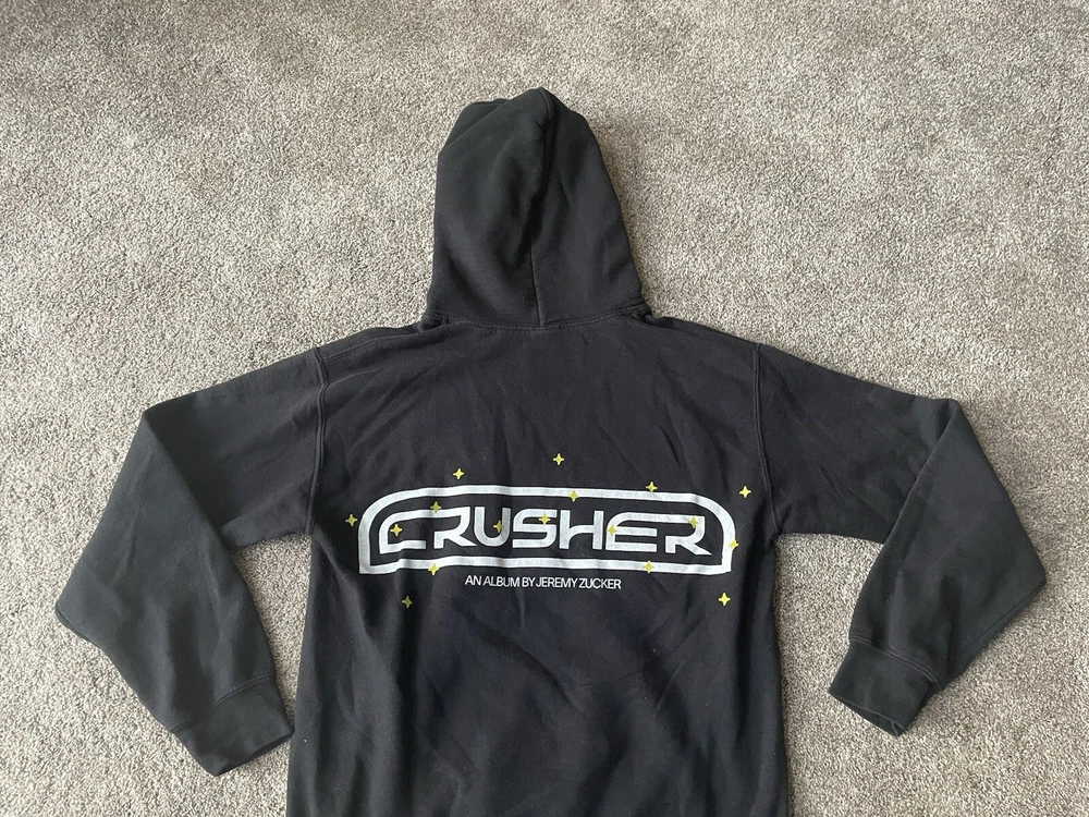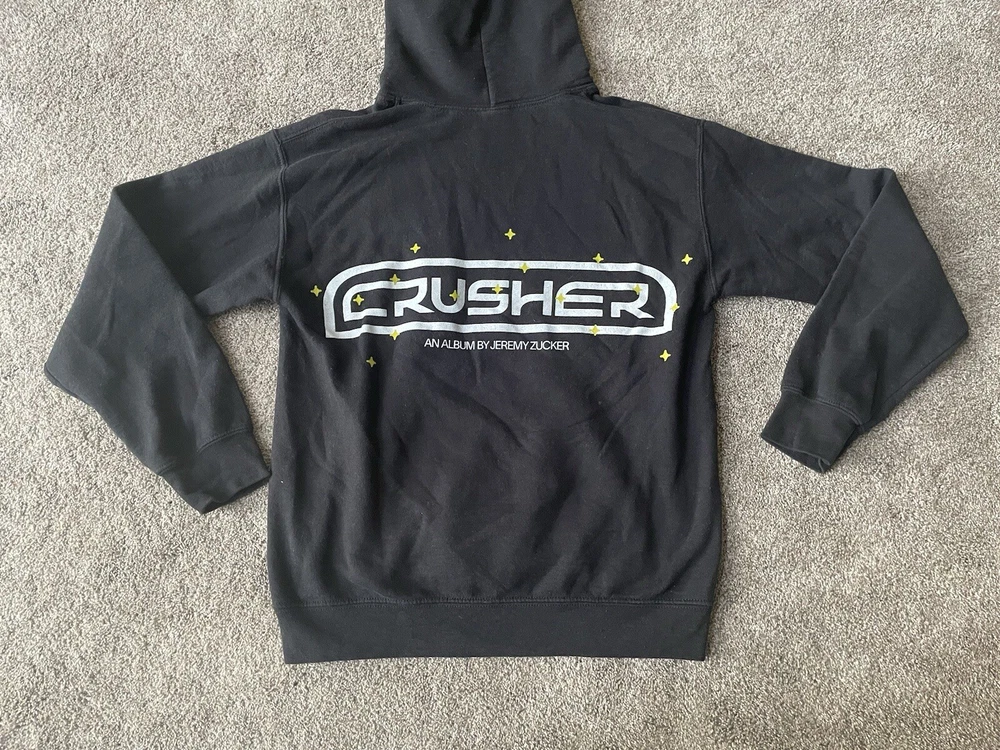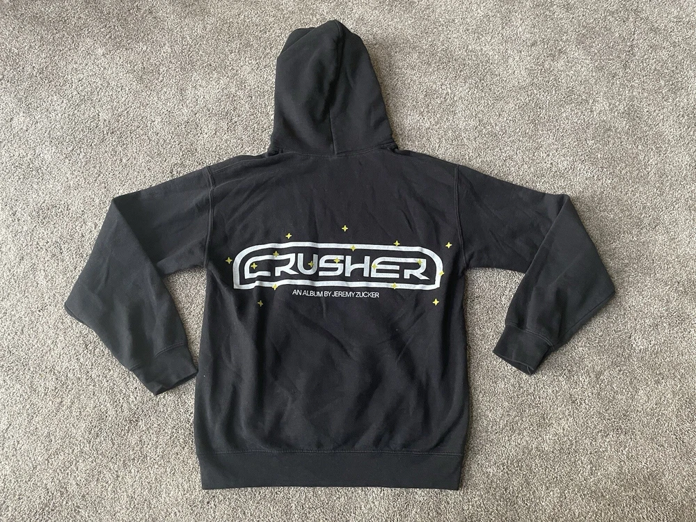 Show off your love for Jeremy Zucker with this black hoodie from his Crusher Album collection. This long-sleeved pullover hoodie features a graphic print of his logo and is made of a comfortable blend of polyester and cotton fleece fabric. It is machine washable and perfect for winter, fall, and spring seasons. The Jeremy Zucker hoodie comes in size small and is a regular fit for men. It is ideal for various activities like walking, skateboarding, hiking, and running & jogging. This hoodie is perfect for fans of pop music, bands, and concert tours. Get your hands on this stylish hoodie today!