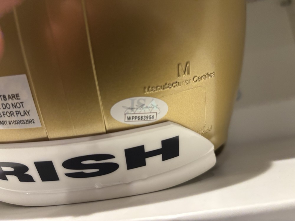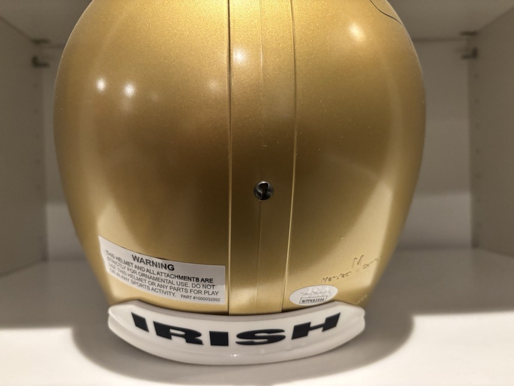 Showcase your passion for football and the legendary Jerome Bettis with this autographed Notre Dame Fighting Irish Riddell VSR4 Replica Helmet. A must-have for collectors and fans alike, this helmet proudly sports the signature of the famed fullback, adding an authentic touch to your sports memorabilia collection. Authenticated by James Spence Authentication (JSA), you can be confident in the genuineness of this prized possession. Celebrate the spirit of the Notre Dame Fighting Irish and the impact of Bettis on the field with this replica helmet. While it's not a game-used item, the autograph serves as a tangible connection to the player and the sport, making it a standout addition to any collection. This piece is not framed, allowing you to display it prominently in your home or office.
