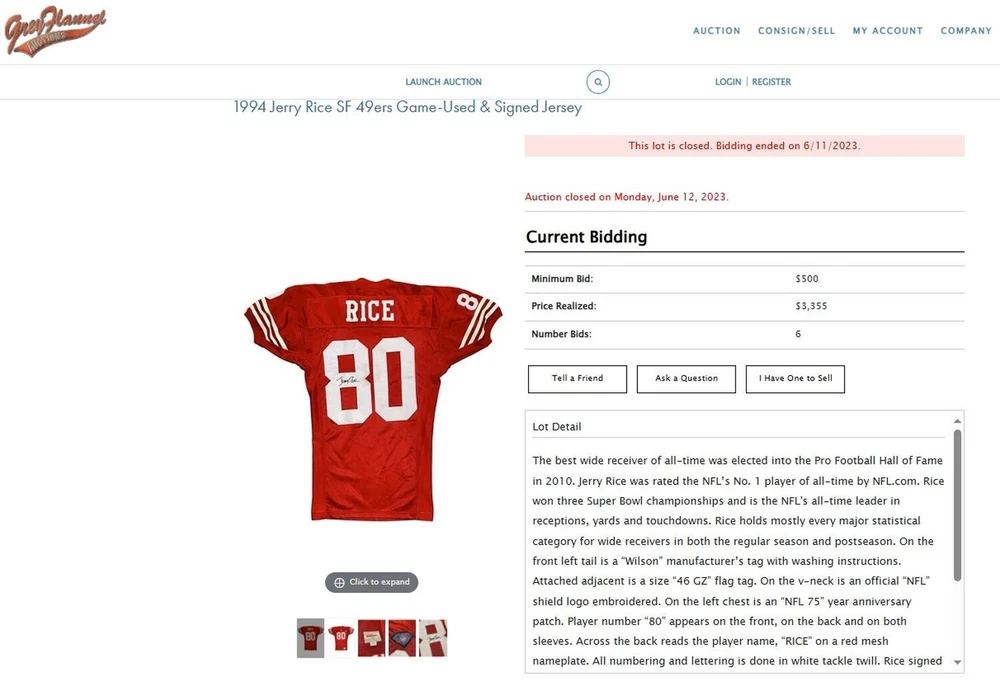 Jerry Rice San Francisco 49ers Game Worn & Signed Jersey, JSA & Grey Flannel COA