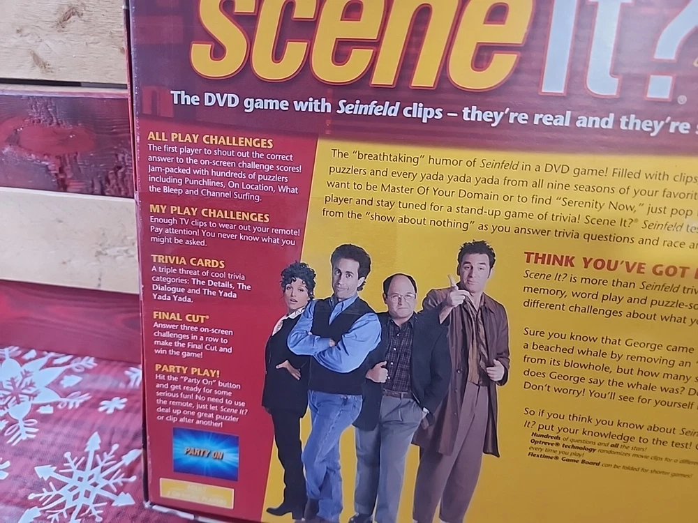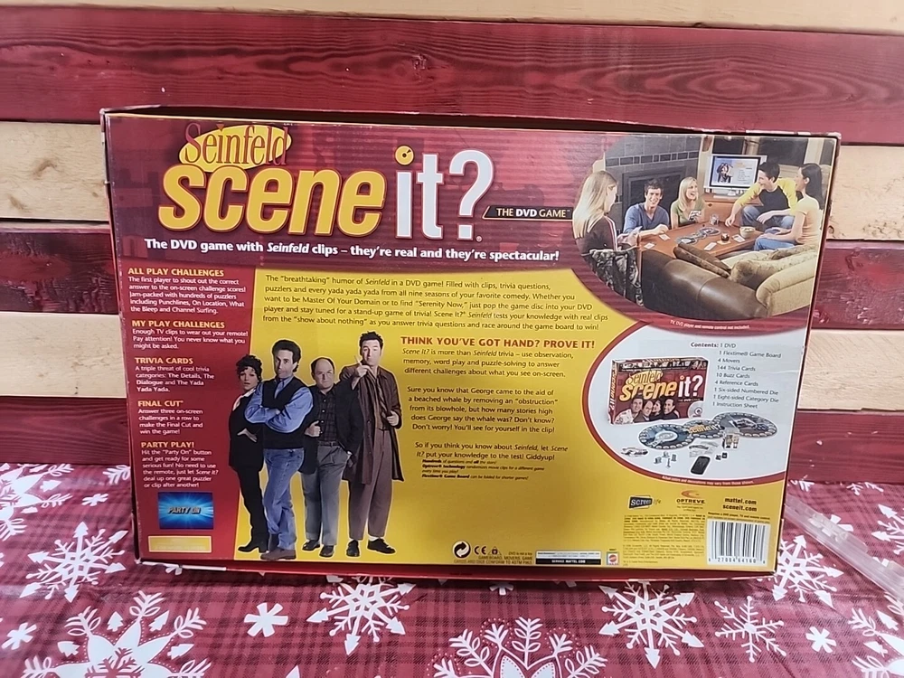 Get ready to put your Seinfeld knowledge to the test with this factory-sealed DVD game. With Jerry Seinfeld as the host, Scene It? The DVD Game is a complete board game that includes a DVD with over 1,000 questions about the beloved TV show. The game is perfect for adults and includes players aged 8-11 years old. The game features questions from all seasons of Seinfeld and includes a Christmas gift. This Mattel-produced game is an excellent addition to any Seinfeld fan's collection. Buy now and see if you can answer all the questions correctly!