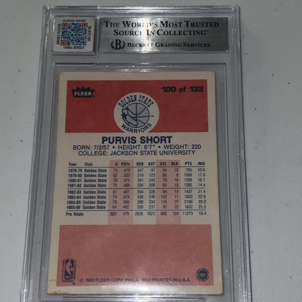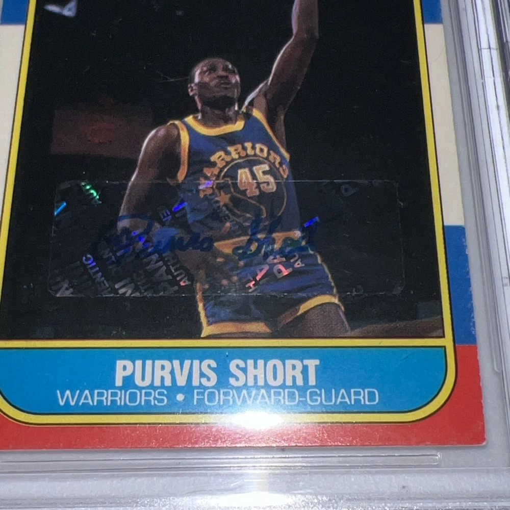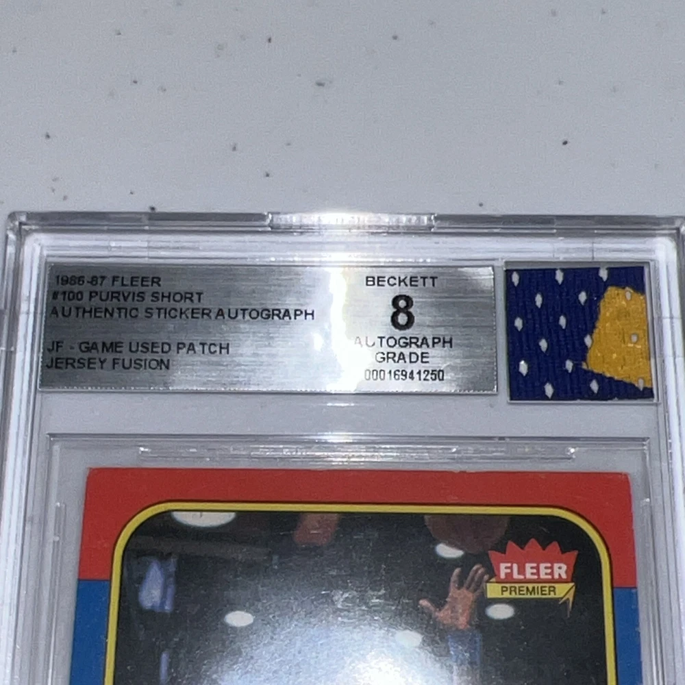This is a 1986-87 Fleer basketball trading card featuring Purvis Short of the Golden State Warriors. The card is a part of the base set and includes a piece of memorabilia in the form of a patch. It has been autographed by Short and authenticated by Beckett Authentication Services (BAS). The card is in good condition and has a Beckett autograph grading of 8.