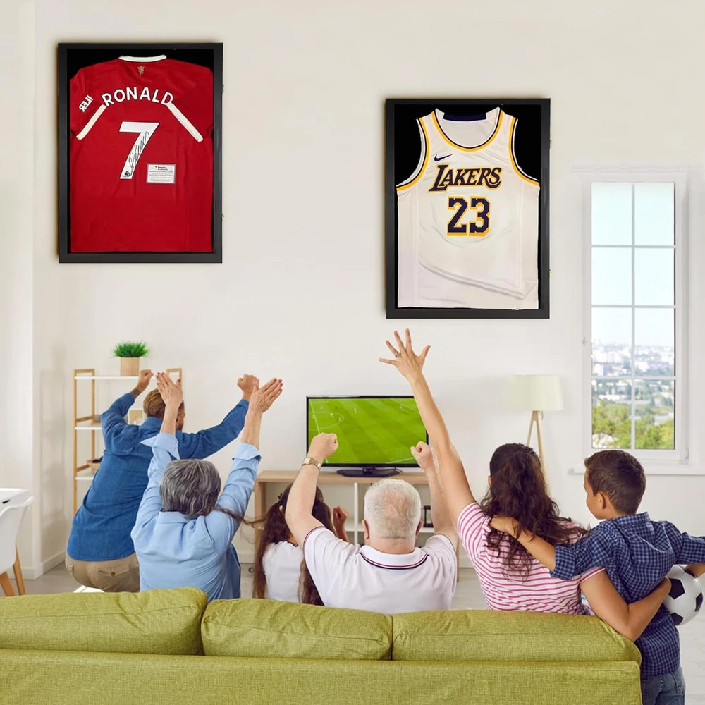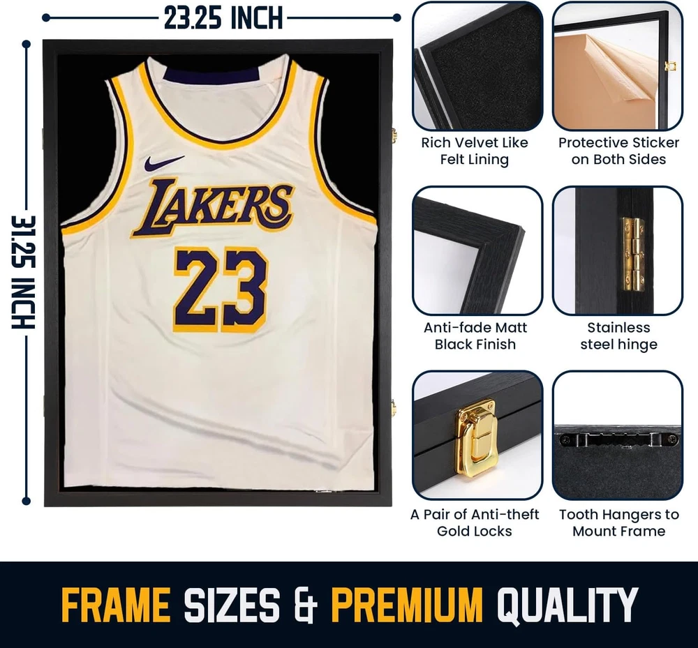 Engineered Wood One Size Fits All- Large size display frame of 31.25" x 23.25" x 1.5" fits most sports jerseys,Make it a perfect gift for sports fans! It can also be used as a shadow box to display military uniform, graduation memorabilia and other cherish memories. Three Ways To Display-Two style wooden hangers is perfect for hanging your sleeveless commemorative jersey. The Pin board is great for stretching out your short or long-sleeved jersey.(Note:Jersey not include) Multi-Function Display Case- You can display your Hockey Baseball Basketball Football Soccer Tennis Marathon Sport Shirt,or military uniform,t-shirt,baby souvenir clothes,graduation memorabilia and other cherish memories. Great Gift Ideal For Sport Lovers-Football jersey frame really a great gift for jersey enthusiast to well display their t-shirt and Collector Autograph jersey and show them to their family and friends. And it is also a stylish decoration for home and office.Jersey display frame can be a gift for Christmas, Valentine's Day, Thanksgiving, Veterans Day. PROTECT COLLECTIBLES-jersey frames won't turn yellow over time and always offer ultra clear viewing.One size fits all sports jersey of baseball, basketball,football,soccer,hockey,jerseys. The large show box can display flag,uniforms, graduates items, sports souvenirs,collectibles and memorabilia. Product description