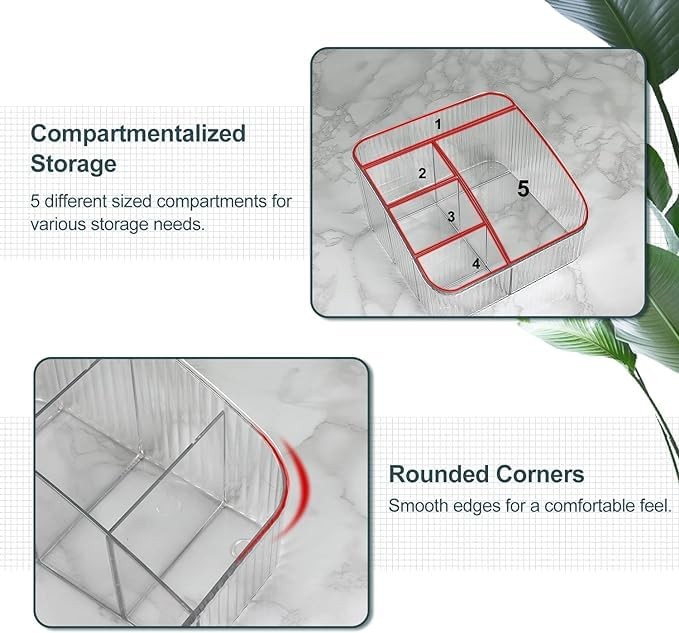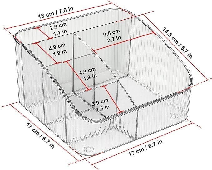 Description JessLab engages in providing premium products to customers. We provide 12 months limited warranty and promise for excellent customer service. Please do not hesitate to contact us for any questions or concerns. We are always here to assist. Overall Dimensions (L x W x H): 7.1 x 7.1 x 3.9 inches; 5 compartments of various sizes and spaces for efficient storage, accommodating makeup brushes, eyeshadow palettes, lipsticks, and other cosmetics according to your needs Highly transparent design allows for easy visibility of the products in each compartment, enabling quick identification and selection Constructed with durable and high-quality PET material, ensuring longevity; smooth surface facilitates effortless cleaning and maintenance; simply wipe with a damp cloth Sleek and stylish design featuring stripes and rounded corners, combining functionality with elegance, making it an attractive addition to your vanity or bathroom countertop Versatile use for storing and organizing makeup brushes, lipsticks, eyebrow pencils, skincare products, as well as office supplies, tools, stationery, jewelry, and more