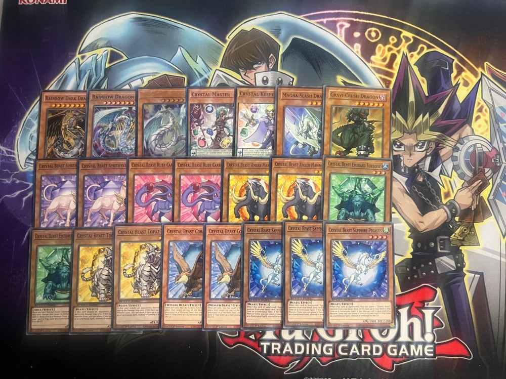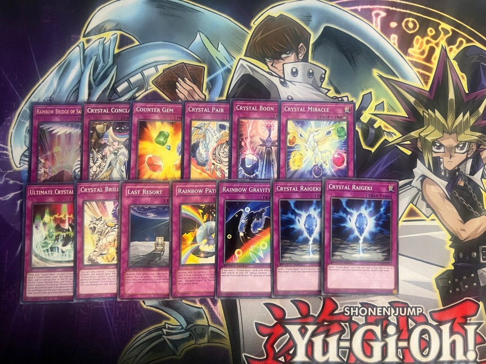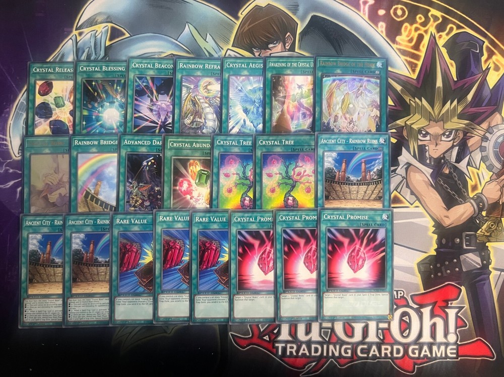 Hello! You are purchasing the deck list below, the cards will be English, real, and near mint to light play condition at worst. All decks are built with the lowest rarities for cards in mind to keep the price of the deck low and affordable for all duelists! Some cards may be in speed duel printing if this is the cheapest available copy of the card, but do not worry these are real cards and legal for tournament use! Purchase with confidence and safety! As an added bonus one pack of card sleeves will be included with your deck! Thanks again and good luck dueling! Now here's the decklist; Monsters: 1| Rainbow Dark Dragon 1| Rainbow Dragon 1| Crystal Beast Rainbow Dragon 1| Gravi-Crush Dragon 1| Magna-Slash Dragon 1| Crystal Keeper 1| Crystal Master 2| Crystal Cobalt Eagle 2| Crystal Beast Topaz Tiger 2| Crystal Beast Emerald Turtoise 2| Crystal Beast Amber Mammoth 2| Crystal Beast Ruby Carbuncle 2| Crystal Beast Amethyst Cat 3| Crystal Beast Sapphire Pegasus Spells; 1| Rainbow Bridge of the Heart 1| Awakening of the Crystal Ultimates 1| Crystal Aegis 1| Rainbow Refraction 1| Crystal Beacon 1| Crystal Blessing 1| Crystal Release 1| Crystal Abundance 1| Advanced Dark 1| Rainbow Bridge 1| Crystal Bond 2| Crystal Tree 3| Crystal Promise 3| Rare Value 3| Ancient City - Rainbow Ruins Traps: 1| Rainbow Gravity 1| Rainbow Path 1| Last Resort 1| Crystal Brilliance 1| Ultimate Crystal Magic 1| Crystal Miracle 1| Crystal Boon 1| Crystal Pair 1| Counter Gem 1| Crystal Conclave 1| Rainbow Bridge of Salvation 2| Crystal Raigeki Extra Deck: 1| Gaia Saber, The Lightning Shadow 1| Abyss Dweller 1| Castel, The Skyblaster Musketeer 1| Daigusto Emeral 1| Number S39: Utopia The Lightning 1| Number 39: Utopia 1| Ultimate Crystal Rainbow Dragon Overdrive 2| Rainbow Overdragon 3| Free Tokens featuring Jesse and his Crystal Beast friends!