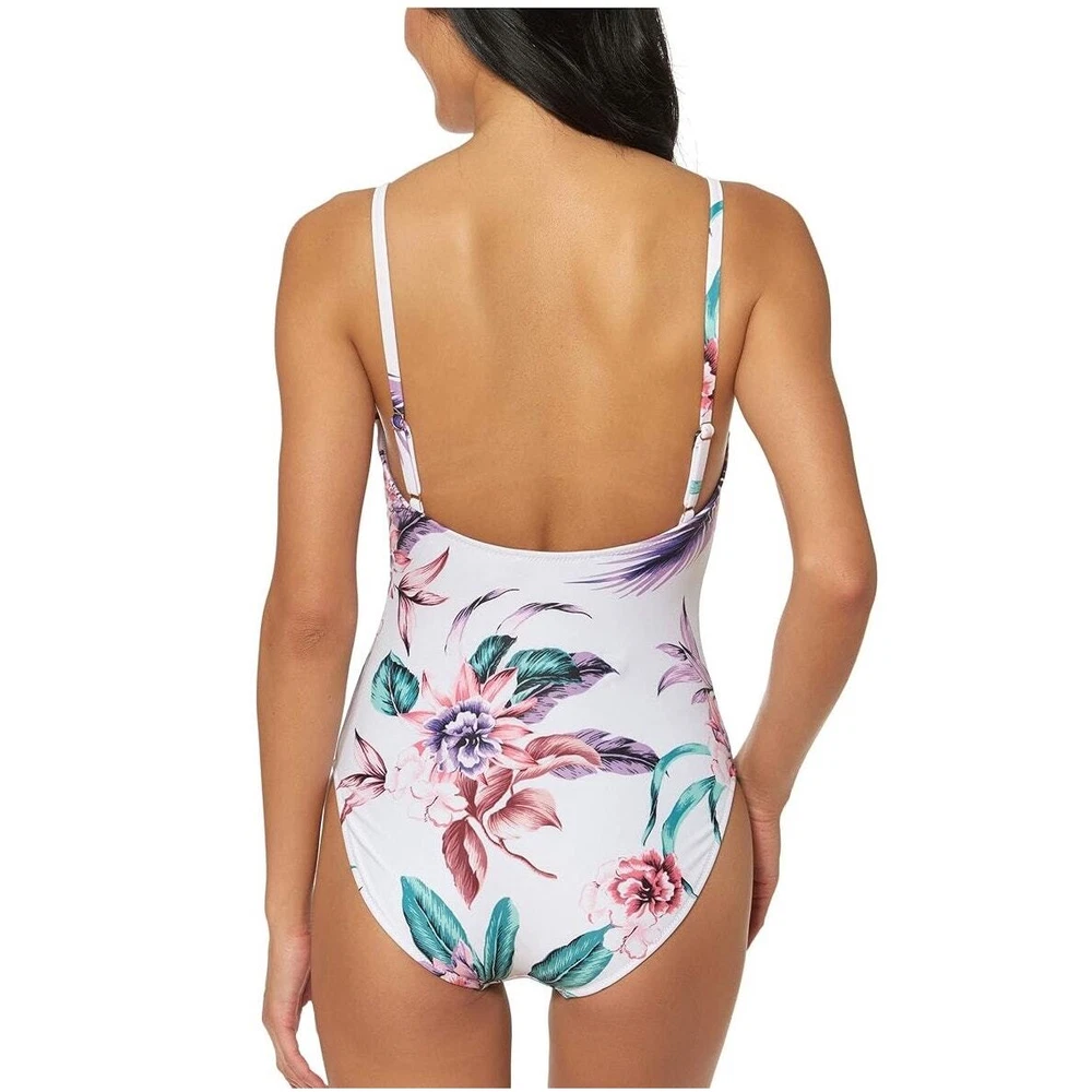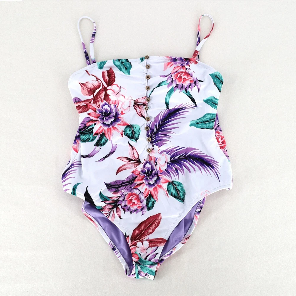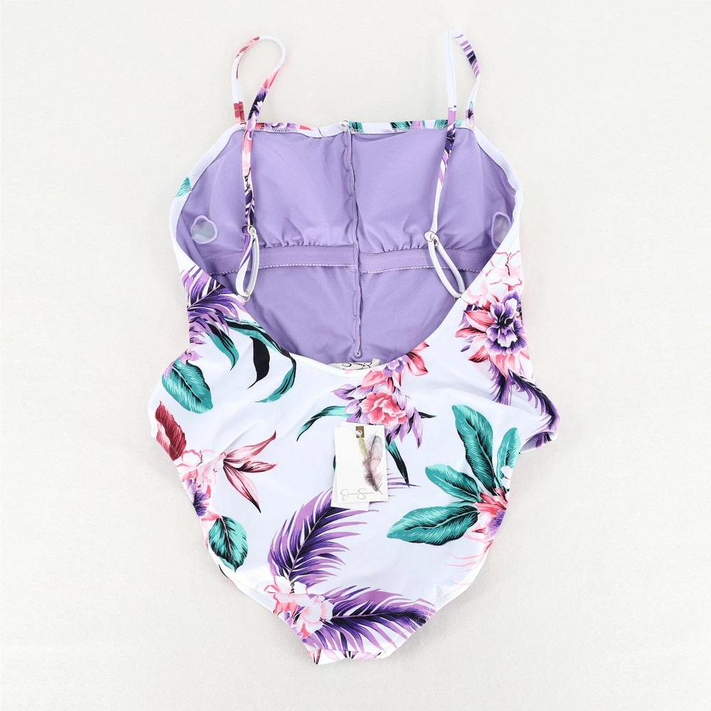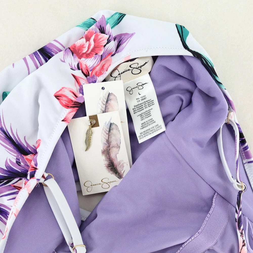 Jessica Simpson Women White/Purple Floral Button One Piece Swimsuit Size L New with tags Tropical floral print Sleek swimsuit with buttons and keyholes at the front Full bottom coverage Functional buttons at front Lined Pull-on styling Adjustable over-the-shoulder straps Removable cups Square neckline Hand wash 84% polyester / 16% spandex