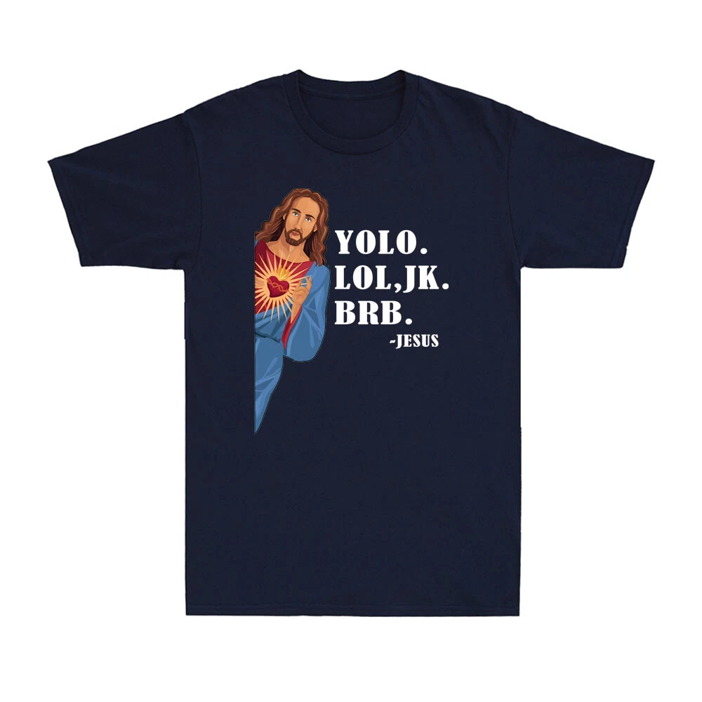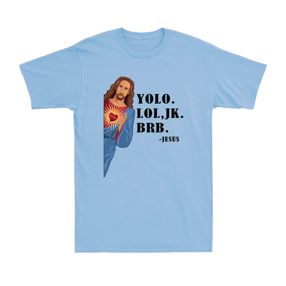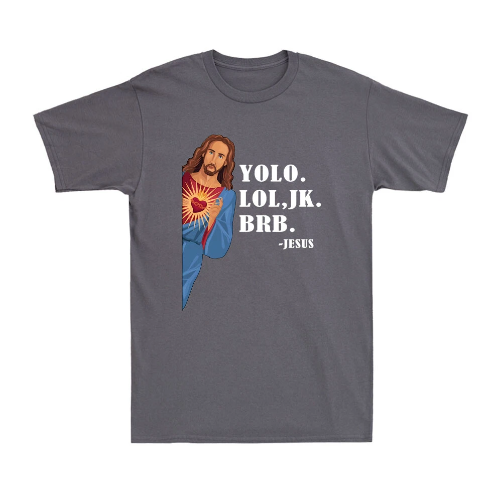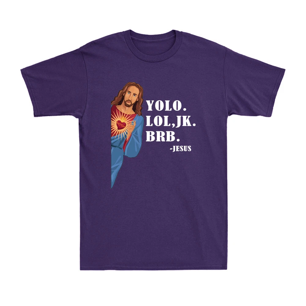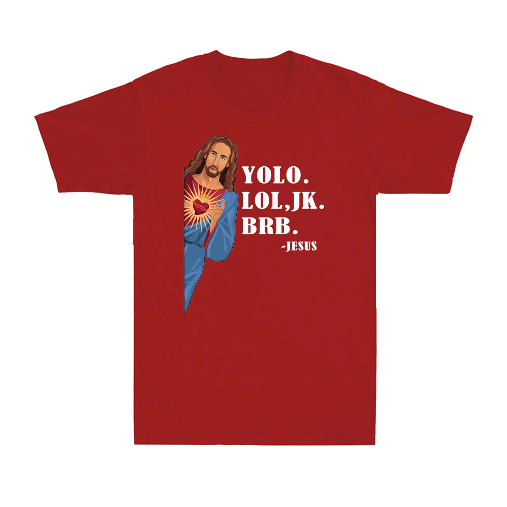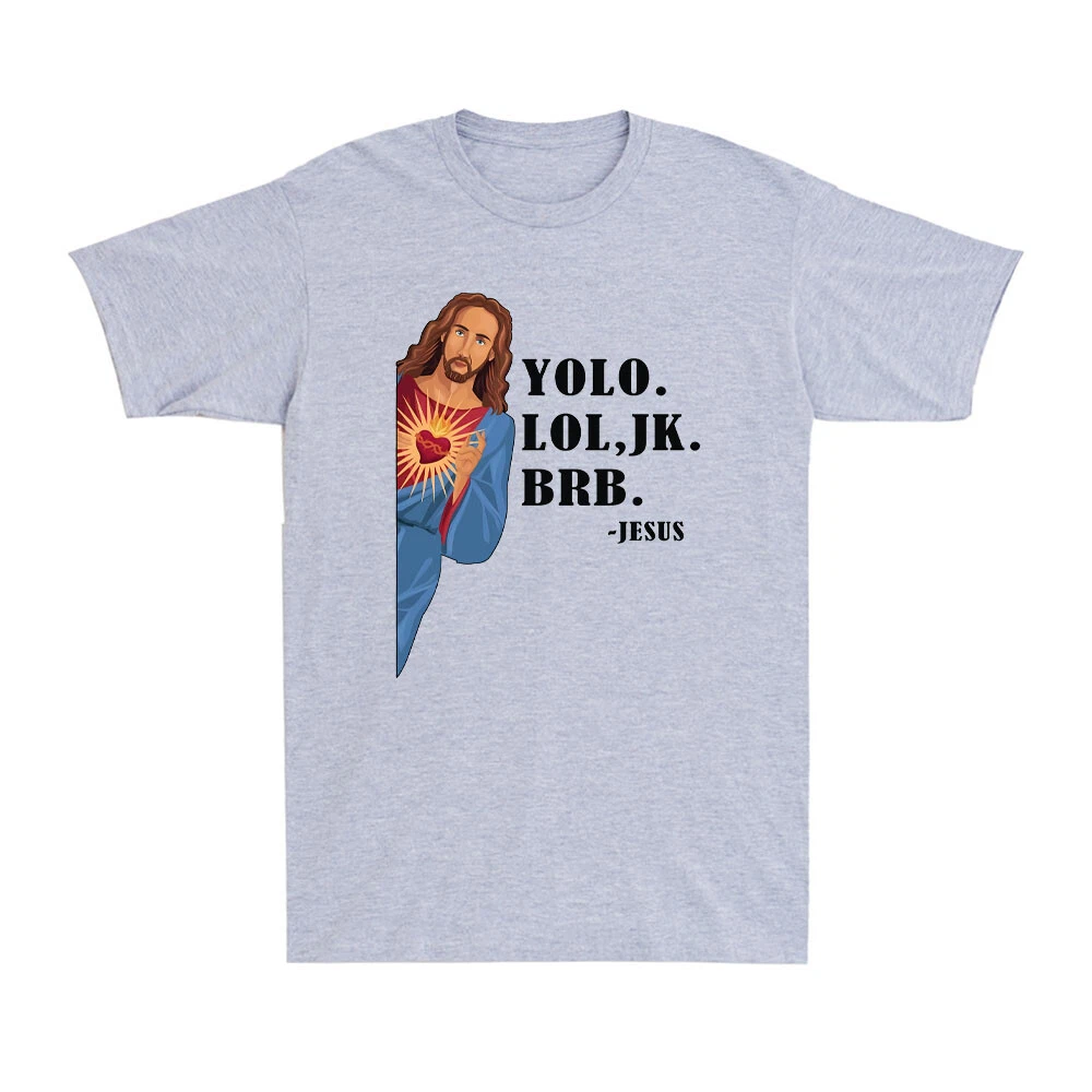 Jesus Yolo LOL JK BRB Funny Jesus Christian Religious Humor Meme Men's T-Shirt Our products are 100% cotton garments and satisfaction is guaranteed. All our garments are comfortable, top quality apparel. Shipment : All shipments will be provided a tracking number Orders are fulfilled in 2 business day Detail Size: Chest Length Sleeve XS 94CM / 37" 66CM / 26" 18.5CM / 7.3" S 100CM / 39.5" 68CM / 27.1" 19.5CM / 7.7" M 105.5CM / 41.5" 72CM / 28.4" 19.5CM / 7.7" L 110.5CM / 43.5" 74CM / 29.1" 20CM / 7.9" XL 115.5CM / 45.5" 76CM / 30" 20.5CM / 8.1" XXL 120.5CM / 47.5" 79CM / 31.1" 20.5CM / 8.1" XXXL 128CM / 50.4" 83CM / 32.6" 21.5CM / 8.5" XXXXL 140CM / 55.1" 85CM / 33.5" 21.5CM / 8.5" Shipment : All shipments will be provided a tracking number Orders are fulfilled in 2 business day You may pick from the following shipping options: USA Standard SpeedPAK: 7-14 business days delivery Expedited Shipping: 3-5 business days delivery Worldwide 10-24 business days delivery Payment: We accept Paypal where you can use all major credit cards. This item requires immediate payment. Your product will begin production immediately. If you require any adjustments to your order, please let us know right away.