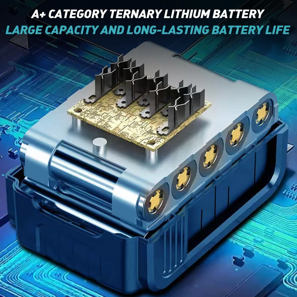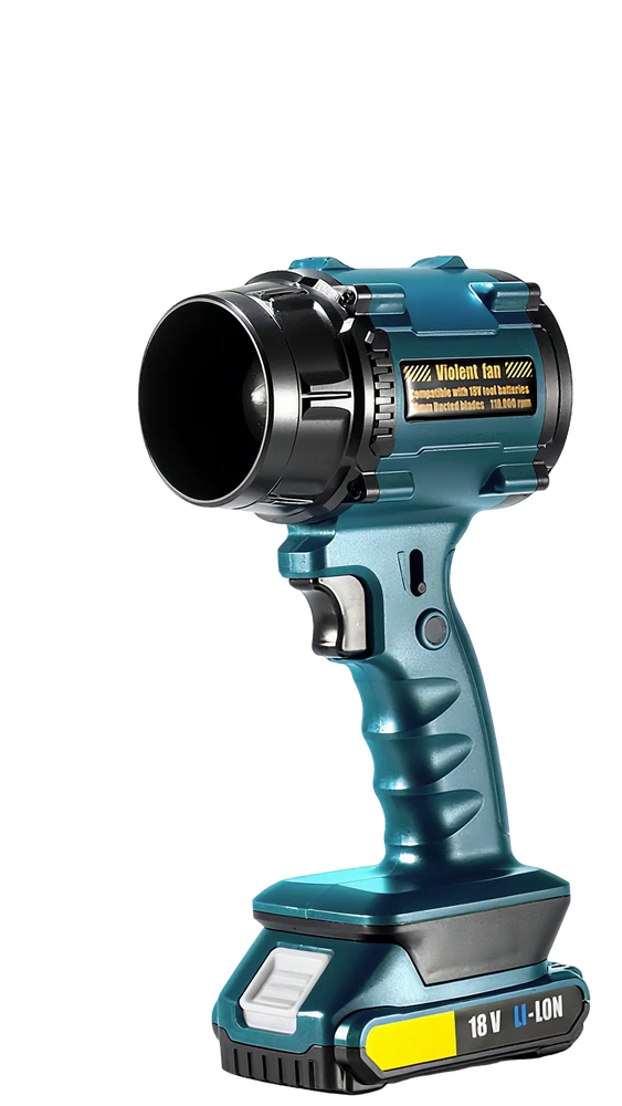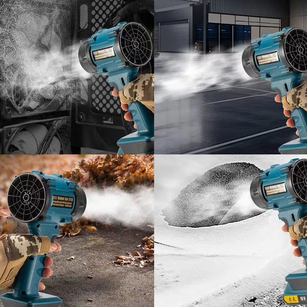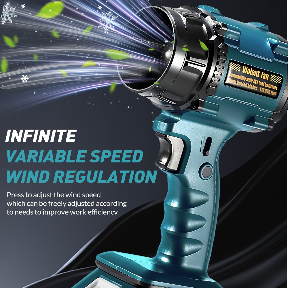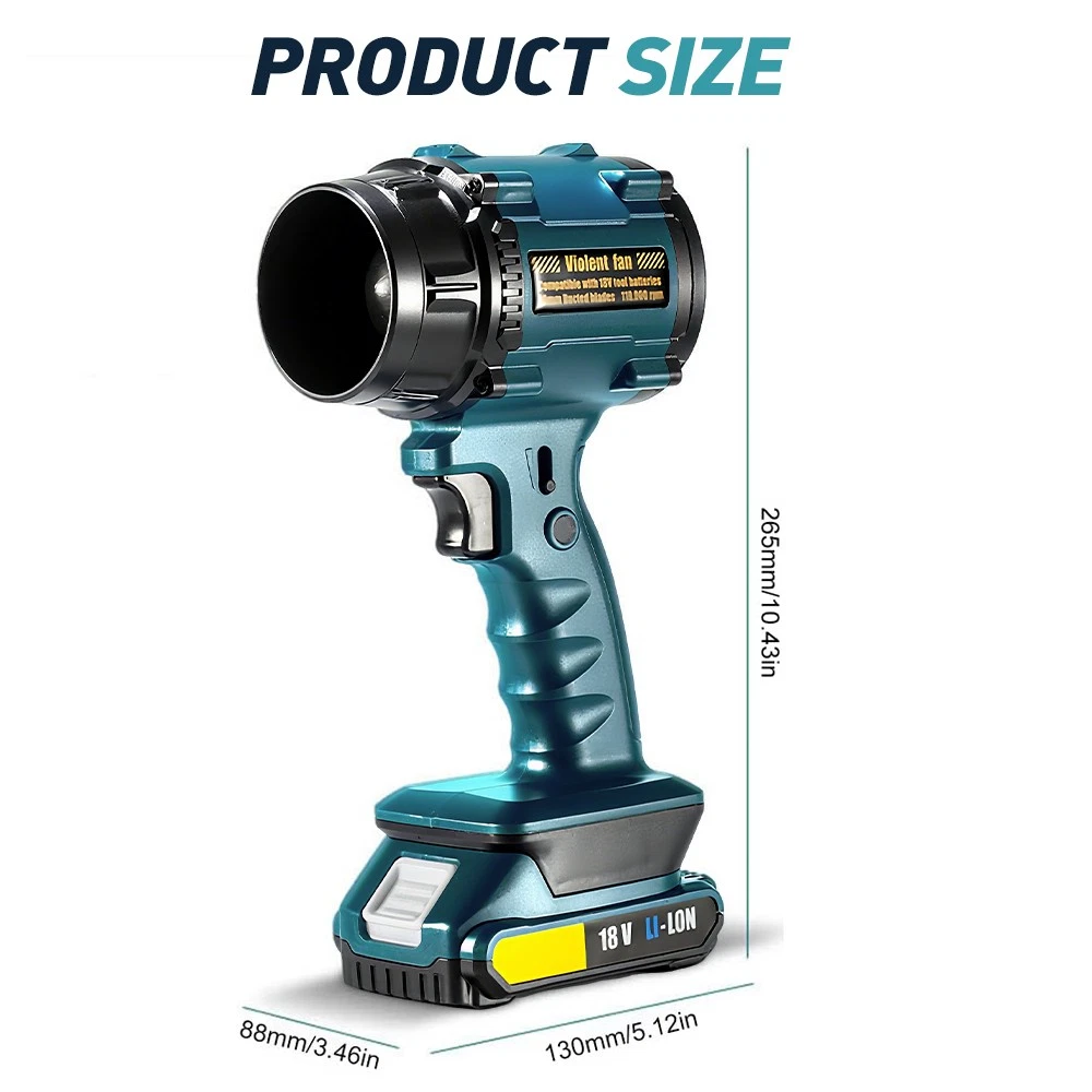 Parameters : Working voltage: 12V Maximum power: approximately 1000W Rated power: 500W Full electric thrust: 600-650G Motor speed: 0-3300/min Maximum speed: 45m/s Function: Turbocharging, continuously variable transmission, 12 blade multi blade fan Battery: 5 battery packs, 5 * 18650 7500mA Product Material: ABS Product size: 135 * 90 * 245mm Color: Blue Accessories: Charging cable