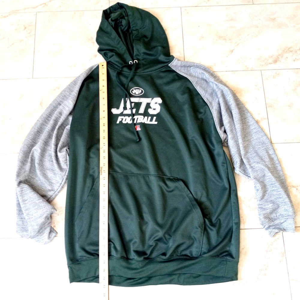 Show your support for the New York Jets with this officially licensed NFL Team Apparel hoodie. Made for men in size 3XL, this green hoodie features the team's logo, making it the perfect addition to any fan's wardrobe. Whether you're catching the game at the stadium or watching from home, this hoodie is sure to keep you warm and comfortable. Made of high-quality materials, it's both durable and stylish. Perfect for any football fan, this hoodie is a must-have for any Jets supporter.
