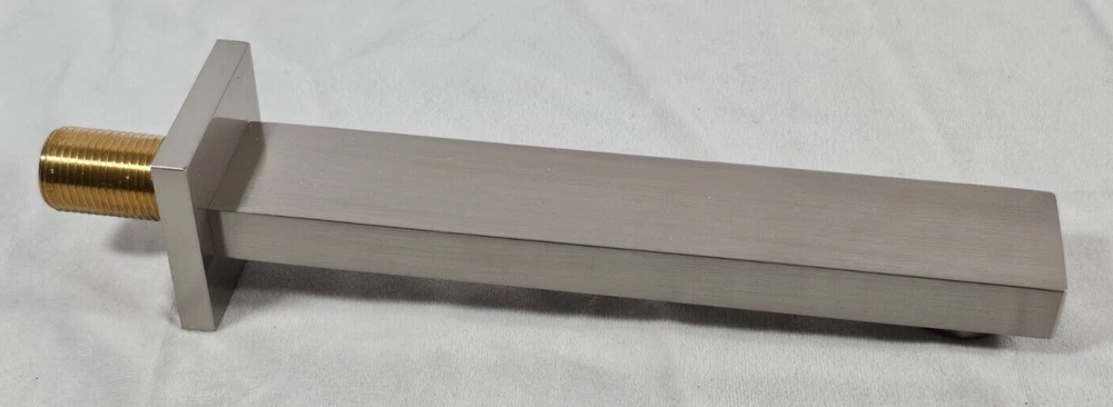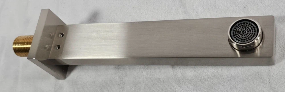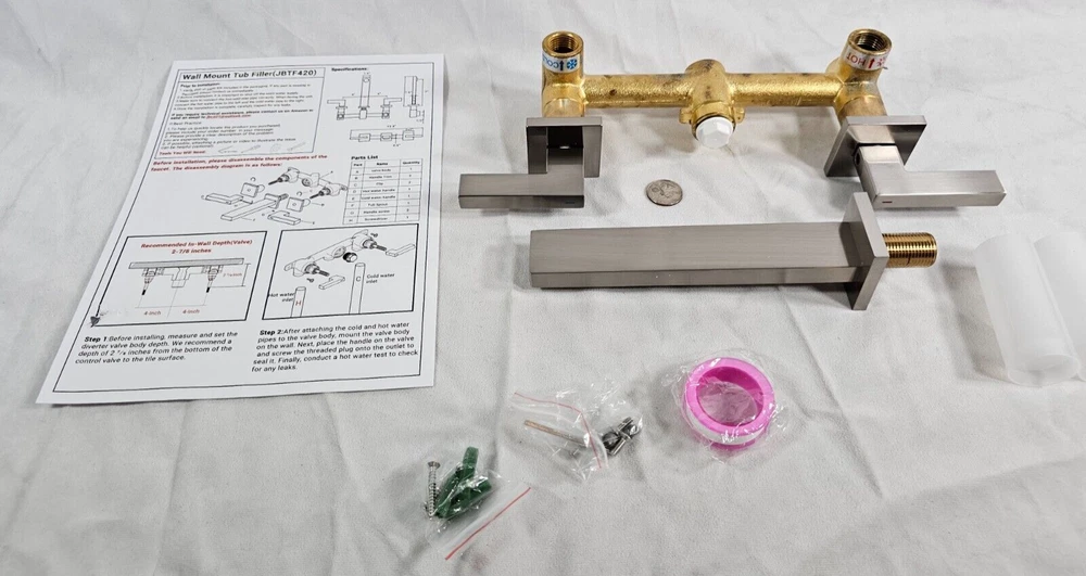 Elevate your bathroom experience with the JetsBath Wall Mount Tub Filler. This elegant bathtub faucet set, finished in brushed nickel, combines modern aesthetics with efficient functionality, featuring a high flow spout and dual lever handles for precise water control. Crafted for durability and luxury, it is an excellent choice for any bathroom renovation. Key Features: High Flow Spout – Enjoy a 6 GPM flow rate at 60 psi, swiftly filling your tub to minimize heat loss with a splash-free aerator-equipped spout. Premium Brass Construction – Made from robust brass with an electroplated finish to prevent corrosion, while surface enamel resists fingerprints and watermarks. Dual Lever Handles – Effortlessly adjust water flow and temperature for a personalized, comfortable bathing experience. Durable Ceramic Cartridge – Leak-resistant brass stem ceramic cartridge ensures longevity and smooth temperature adjustments. Additional Information: Mounting Type : Wall Mount (3-hole installation) Finish Type : Brushed Nickel (tarnish resistant) Spout Reach : 7.08 inches Flow Rate : Maximum 6 GPM Product Dimensions : 9 x 14.56 x 3.14 inches Weight : 4.7 pounds Country of Origin : Hong Kong Quarter in photo used for scale.