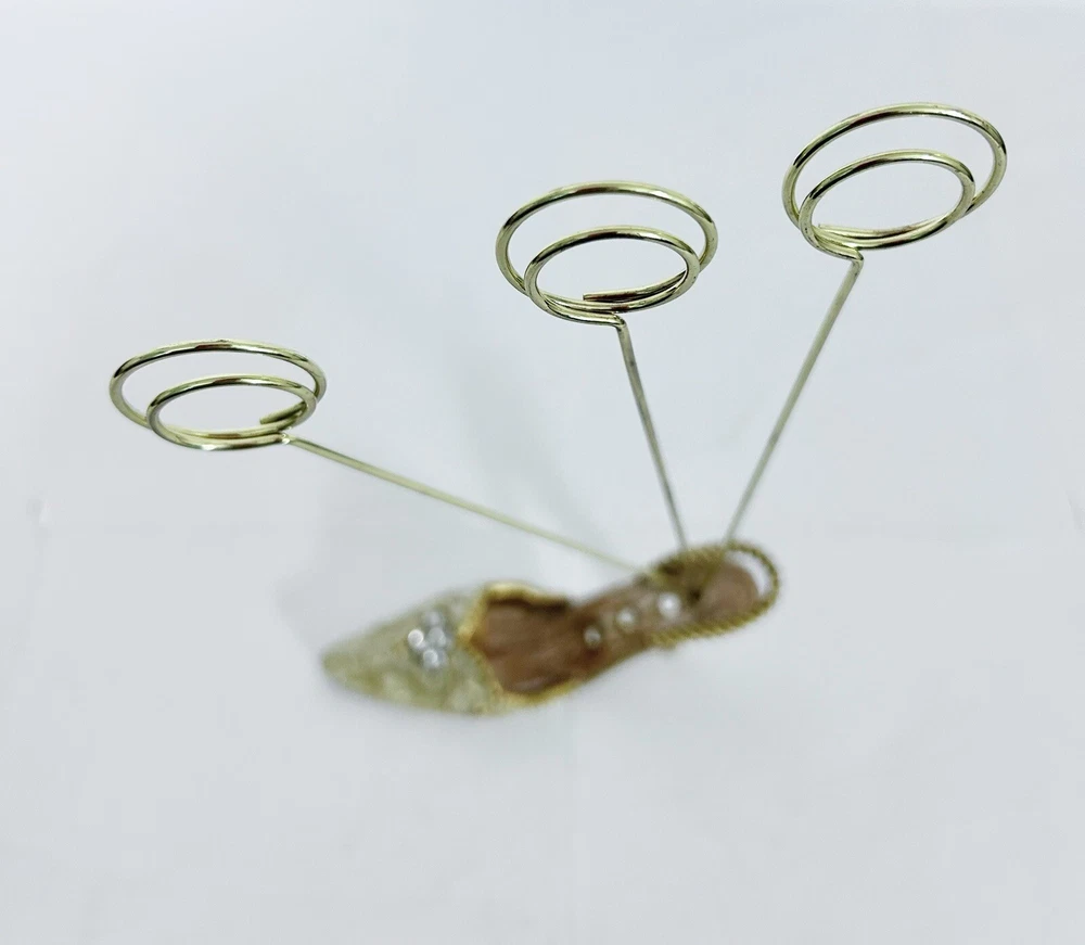 Like new gold shoe post card or business card holder. Measures 7 3/4” tall x 4 1/2” at the widest.