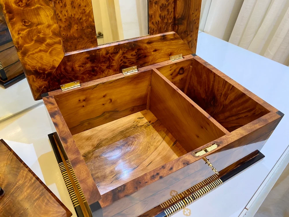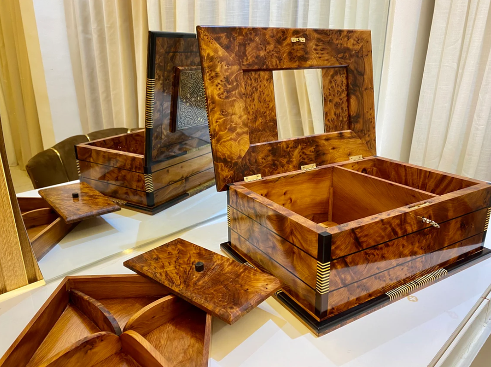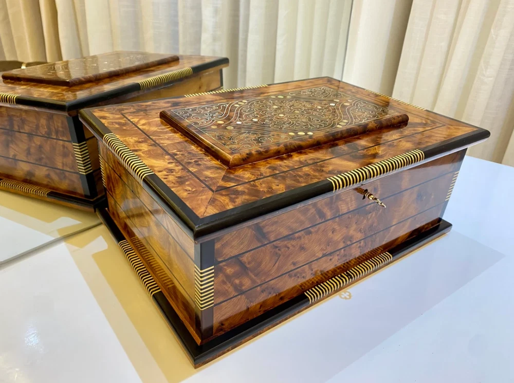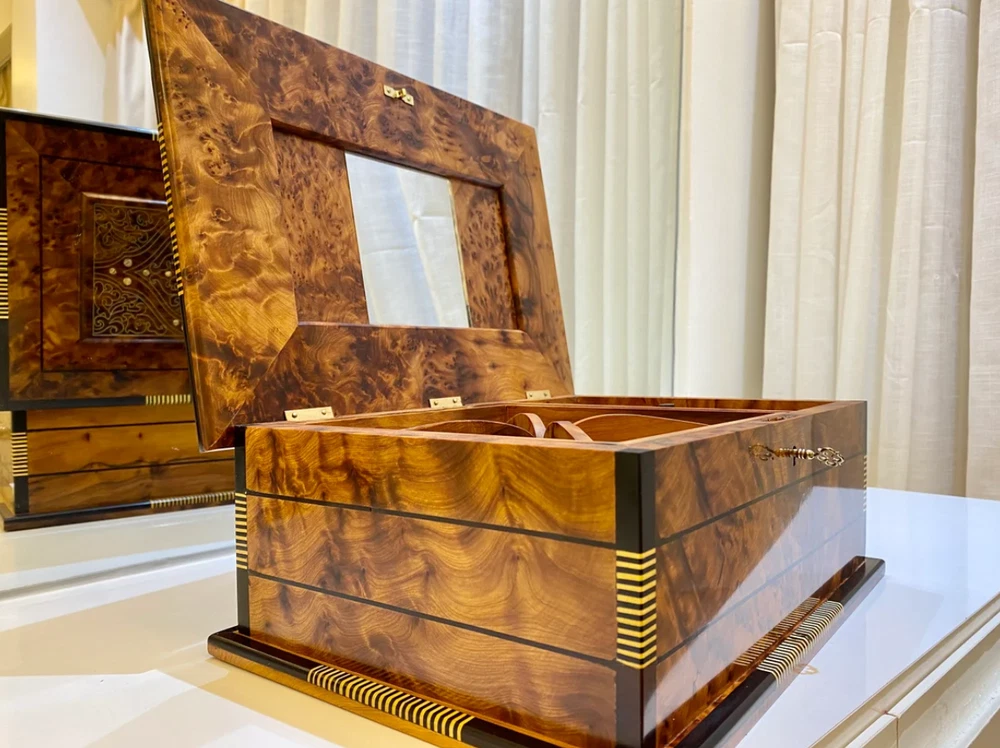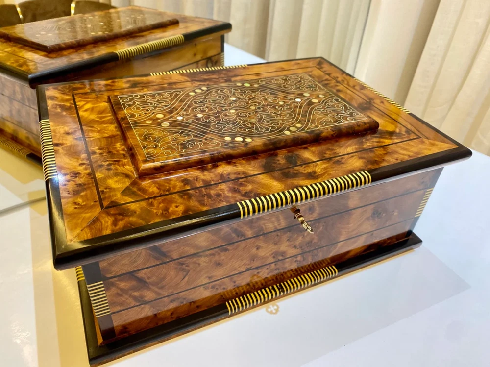 Discover an artistic way to keep your precious items safe and elegantly displayed with the AtlasPerles Jewellery Box. Handcrafted with love by the Maalem, an artisan master, this box combines deep-rooted color, a concentrated aroma, and a fascinating grain to add a perfect touch of artistry to your room decor. Key Features: Unique Craftsmanship: Handmade by Moroccan artisans using skills passed down for over a hundred years. Premium Material: Made from rare Thuya wood found exclusively in the Atlas Mountains of Morocco. Elegant Design: Features large storage space, a removable divider, and a lockable box with a brass key. Intricate Inlays: Decorated with mother of pearls, cedar, and walnut wood. Perfect Gift: Ideal for birthdays, anniversaries, or weddings, this box is a unique gift for him and her. It’s eco-friendly and does not cause environmental damage. Customization: We accept custom orders for engraving/printing text on the lid and offer leather or velvet inside wrapping. Product Specifications: Dimensions: Length: 33 cm - 13 inches Width: 21 cm - 8 inches Height: 12 cm - 4.7 inches Shipping Details: Processing Time: It takes 1 day to ship your order after receiving it. Delivery Time: 3-5 business days using express shipping. Satisfaction Guaranteed: If you're not happy for any reason with our box, feel free to return it. Contact Us: For any information or questions, feel free to contact us, and we will reply as soon as possible.