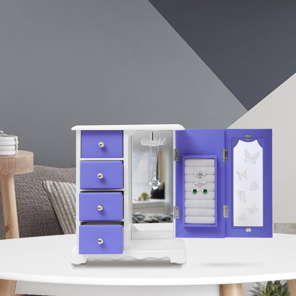 Jewelry Box Bracelets Rings Storage Organizer 4 Drawers Purple w/Built-in Mirror Description This Jewelry Box Will Keep Your Dresser Organized and save Time Searching for Jewelry. with Its Creative Design and Beautiful Butterfly Pattern, It Will Add a Touch of Character to Your Home. Key Features Excellent Material: This Jewelry Box Is Made of High-quality Mdf, Which Is Natural, Renewable, Anti-wear, Rust-resistant, and Has a Long Service Life. Beautiful Appearance : the Creative Look, Butterfly Pattern, Double Door Design, and Purple Color of the Jewelry Box Make It Beautiful and Suitable in Any Setting. Dust-proof and Highly Transparent Glass: This Jewelry Box Has Highly Transparent Glass. the Glass Is Not Only Dust-proof but Also Provides an Unobstructed View of the Interior Which Can Keep the Inside Clean and Help You Quickly Find the Jewelry You Want. 360° Rotatable Hook: This Jewelry Box Has a 360° Rotatable Hook, Which Can Be Freely Rotated for Easy Access to Necklaces and Bracelets. Large Capacity Storage: This Jewelry Box Has a Ring and Earring Area, a Hanging Area Behind the Door, and 4 Drawers. Earrings, Necklaces, Bracelets, Rings, Watches, Lipsticks, Etc. Can All Be Put into This One Organizer, Which Can Meet Your Various Needs and Make Your Dressing Table Tidier and Neater. Double Door Design: This Jewelry Box Is a Double Door Design, There Is a Large Opening, Which Is Easy for You to Take Earrings, Necklaces, Bracelets, and Rings. Sorted Storage: This Jewelry Box Has 4 Drawers That Allow You to Sort Your Items to Make Your Room Tidier and Easy to Find the Things You Need. Space Saving: with Its Footprint of 9*5in, This Jewelry Box Takes up a Small Area. Since It Makes Use of Vertical Space, Not Only Will It Not Waste Your Dressing Table, but It Will Also Provide You with More Storage Space. Built-in Mirror : This Jewelry Box Case Has a Built-in Mirror. You Only Need to Open the Box to Use It, Which Is Very Convenient for You to Wear Jewelry and Does Not Take up Much Space. Earrings and Rings Storage Area: This Storage Area Is Equipped with Soft Velvet to Protect the Jewelry from Wear and Tear Which Is Very Thoughtful. Wonderful Gift: Our Jewelry Box Is an Ideal Gift for Your Wife, Daughter, Girlfriend, or Make-up Lovers on Birthdays, Anniversaries, and Christmas, Because It Is Not Only Useful but Also a Great Decoration. Easy to Clean: Because of Its Smooth Surface, You Only Need to Wipe It with a Cloth, and Then It Will Shine like a Brand-new One. Customer Service: We Aim to Provide Quality Products and Services. If You Have Any Problems, Please Feel Free to Contact Us. We Will Reply and Solve the Problem for You As Soon As Possible. Details Anti-slip Footbeds : This Jewelry Box Has Four Anti-slip Footbeds on the Bottom, Which Allows You to Keep It Stable While Using It for Your Convenience. 4 Drawers: the 4 Drawers of This Jewelry Box Not Only Provide More Storage Space but Also Protect Privacy. Silver Handles: Each Drawer Has a Silver Handle That Is Round and Smooth for Easy Access and Embellishes the Jewelry Box. Every Time You Open the Box Is a Ritual Enjoyment. Odorless Paint: This Jewelry Box Adopts Odorless Paint Which Is Odorless, Does Not Fade, and Has Bright Colors. Plating Hardware : the Plating Hardware of This Jewelry Box Will Not Fade or Rust Which Increases the Service Life. Application It Is Suitable for the Bathroom, Bedroom, Dressing Table, and Make-up Store to Place Necklaces, Rings, Earrings, Bracelets, and Other Make-up Items, Making Your Dressing Table Neater and Tidier. Specification Style: Simple, Modern Material: Mdf, Glass Color: Purple Process: Odorless Paint Number of Drawers: 4 Product Size: 23*13*28.5cm/9*5*11.2in Package Size: 29*18*34cm/11.42*7.09*13.38in Net Weight: 2kg/4.41lbs Gross Weight: 2.4kg/5.29lbs Package Included 1* Jewelry Box Notes Please Allow the Slight Color Difference Caused by the Shooting Light and 1-3 Cm Error Due to Manual Measurement, and Make Sure You Do Not Mind Before Ordering. Payment Delivery details Terms of sales About us Contact us Payment We accept ebay payment 。 Fees such as import duties, taxes are not included in the item price or shipping costs. These charges are the buyer's responsibility. Delivery details Shipping: 2-9 working days to: USA Terms of sales We maintain high standards of excellence and strive for hundred percent customer satisfaction. Feedback is very important to us. We hope that you contact us immediately before you give neutral or negative feedback, so that we can address your concerns. It is impossible to address issues if we do not know about them! About us Your satis faction is our ultimate goal. We work hard to earn your trust and future business. Our certified technicians have tested each item before shipping. The unit comes with 1 year limited warranty on all manufacturing defects. a) If you receive a defective item, you may return it or ask for a discount. Please contact us within 14 days after you receive the package. b) What you returned must be intact and in its original packaging as re? u. Customer is responsible for shipping costs of the returned item. c) We will cover the cost of shipping back t with the shipping rate indicated in the registration page. We will send you a new unit or refund the full payment you paid. Thank you. Contact us Business Hour Business Hour: Monday To Friday: 8:30 AM to 5:00 PM (Beijing China time) Due to time zones, our reply to your questions may not be immediately. But within above working time, we will reply your email within 24 hours. If it's non-workdays, please kindly be patient and wait till Monday. Please contact us with ebay message. Please feel free to contact us if you have any questions. Monday To Friday: 8:30 AM to 5:00 PM (Beijing China time) Due to time zones, our reply to your questions may not be immediately. But within above working time, we will reply your email within 24 hours. If it's non-workdays, please kindly be patient an