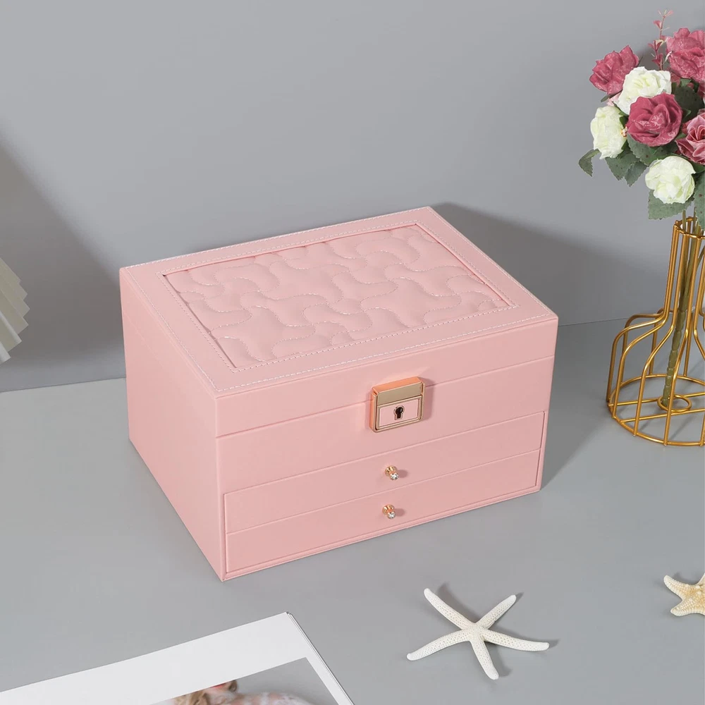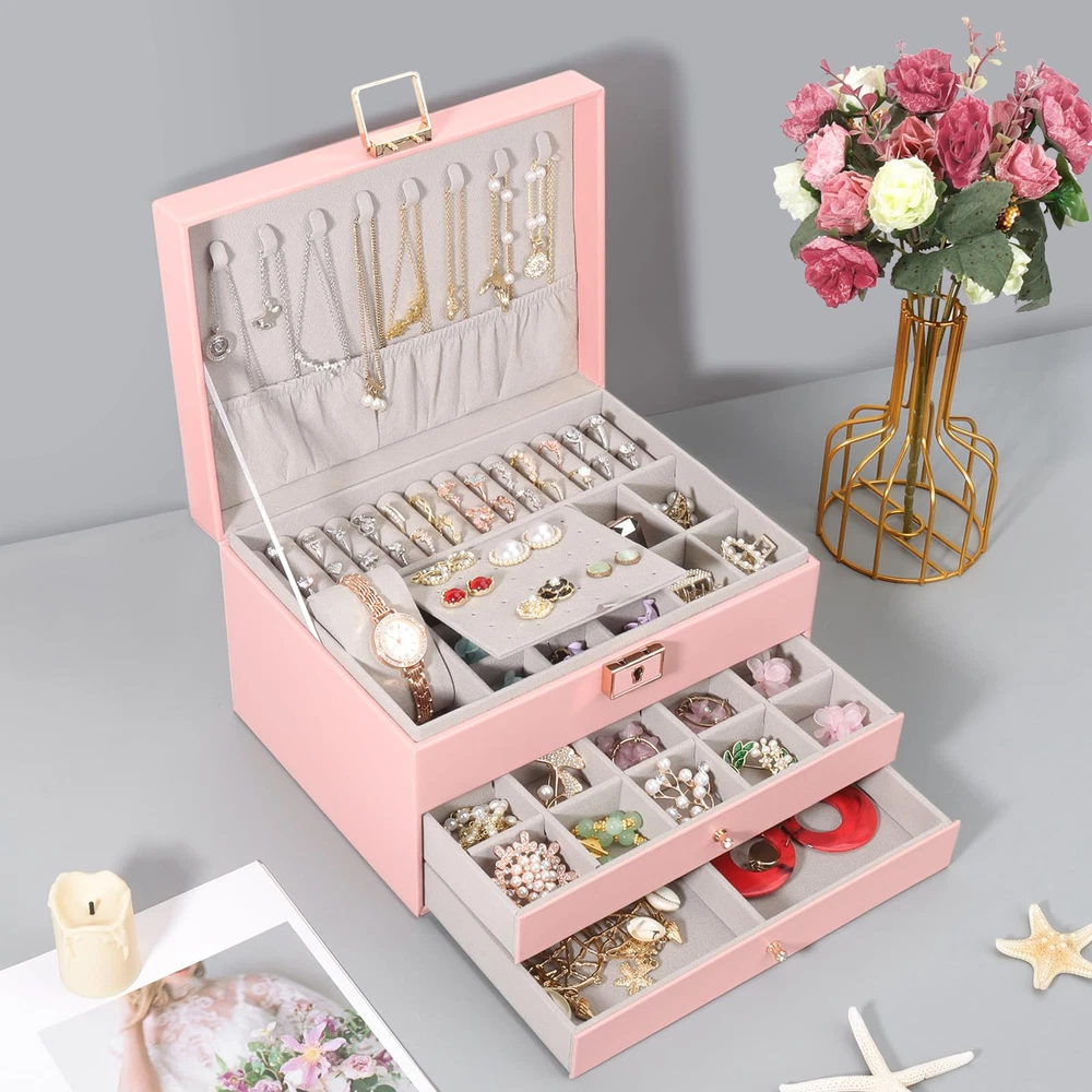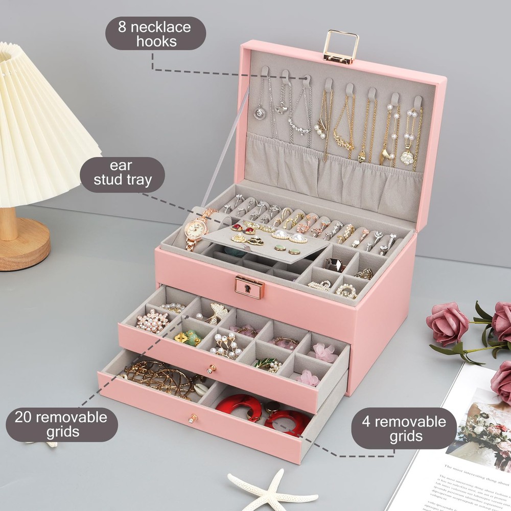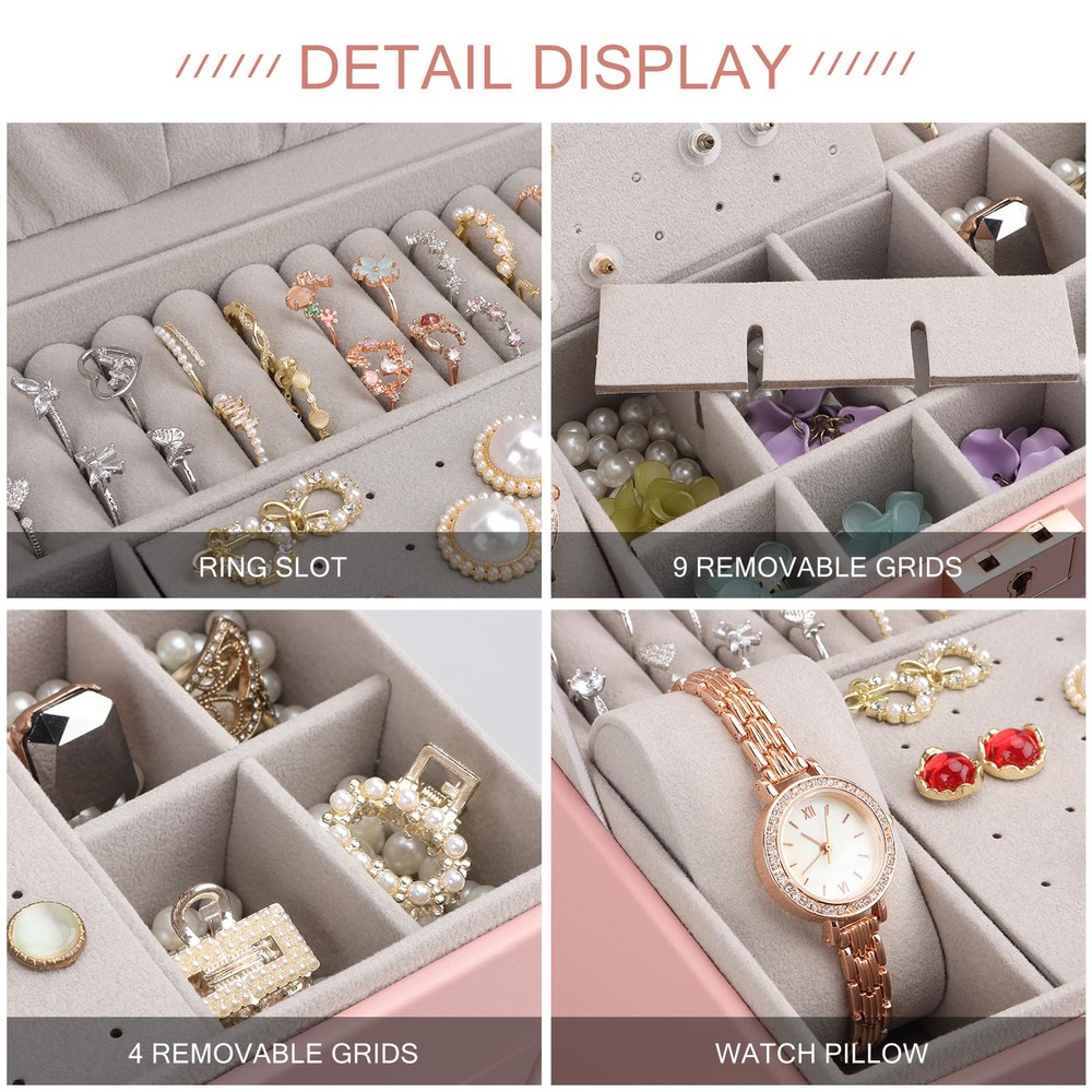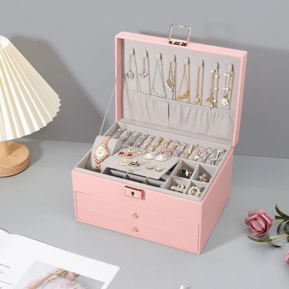 【Jewelry Box Organizer】:The jewelry box has three layers. The upper level is the tray, with grooves for rings, earring stud trays and places for watches. The bottom two levels are drawers with removable dividers that you can use as you wish according to the size of your jewelry. There are also 8 necklace hooks on the lid of the open jewelry box. 【Fashion Design】:Compared with other jewelry boxes, our jewelry box has a water ripple pattern design. The design of the metal luster lock and handle adorn the jewelry box, coupled with the delicate golden key, make the jewelry box look more high-end, fashionable and beautiful. 【Waterproof & Soft】:The jewelry storage case is made of high quality faux leather and soft velvet lining. Not only is it waterproof, the soft velvet material also protects your jewelry from scratches and damage. There are also three small mesh bags, three PVC bags and a cloth to wipe the jewelry inside the jewelry storage case to better care for your precious jewelry. 【Convenient Storage】:The size of the jewelry box is 23*17*13.5cm/9.1x6.7x5.3in. Can meet your various jewelry storage. The jewelry box keeps your jewelry organized and keeps your desk clutter-free. You also don't have to waste time looking for your jewelry. 【Suitable for Using】:Jewelry organizer is the gift for Mother, Friends, Colleagues, Wife or Girlfriend etc. for Valentine's Day, Christmas, New Years, Birthdays, Weddings etc. This jewelry organizer will be a lovely gift to keep.