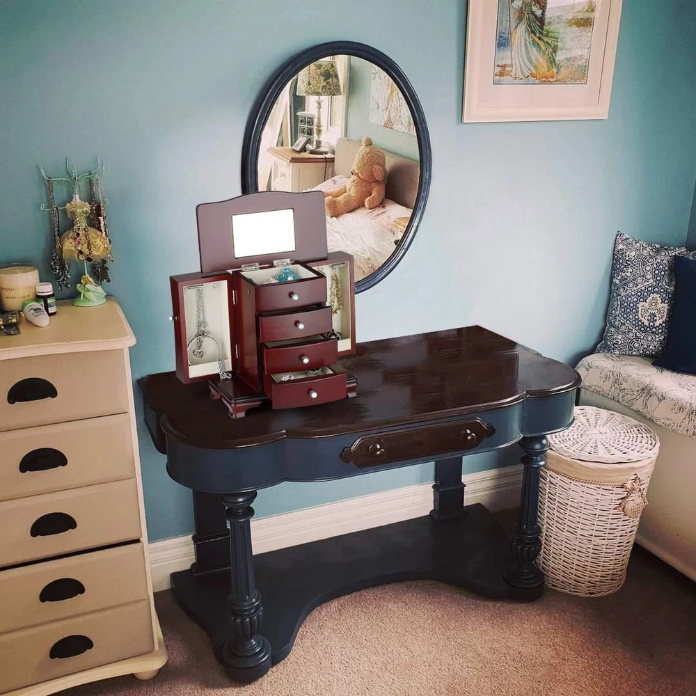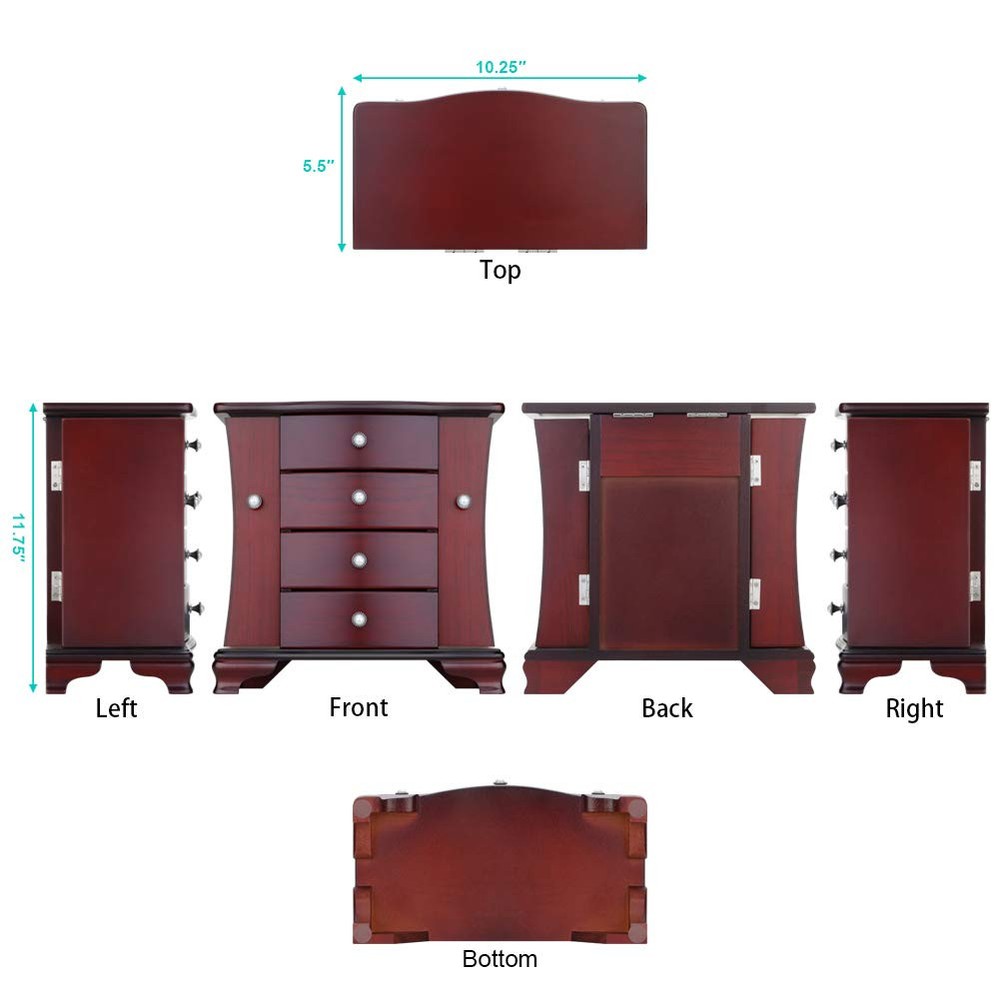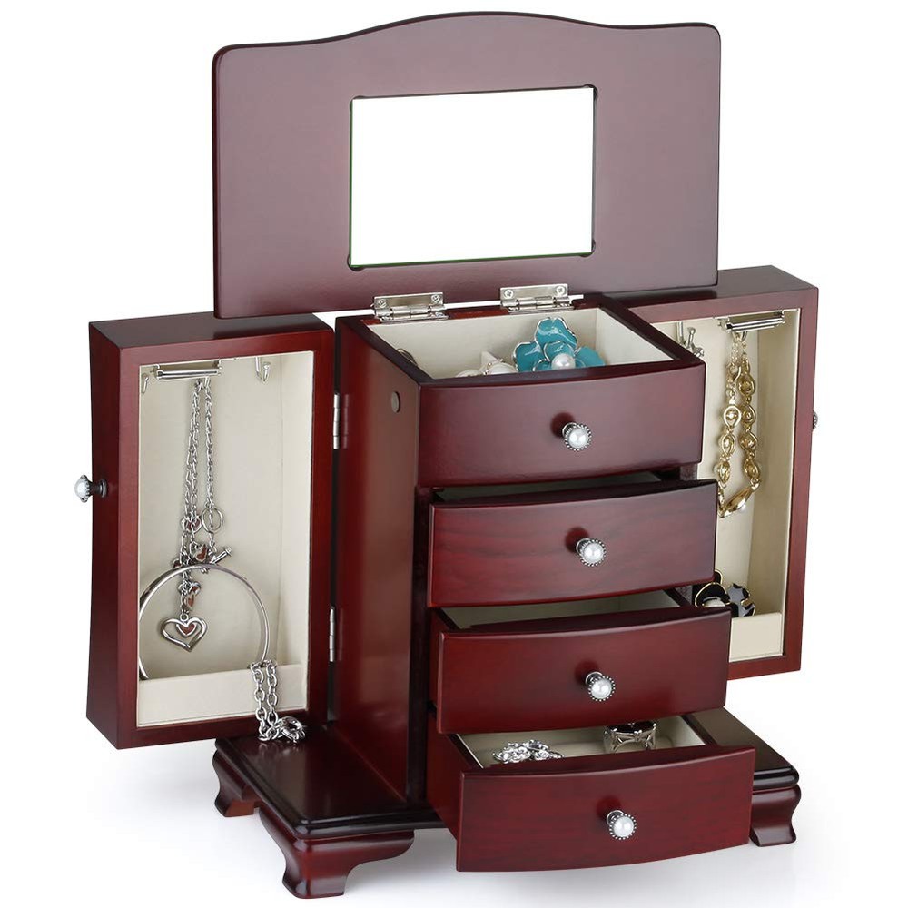 THE ROUND RICH HIGH-GRADE JEWELRY BOX:High-end natural hardwood structure, Anti-Tarnishing velvet lining, exquisite hardware decoration, harmonious color match, highlighting taste and nobility. Packaged in a beautiful GIFT BOX, a gift that women will not refuse! Exterior design: Streamlined top design, classic heavy foundation, double Necklace door and beautiful pearl door handle and drawer handle provide timeless style and ingenious convenience. Four story tower and large storage space with separate open doors on both sides. Three large detachable drawers and a customized ring drawer, this multifunctional jewelry box is not only exquisite, but also luxurious. Internal Multifunctional Design:3 removable square drawer on the middle, large space storage (It can store necklaces, bracelets, earrings, earpins, hairpins, watches, rings and other jewellery accessories). Large cosmetic mirrors are fitted on top, making it easier to choose jewelry to match your own clothes; 6 Necklace hooks on the top of the doors hung both sides of the open storage space, which can hang a variety of jewlery, and multilayer velvet ring storage device in the bottom drawer. Size:Jewellery box 10.2" x 5.7" x 10"(L*W*H); Drawer Internal Space 4.3 x 3.5, Deep 1.5"; Mirror Size: 3.2" x 4.8". This elaborate jewelry box will protect all your accessories from scratches and offers a clean storage environment for jewelry. Perfect gift for girlfriend. No reason refund. Click and add to cart now.