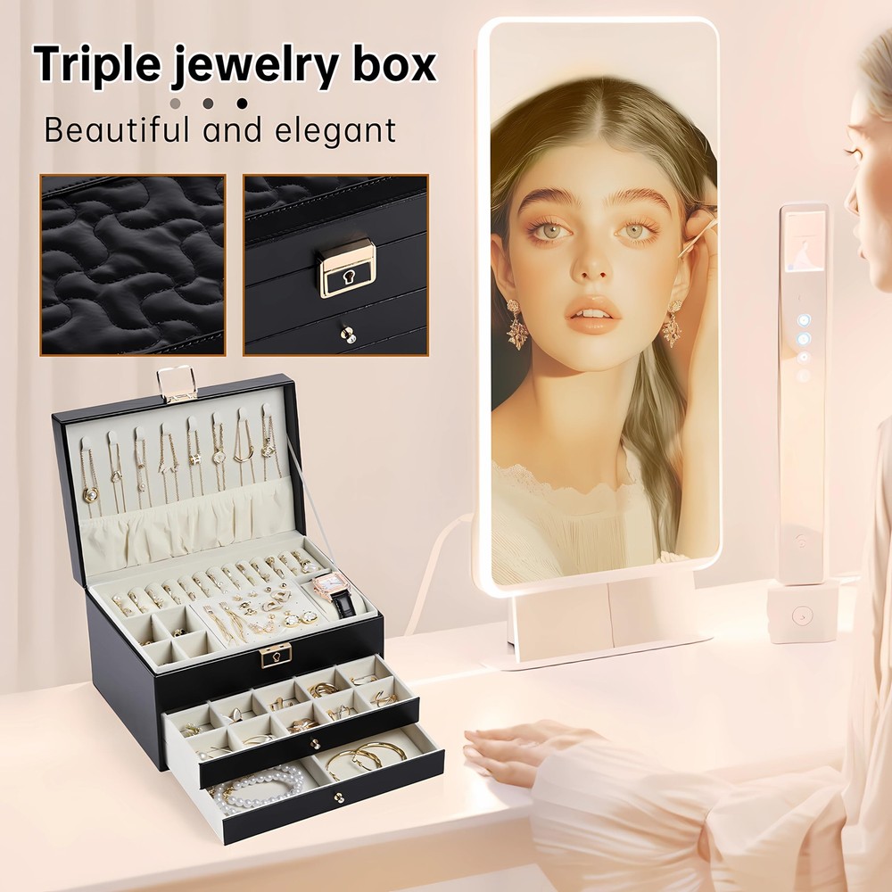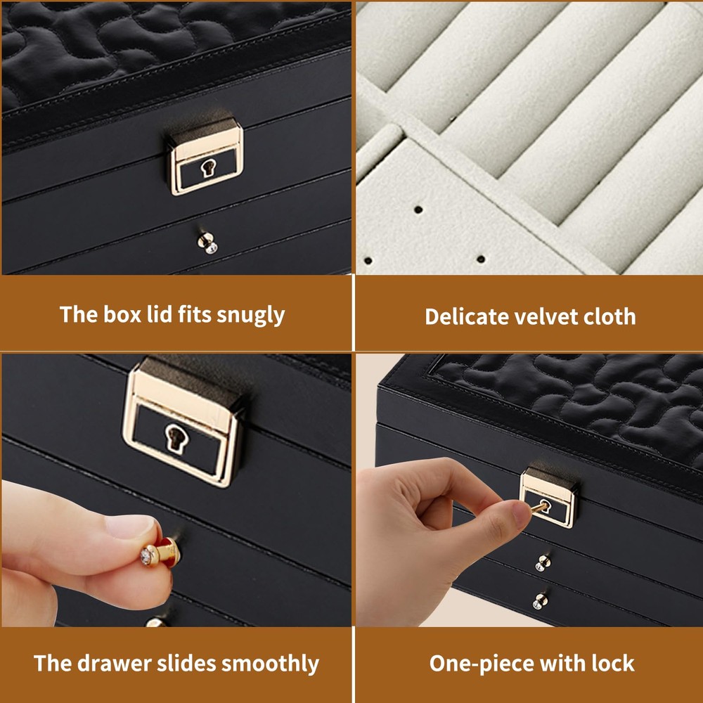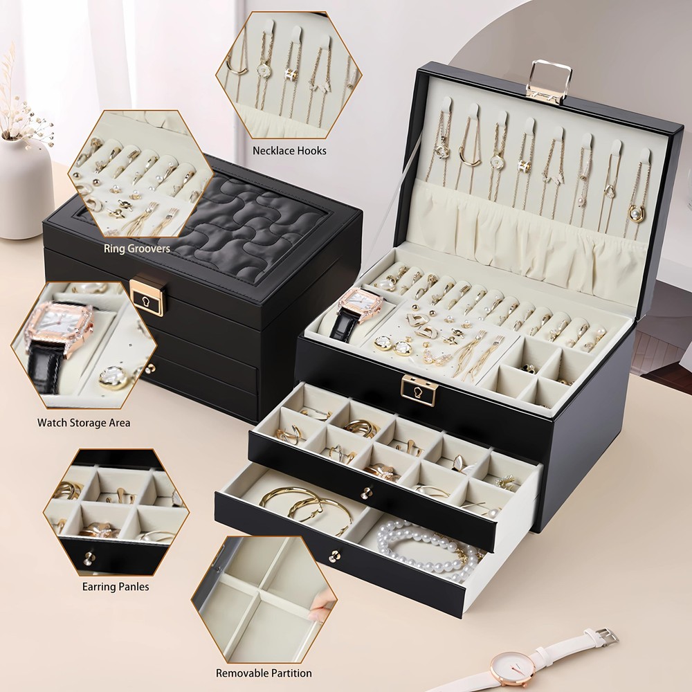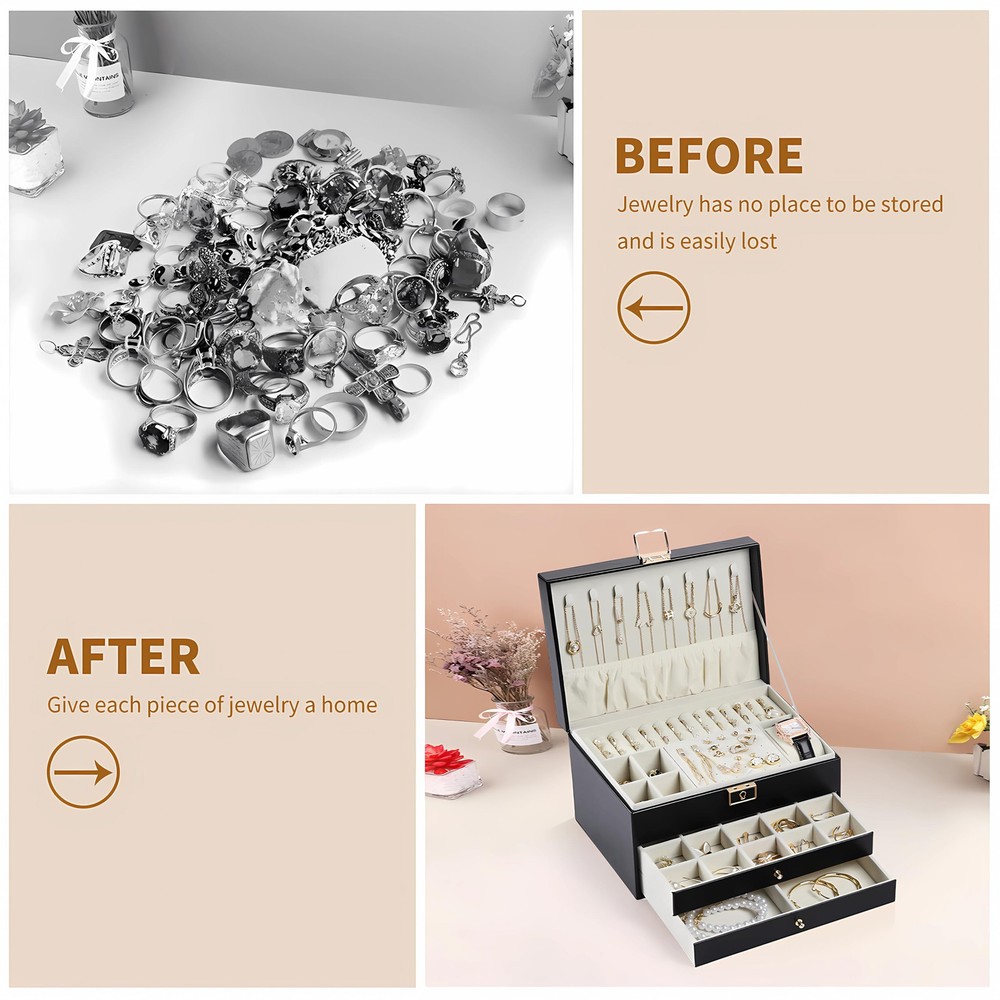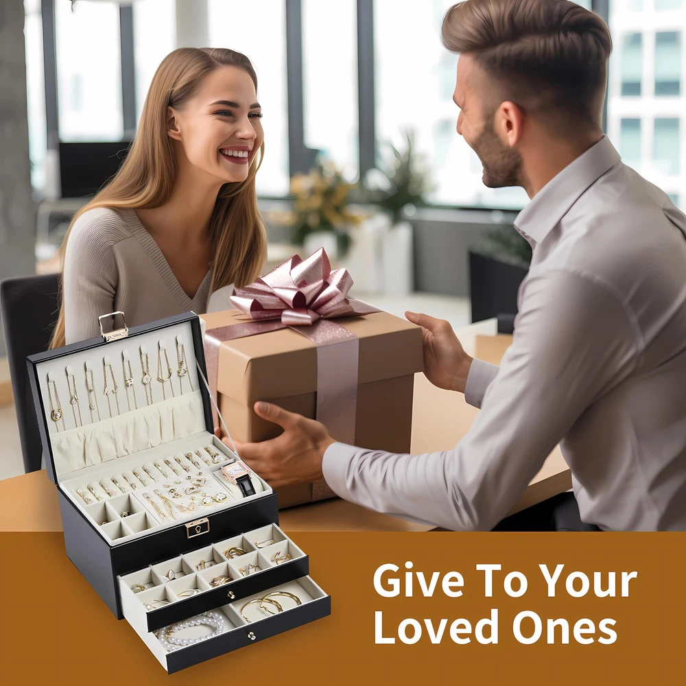 Large Jewelry Box:This earring organizer box offers dedicated areas for necklaces,watches,rings, and earrings.The middle drawer features 20 small sections,while the lower drawer includes removable dividers for flexible adjustments,ensuring a well-organized and spacious jewelry storage area Premium Craftsmanship:Crafted with a soft velvet lining to prevent jewelry scratches and a smooth-sliding drawer system,this jewelry box with 3 layers boasts a PU leather exterior that is easy to clean and maintain,The tight-fitting lid effectively reduces moisture entry,providing comprehensive protection for your precious jewelry holder Secure And Private Storage:Equipped with an integrated lock,this jewelry holder organizer ensures the safekeeping of your valuables,preventing loss and offering privacy.Ideal for storing high-value jewelry,it adds a touch of elegance to your room,making it a perfect mom Christmas gifts option Organized And Space-saving:Our jewlery organizer keeps your necklaces,earrings,rings, and watches neatly arranged.This jewelry box with 3 layers helps maintain a tidy vanity space,with a clear layout that makes all your items easily visible,saving you time searching for your favorite pieces before wedding or special occasions Gift-Worthy Jewelry Box:This jewelry boxes for women is exquisitely crafted,durable, and sturdy.It is a gift option for mothers,wives,girlfriends,daughters,and friends,and is also suitable for giving on various holidays like Christmas