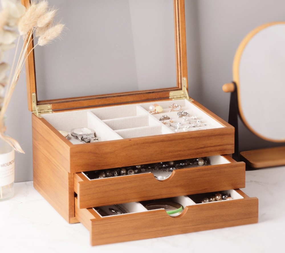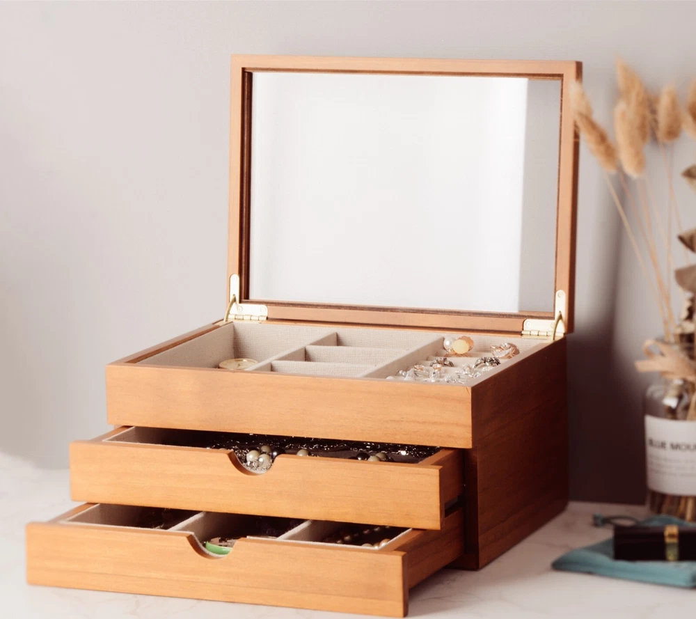【3 LAYER DESIGN】Our jewelry box boasts ample storage capacity with its three-layer structure. Effortlessly organize your rings, earrings, bracelets, necklaces, glasses and even watches with ease. The bottom two layers are equipped with removable dividers, offering flexibility for customization to suit your preferences perfectly. 【HIGH-QUALITY SOLID WOOD】Our jewelry box is meticulously crafted from solid pine wood, known for its sturdy and durable characteristics, ensuring reliable protection for your precious jewelry. Additionally, we apply a natural vintage color with careful painting, adding a charming classical ambiance to the overall design. 【GLASS LID DESIGN】Combined with a see-through glass lid, our wooden jewelry box offers a stylish showcase for your accessories while allowing you to effortlessly find your favorite pieces at a glance. Add a touch of sophistication to your space with this decor piece that beautifully highlights your jewelry collection. 【RUSTIC TEXTURED LINEN LINING】The interior of the jewelry case is lined with natural linen fabric, which helps absorb oils and sweat from your jewelry, reducing the likelihood of oxidation and protecting your valuables from scratching. 【IDEAL FOR GIFTING】The elegant appearance and practical functionality of our jewelry box organizer make it an excellent choice for gifting to mothers, wives, or girlfriends on occasions such as Mother's Day, anniversaries, Valentine's Day, or Christmas. It not only showcases sophistication and taste but also satisfies practical needs.