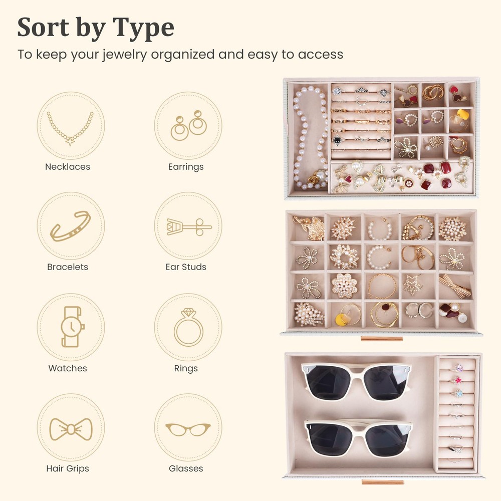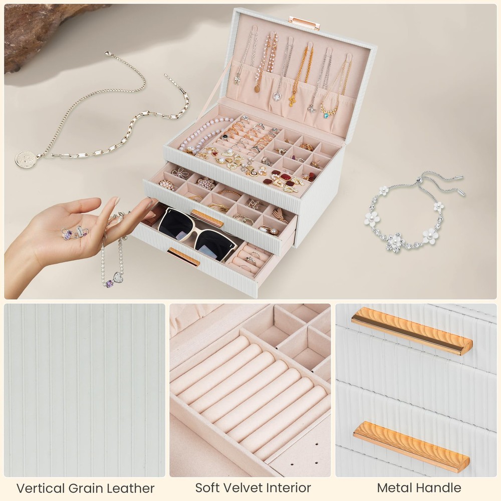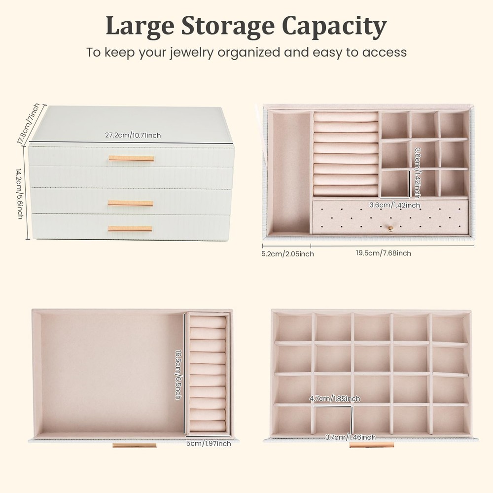 Large Capacity Jewelry Box: The closed size of this jewelry storage box is 10.71 x 7 x 5.6 inches. The jewelry organizer box is equipped with multiple compartments, which can store various types of jewelry such as earrings, rings, necklaces, bracelets, watches, and brooches. And equipped with detachable compartments for storing large jewelry items Style Upgrade: Classic white and gold, shiny metal buckles, neat stitching, and vertical texture on the sides make the jewelry holder box more classic and fashionable. The PU leather on the surface of the jewelry box organizer is waterproof and easy to clean, and the soft lining can effectively protect your jewelry Versatile Use: The large jewelry box design combines classic elements with modern aesthetics, seamlessly integrating both retro and modern home decor styles, enhancing the overall style of home decoration. This jewelry storage case is very beautiful and elegant whether used in the bedroom, cloakroom, or dressing table Space-Saving Jewelry Box: The women’s jewelry box is equipped with two spacious drawers, providing ample storage space for your jewelry. Sorting and organizing is more convenient, making it easy to manage various types of jewelry, saving time searching for jewelry, and making your desktop look neater and more elegant Perfect Gift Idea: This jewelry case has a stylish and classic appearance, suitable for all women girls. Whether it's for a girlfriend, mother, daughter, or friend, this women’s jewelry box is the perfect gift choice. Whether it's Christmas, New Year, Valentine's Day, Thanksgiving, Mother's Day, or birthdays, it will always be a delightful gift