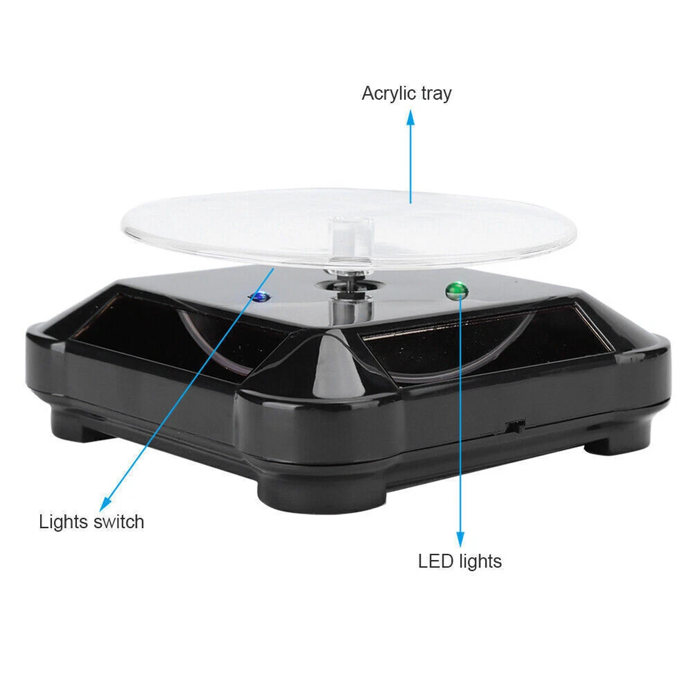 Feature: 1. Small in size and light in weight, easy to assemble after removing the plate cover. 2. Solar racks are environmentally friendly and can work under light. You can use them to display products in window, shelves, counters, layering shelves or floors. 3. The four‑sided solar panel ensures maximum light reception to power the turntable. 4. Applicable to jewelry, mobile phones, watches, crystal ornaments, cigarette, cakes, etc. 5. Fluorescent light, solar light, solar or battery power supply, widely applications. Specification: Condition: Brand New Item Type: Rotating Display Stand Material: Plastic Color: Black Description: With LED light switch: You can turn items on/off with one light switch No battery on/off switch: The solar energy can drive the display to rotates through the four built-in solar panels, so there is no on/off button on the upper part of the battery rotational base to stop the rotation. The way to control the stop of rotation is to remove the panel or battery Heat Resisting Temperature: 80℃ Cold Resistant Temperature: -10℃ Load Bearing: 300 - 500 g / 10.58 - 17.64 oz(approx.) Two Styles / Types of Stands: With / Without lights Dual Use: Solar energy or batteries; Solar cell Power Supply: Fluorescent light, solar light, solar or battery power supply Battery: 1pc AA Battery (Not included) Scope of Application: Applicable to jewelry, mobile phones, watches, crystal ornaments, cigarette, cakes, all kinds of small gifts, jewelry sales display, display in the store, window, office, counter, display cabinets and other public places for advertising purposes Note: 1. Flash: If the beaded style is selected at the upper part of the display base, you will need to install the flash when using the battery. 2. If the flash is not used, try unplugging the battery to reduce power consumption in bright light. 3. The on/off switch is used for lighting. It does not have an on/off switch for batteries. 4. The lighting shed with higher strength rotates faster and have strong load capacity, and , with slower and weaker speed, which can also be improved by using batteries 5. The solar display panel in a quiet place will make some noise Display Stand Size: Approx. 9.5 x 9.5 x 4cm / 3.7 x 3.7 x 1.6in Tray Diameter Size: Approx. 9cm / 3.5in Package List: 1 x Display Stand 1 x Tray