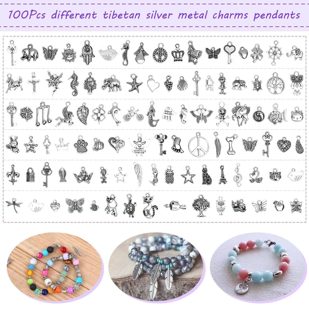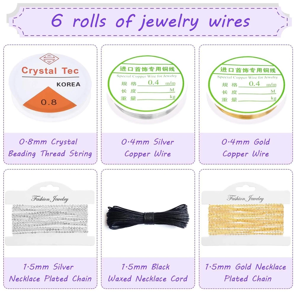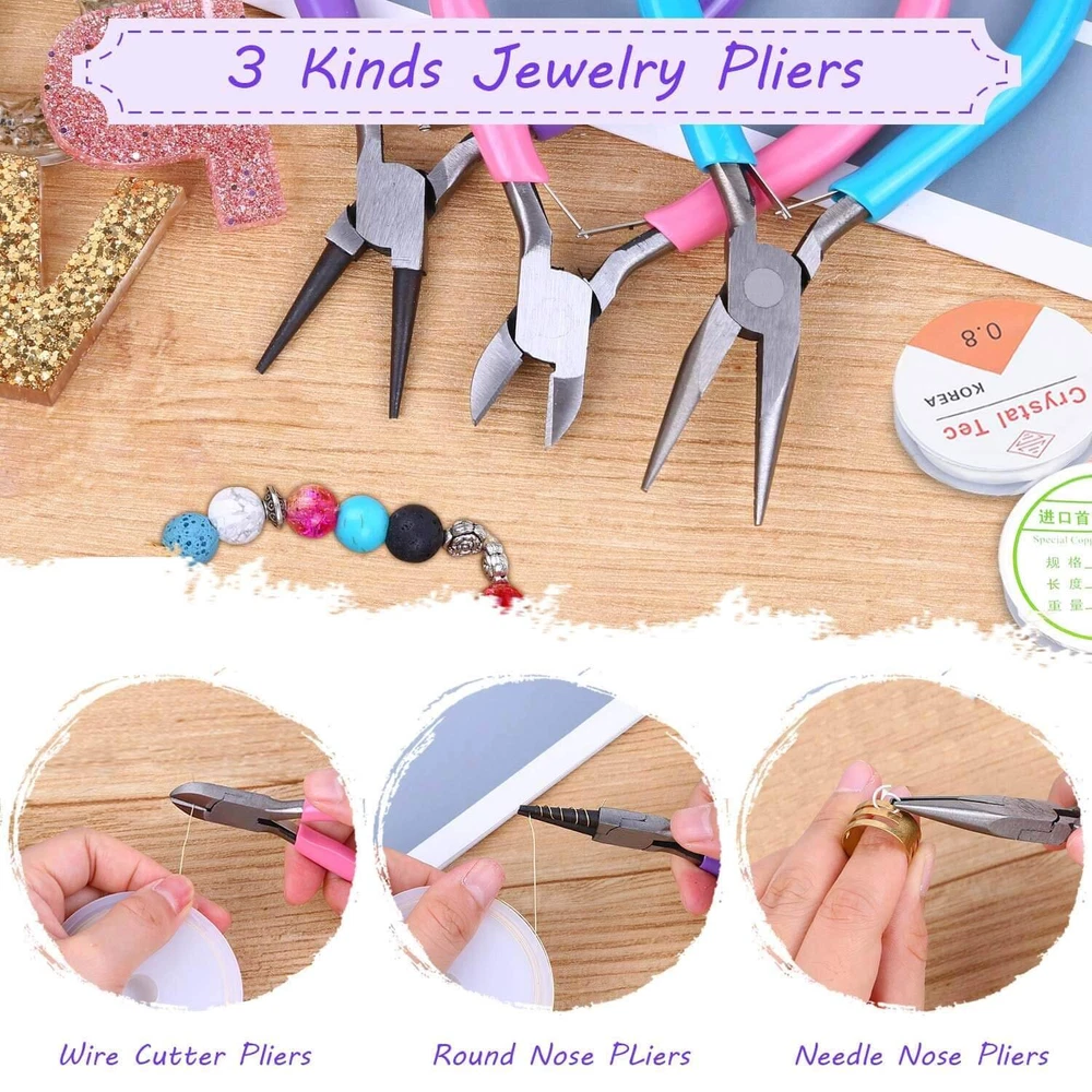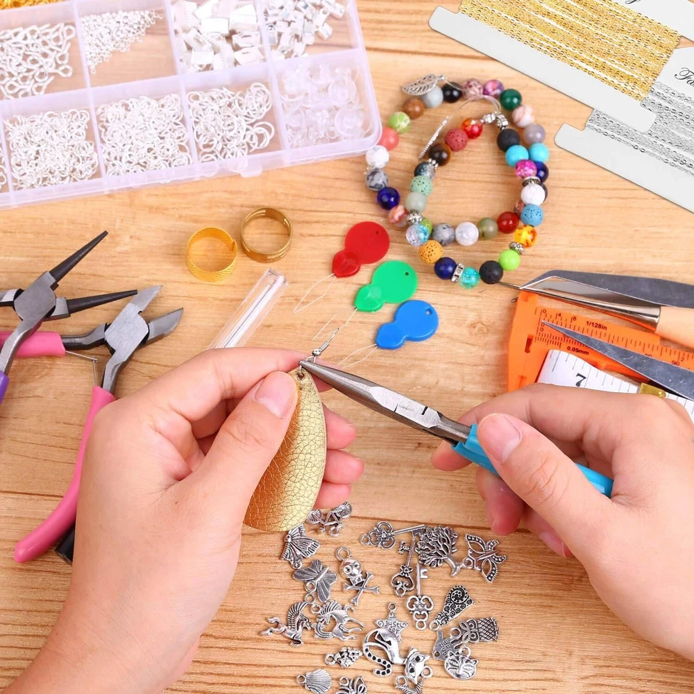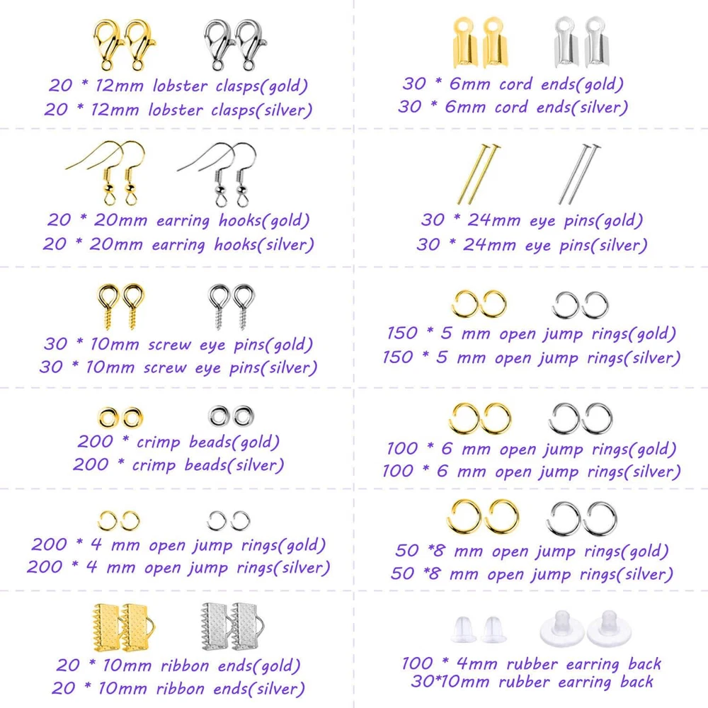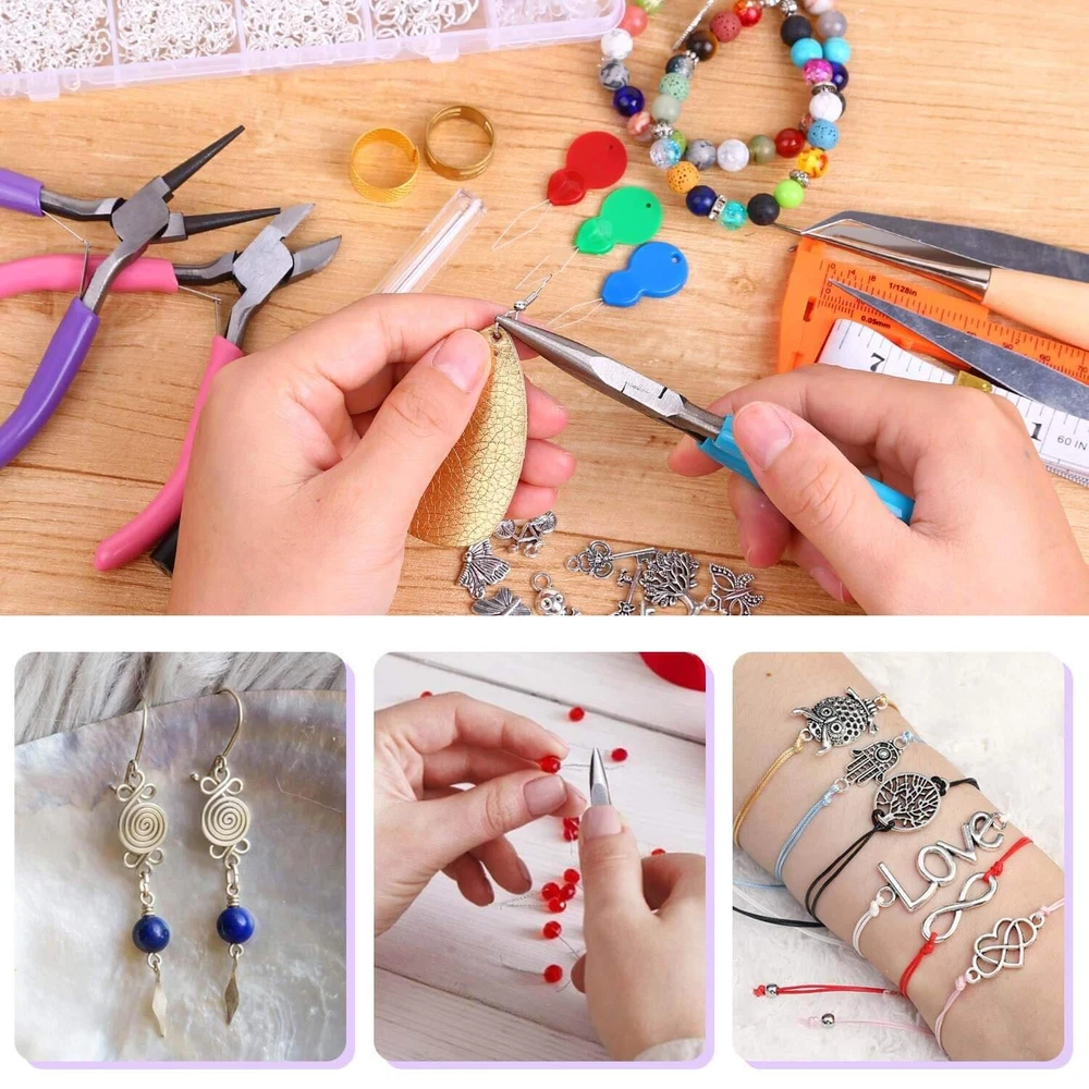 Please Note : If the pliers you received have some oil on the head that make it look like dirty, please do not be worry. The jewelry pliers are coated with oil to prevent rust. Please wipe them clean with a cloth before use and apply oil to them before storage, which will help the pliers keep anti-rust. Package included: 20Pcs jewelry making tools: - 1 pair of Round nose plier - 1 pair of Wire cutting plier - 1 pair of Chain nose pliers - 6 pieces different length beading needles - 1 piece of awl - 1 piece of caliper - 1 piece of soft tape measure - 1 pair of thread scissors - 2 pairs of tweezers - 1 piece of jump ring opener ring - 1 piece of thimble ring - 3 pieces of needle threaders - 1 piece of adjustable helping hands 6 rolls of beading wires: - 1 roll of 0.4mm silver beading wire/ bracelet wire - 1 roll of 0.4mm gold beading wire/ bracelet wire - 1 roll 0.8mm crystal beading thread string - 1 roll 1.5mm black waxed necklace cord - 1 roll 1.5mm silver necklace plated chain - 1 roll 1.5mm gold necklace plated chain 1830Pcs jewelry findings in silver and gold: - 400 * 4 mm open jump rings - 300 * 5 mm open jump rings - 200 * 6 mm open jump rings - 100 *8 mm open jump rings - 40 * lobster clasps - 60 * eye pins - 60 * screw eye pins - 400 * crimp beads - 40 * earring hooks - 40 * ribbon ends - 60 * cord ends - 100 * 4mm rubber earring back - 30 * 10mm rubber earring back 100Pcs jewelry making charms: - 100 * tibetan silver metal charms pendants 【Include All You Need】jewelry making supplies kit includes 3 jewelry pliers, 2 rolls of copper wire, 1 string cord, 1 black waxed cord, 2 rolls of necklace chain, 6 needles, 2 tweezers, 1 caliper, 1 awl, 1 jump ring opener, 1 thimble ring, 1 thread scissors, 1 tape measure, 3 needle threaders, 100 tibetan silver metal charms pendants, 1830Pcs jewelry findings, Including the basic tools and findings you need for most projects for earring making, necklace repair and bracelet fix 【Superior Beading Pliers】The jewelry making tools kit has 3 necessary jewelry pliers: round nose plier, wire cutting plier and chain nose plier. Each plier has double leaf spring and non-slip handles which make them effective and safe for use 【Various Types of Jewelry Making Accessories】Totally 1830 pieces different styles of jewelry findings include open jump rings (4mm, 5mm, 6mm, 8mm), lobster clasps, eye pins, screw eye pins, crimp beads, earring hooks, ribbon ends, cord ends and rubber earring back 【Exquisite and classical design charms】The jewelry repair kit comes with 100pcs silver metal charms in different patterns, which makes jewelry making and charm necklace bracelet making creative. Perfect for necklace, bracelet, dangle, scrapbooking project, keychain, keyring, sweater chain, anklet, cellphone decorative accessories, etc. Best choice for jewelry DIY 【Easy Organized】The jewelry making kit comes with a premium black zip pouch and a plastic compartment box, so you can keep your tools and findings handy, organize and safe, and no worry about losing tools or accessories