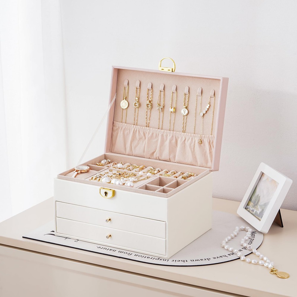 Jewelry Organizer Box, Three Layer Jewelry Display Case 2 Drawers for Necklac...