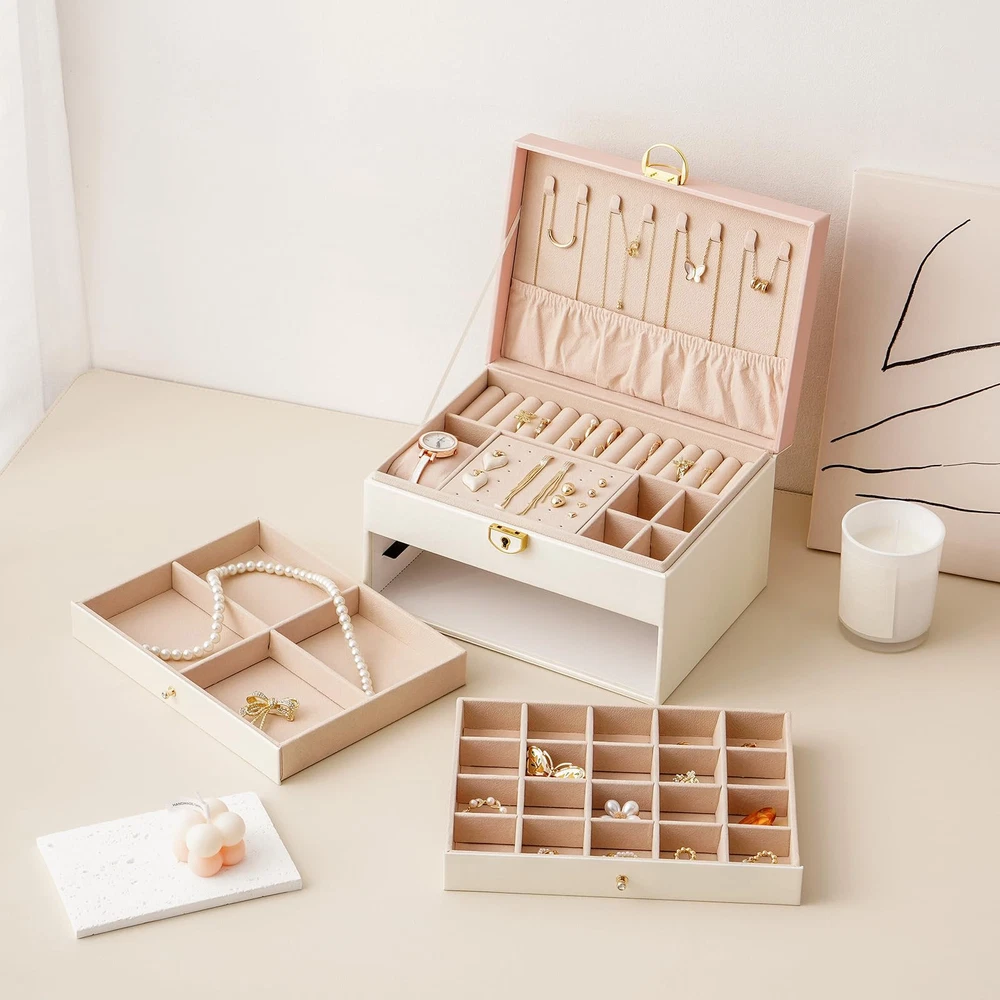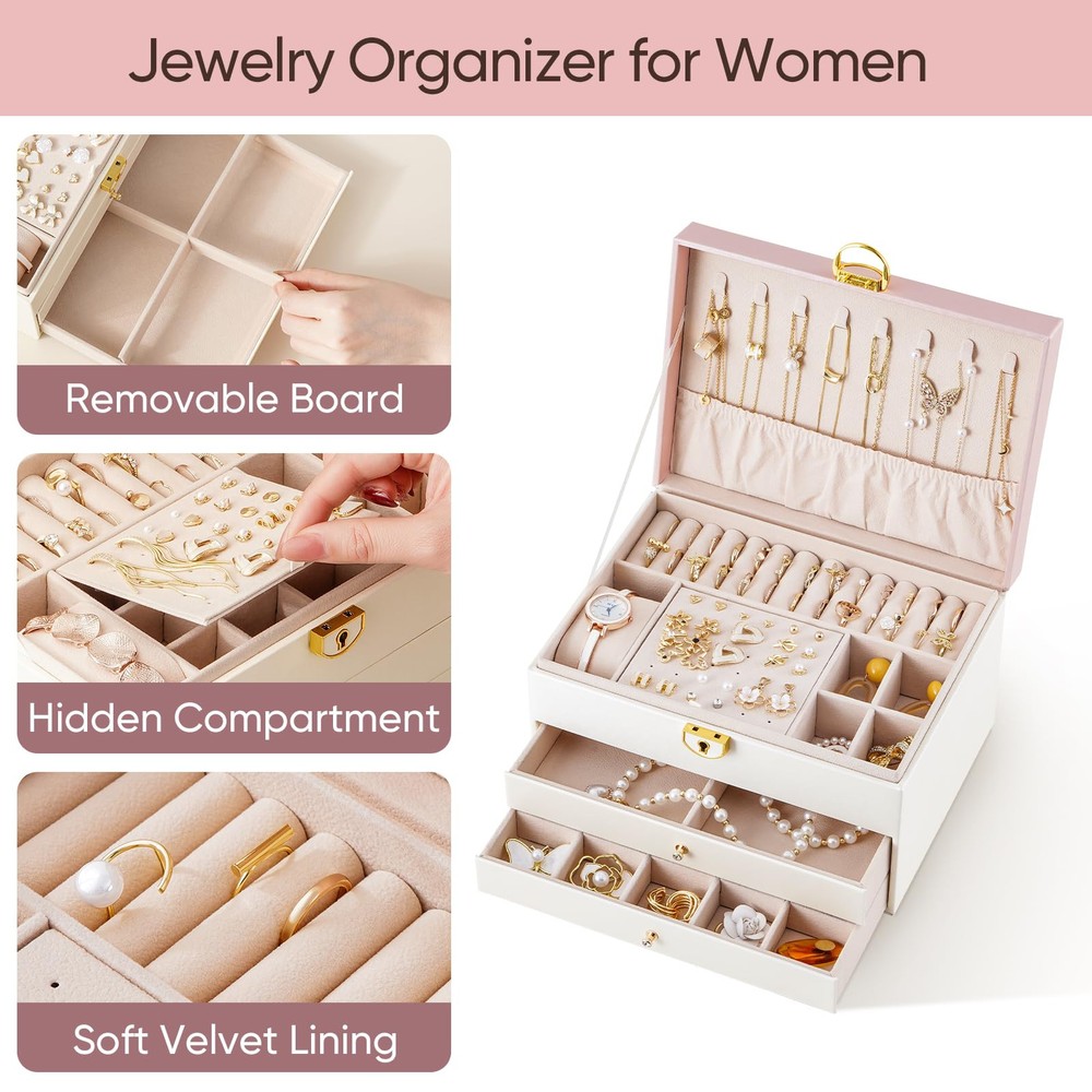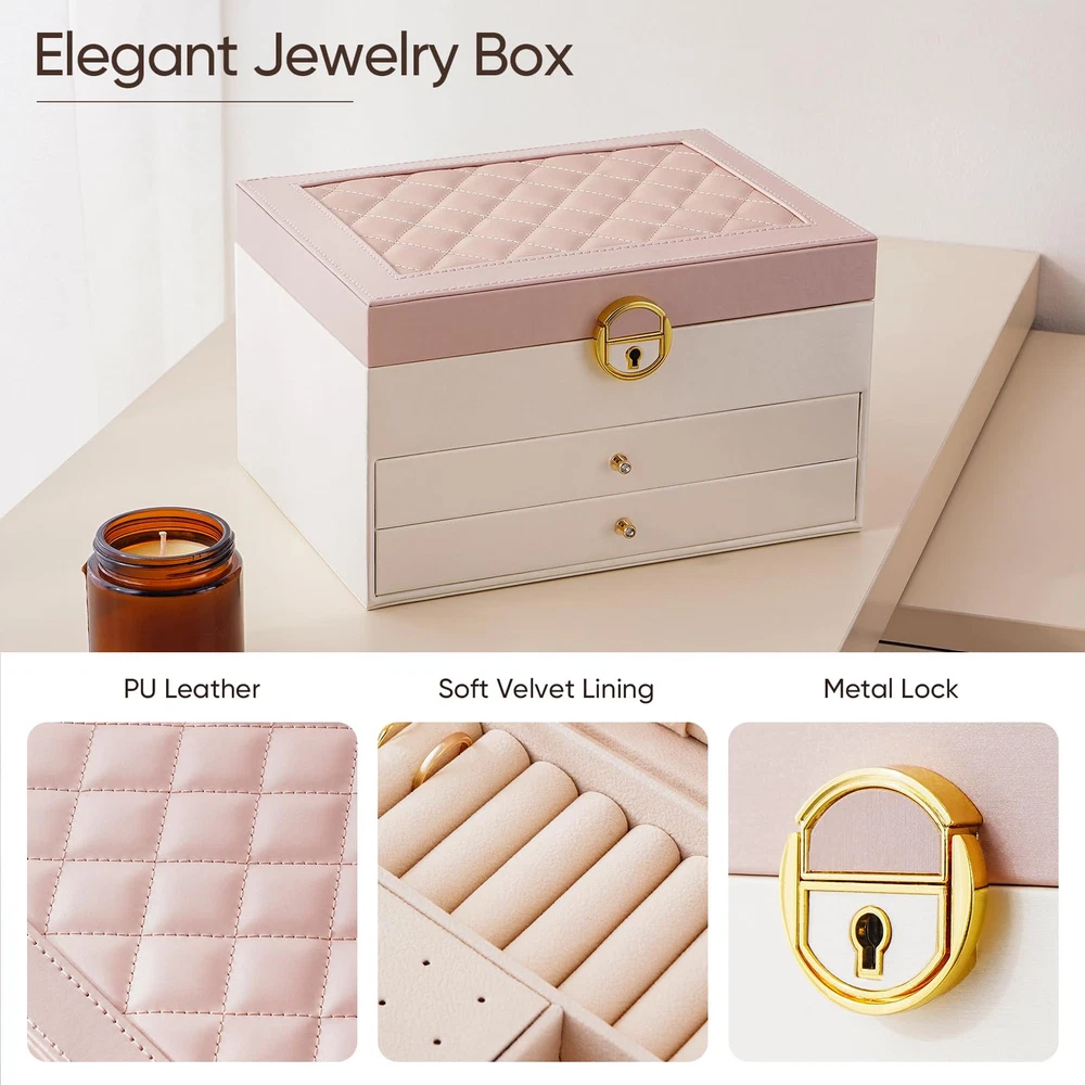 Stylish Design&Considerate Details: Jewelry display box equipped with metal key, provide extra security for your precious; the rhombic lattice surface make the appearance look more elegant. Hidden Compartment&Partition Board: The jewelry box comes with hidden compartment under the earring storage board, suitable for small items storage; removable board in the drawers for storing jewelry in different size, you can removing or adding the dividers to meet your personalized storage needs. Premium Material&Perfect Size: Handcrafted with premium PU leather which is durable and comfortable to touch. Soft flannel lining take great care of your jewelry. Dimension: 9.05"L x 6.69"H x 5.40"W. Perfect to keep your favorite and essential pieces well organized. No more messy, damage or misplace. Multifunction Storage: Three layer jewelry box is designed for organizing all kinds of jewelry, including necklaces, earrings, bracelets, rings, watch etc. Necklace hooks keep your necklaces from getting tangled; partitions board in the drawer to meet your individual storage needs, it can placed lipsticks, makeup palettes or other cosmetics. Great Gift Choice: Jewelry organizer case will be a wonderful gift for Valentine's Day, Mother's Day, Thanksgiving, Christmas, birthdays and weddings for your mom, girlfriend, colleague or someone special in your life, provide all-round protection for her beloved jewelries.