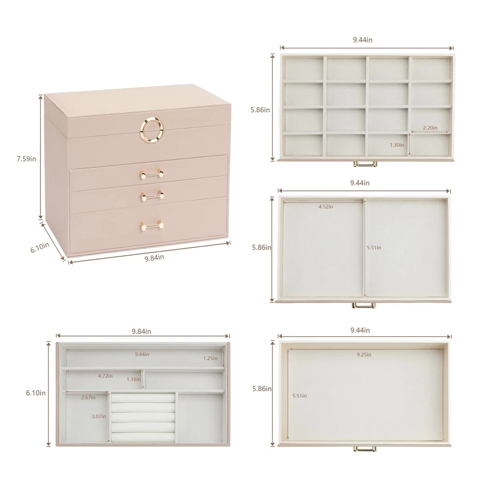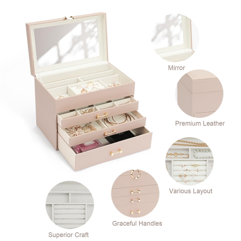 Jewelry Organizer Box with Mirror, Large Jewelry Organizers and Storage, Jewelry Boxes for Women, Jewelry Organizer 4-Layer Jewelry Display Case, Apricot Mirror Product Details Color: Mirror Apicot Brand: V-LAFUY MPN: Does not apply UPC: Does not apply EAN: Does not apply Color: Mirror Apicot Brand: V-LAFUY Material: Leather Style: Modern Special Feature: Portable, Lockable Recommended Uses For Product: Necklace, Bracelet, Ring, Earring Product Dimensions: 9.84"D x 7.09"W x 6.1"H Target Audience: Women Shape: Rectangular Occasion: Wedding, New Home, Thanksgiving, Memorial Day, Valentine's Day Color: Mirror Apicot Brand: V-LAFUY Material: Leather Style: Modern Special Feature: Portable, Lockable Recommended Uses For Product: Necklace, Bracelet, Ring, Earring Product Dimensions: 9.84"D x 7.09"W x 6.1"H Target Audience: Women Shape: Rectangular Occasion: Wedding, New Home, Thanksgiving, Memorial Day, Valentine's Day Mounting Type: Table Top Finish Type: Mirrored Inner Material: Fur Closure Type: Latch Number of Drawers: 3 Number of Compartments: 4 Jewelry Storage Type: Jewelry Box Number of Items: 1 Manufacturer: V-LAFUY Item Weight: 3.76 pounds Size: Mirror Finish: Mirrored Special Features: Portable, Lockable Batteries Included?: No Batteries Required?: No Date First Available: February 2, 2024 Women jewelry box with a large mirror makes it more convenient to wear jewelry. 4 levels-3 drawer jewelry box design is enough to keep your jewelry neatly organized & hold almost all your different size jewelry and accessories. Jewelry organizers and storage with an elegant and stylish appearance. The sturdy structure and high-quality materials make the leather jewelry organizer box durable. Large jewelry organizer is made of premium engineered wood it is not easy to deform. Wrapped by the excellent PU leather makes the box more durable and easy to clean. Premium imitation fur inner lining can protect your beloved jewelry from scratches and damage. This modern jewelry holder looks nice whether displayed on the dresser of your bedroom or your cloakroom to organize your pins, necklaces, rings, bracelets, and other accessories. Whether for a friend or your lover, this jewelry organizer will support any holiday or birthday with an unforgettable memory. Fill it with new jewelry as a lovely surprise and make it a one-of-a-kind gift.