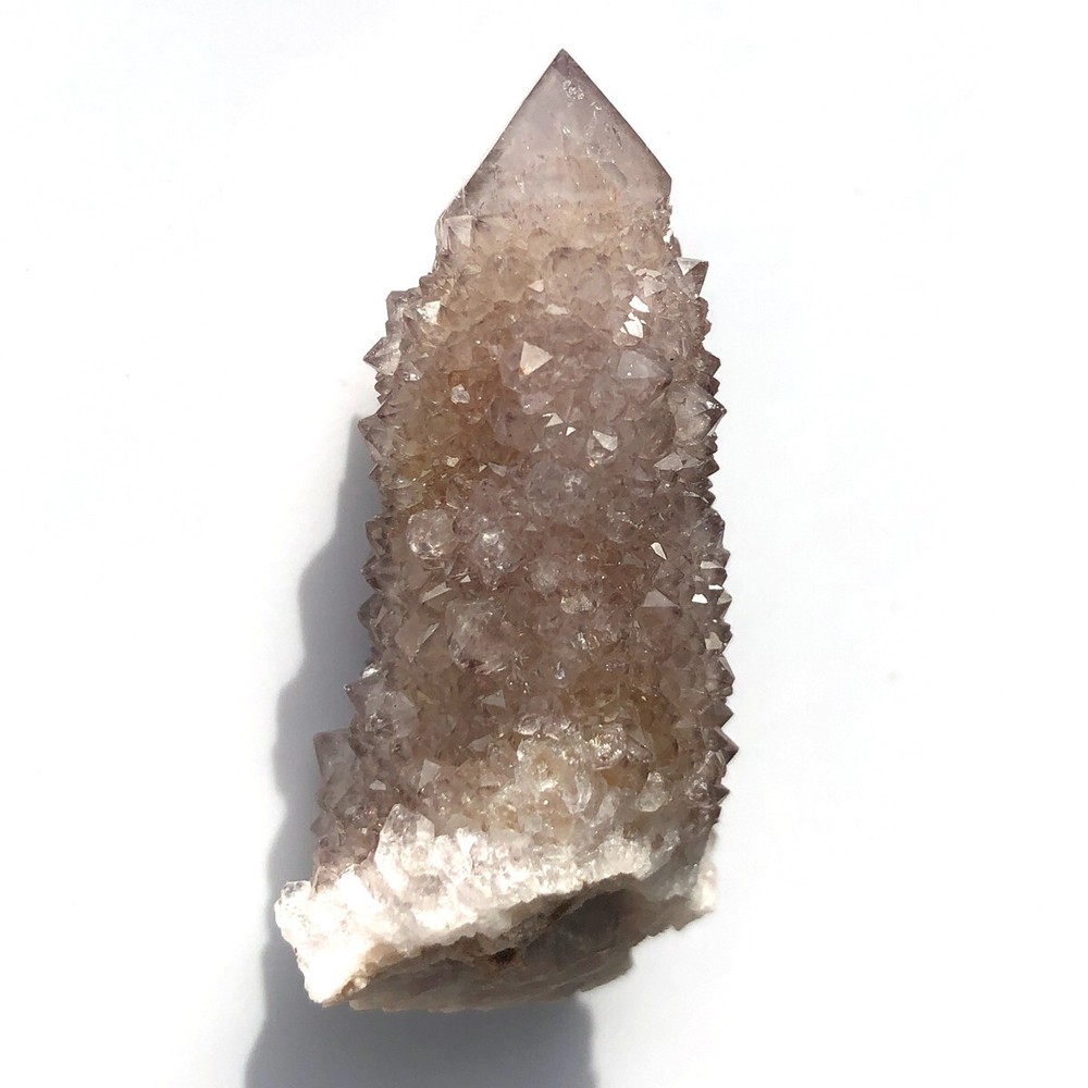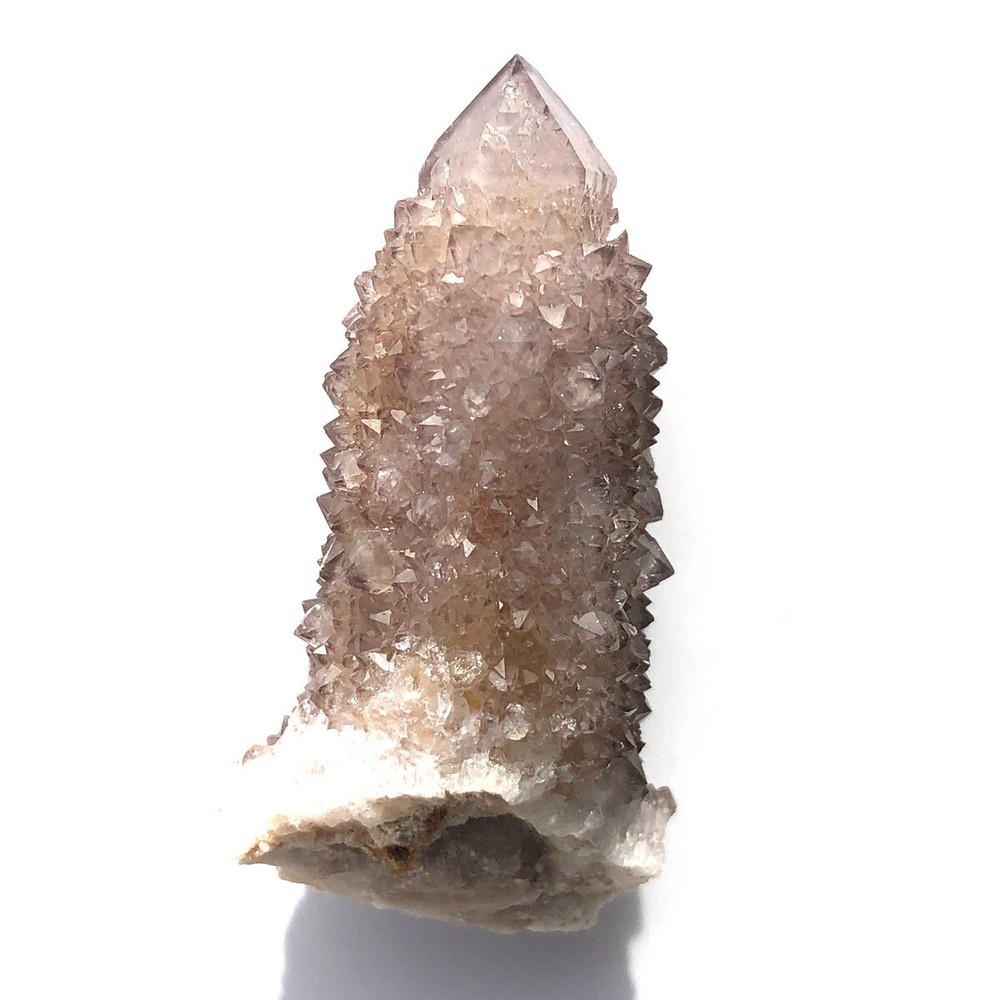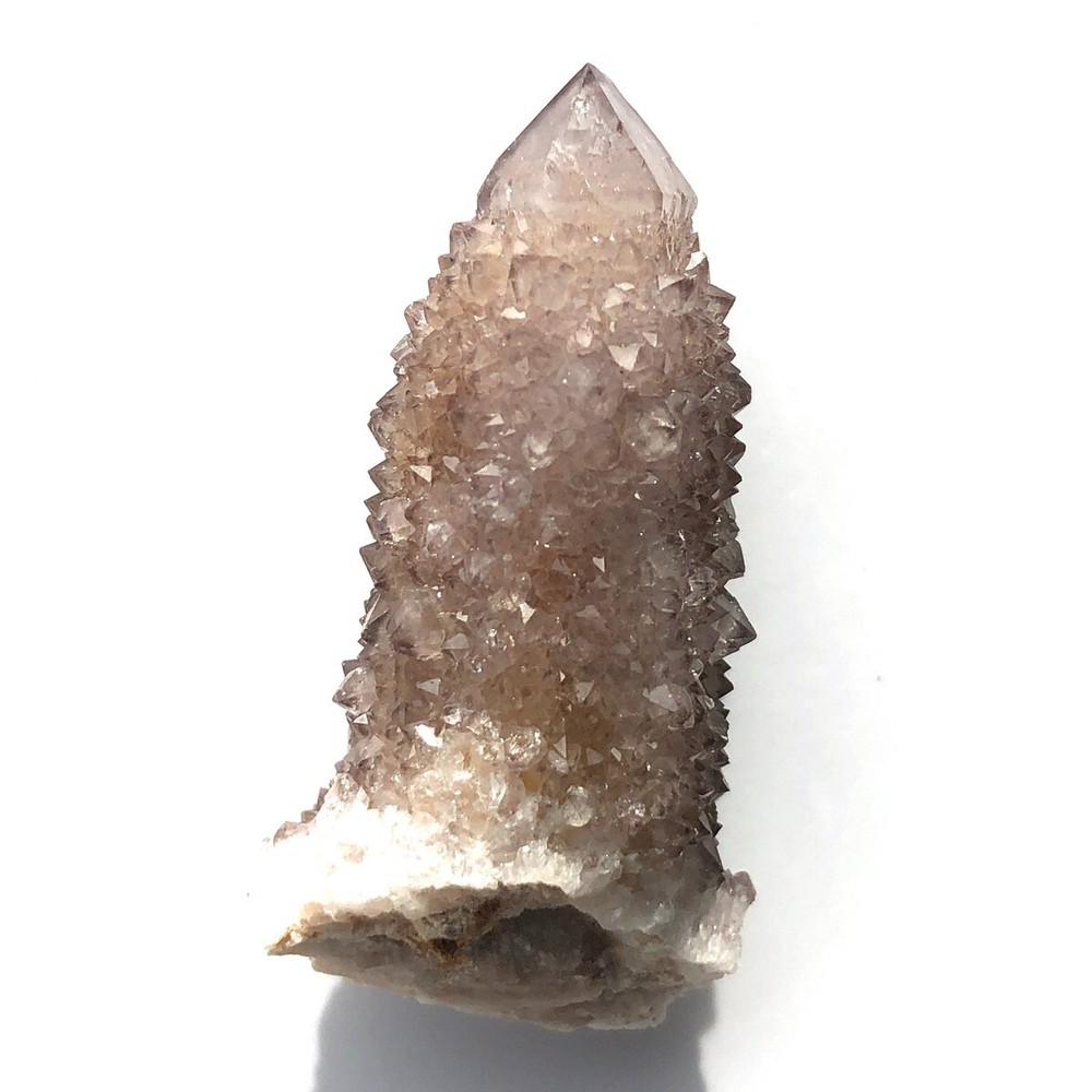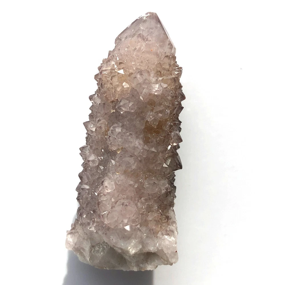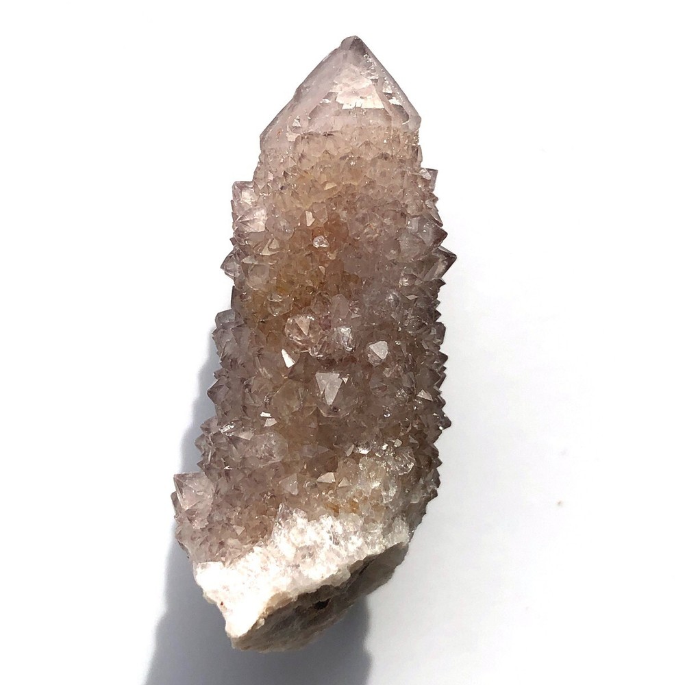 Cactus Quartz or Spirit Quartz Size Approximately 2 cm x 2.5 cm x 4.5 cm 19.5 g View My Other Items For Sale Visit My eBay Store Add me to your Favorite Sellers A cactus or spirit quartz is a quartz crystal that is encrusted by a second generation of smaller crystals grown on its prism faces. These crystals were first discovered in 1986 in the Magaliesberg Mountain Range near Pretoria, South Africa. It occurs as quartz, citrine and amethyst, and comes in a wide range of colors, including purple amethyst, violet amethyst, smoky, milky clear and golden citrine. FAQ/Tips Crystals are priced by quality, color and size. Purple amethyst is more highly prized and will cost more for a smaller lesser quality crystal. Lavender is the most common color and where you will find the best quality/value for price Crystals change colors with changes in type angle and intensity of light. Color may also vary between monitors. Pictures were taken in bright natural light. We do our best to give you many views so you can judge the quality of the given crystals. If you have questions please ask before bidding or buying. Many of the crystals have special color properties: Many have phantoms, not just the ones we?ve indicated. Some have ?floating? purple tips. The placement of darker purple against purple or white crystals appears to change as the crystal is turned. Many are a mixture of citrine and amethyst. The ones called ?Golden Healers? or ?Sunshine? have a rainbow effect on crystal faces. We value your feedback please contact us with problems. Items are returnable. Track Page Views With Auctiva's FREE Counter