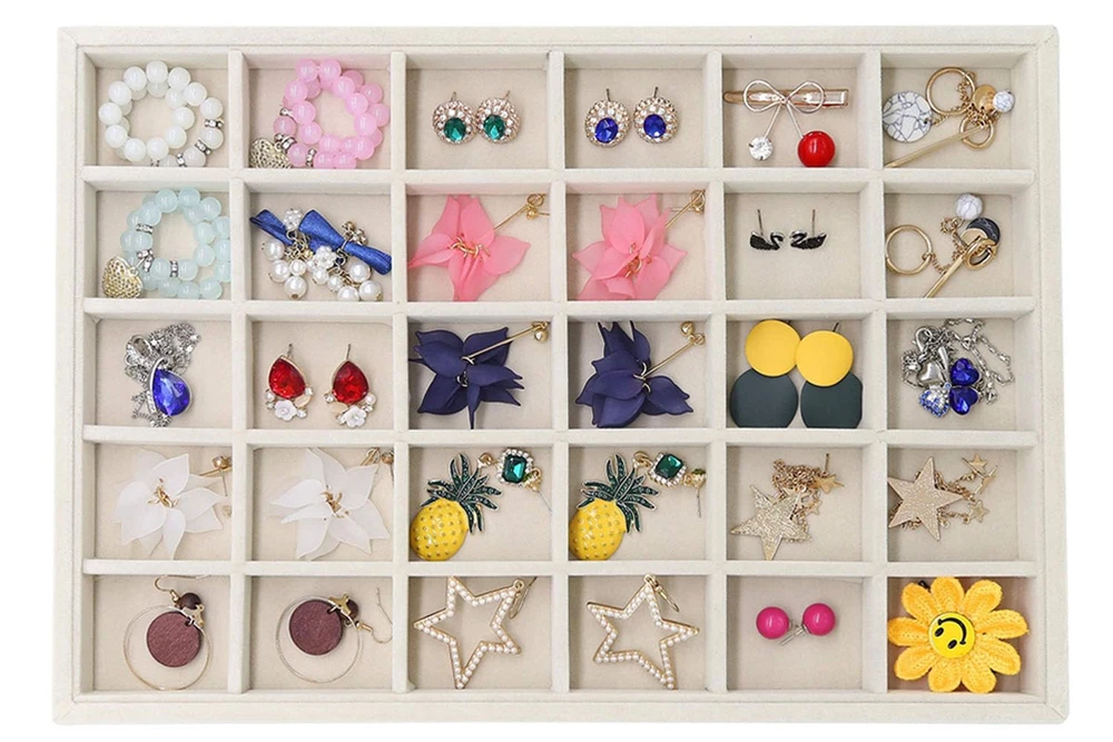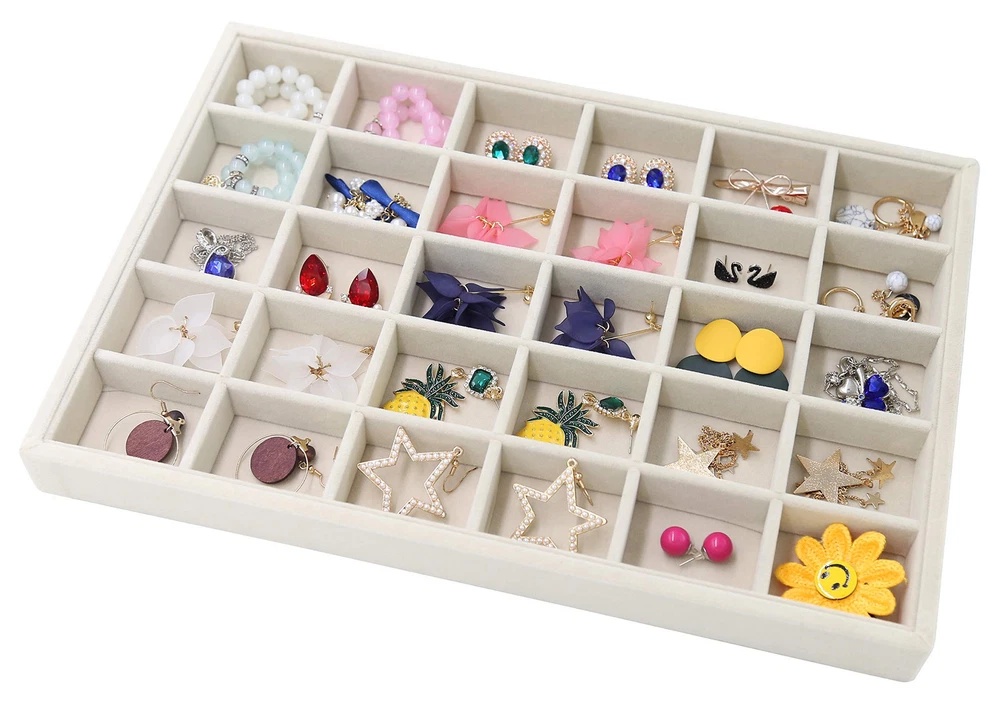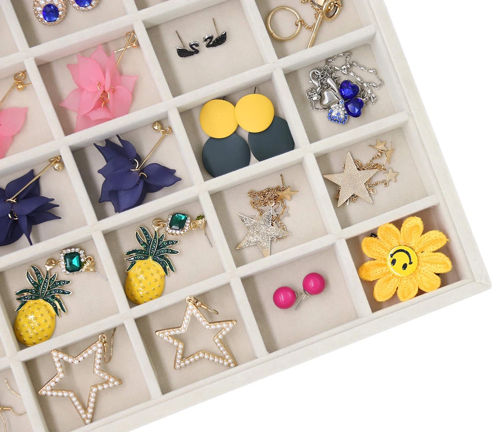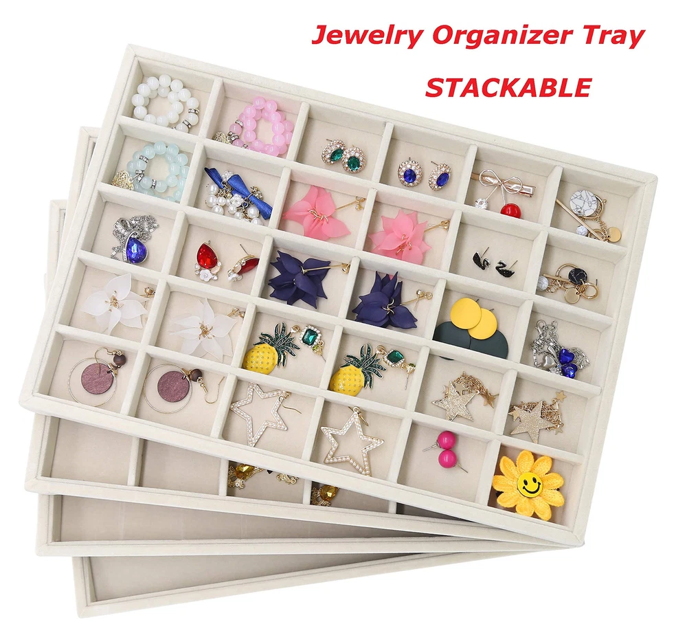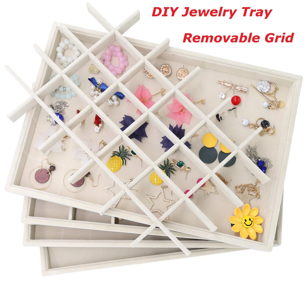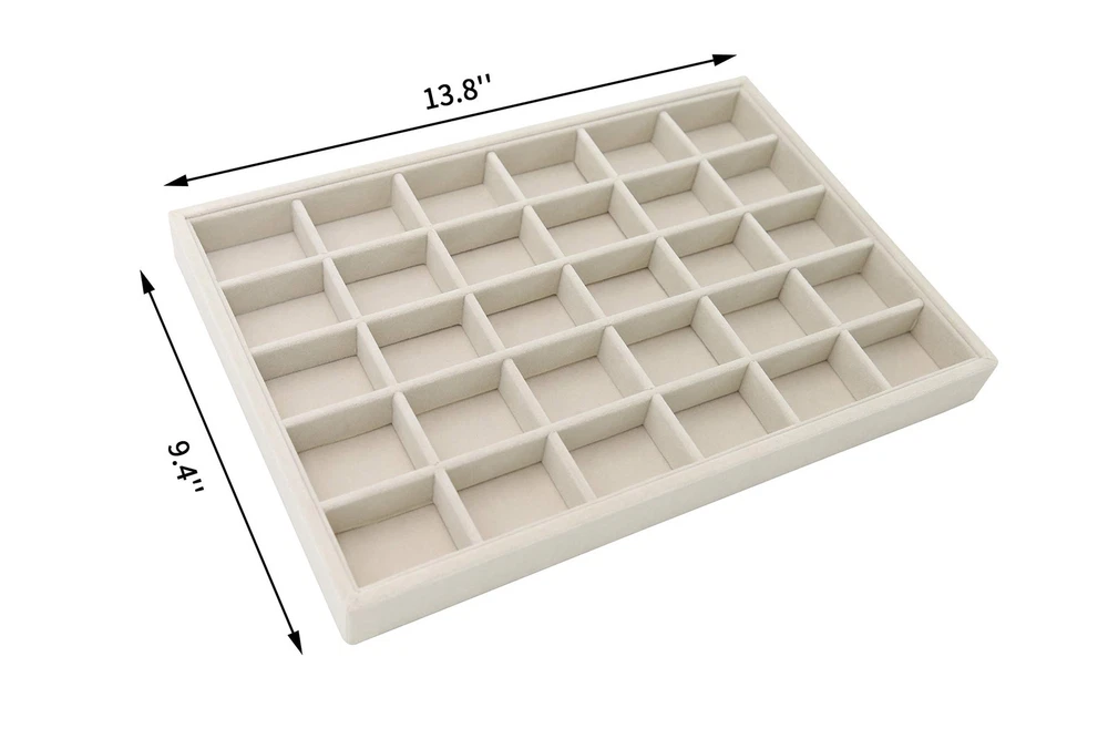 Overall Dimension: 35 x 24 x 3cm/13.8 x 9.4 x 1.2 inch(L x W x H), perfectly placed in your dresser, protecting your jewelry from scratches and damage. No more tangled jewelry or hunting for a matching earring High-Quality Material: Constructed with a durable composite board wrapped in premium velvet fabric, this jewelry holder organizer is soft to the touch and elegant in appearance. It can be stacked or separated conveniently so that you can store them on your dresser Jewelry Organizer: You can adjust the size and number of compartments by removing or adding the dividers to fit different sizes of jewelry and meet your personalized storage needs. It is much easier than a conventional jewelry box with a lid Multi-Usage: Great idea for displaying high-quality jewelry in retail stores, trade shows or in your own home. It is a perfect gift for a birthday, Valentine’s day, Mother’s day, or Christmas to jewelry lovers or friends in your life Satisfaction Guarantee: We are full of confidence in the quality of our products and we are adhering to the principle of 100% customer satisfaction, so if you have any questions, please feel free to contact us, we will be happy to serve you