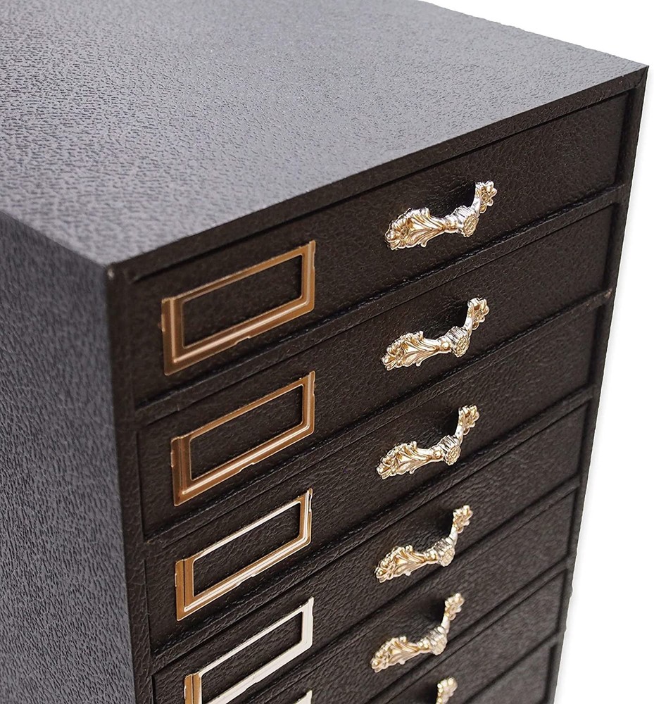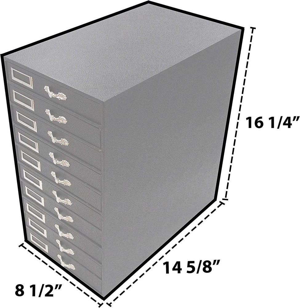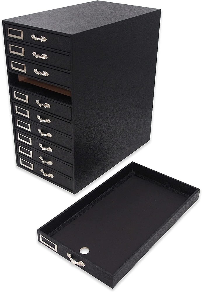 Jewelry storage drawers accommodate full size tray liners. Choose a liners that fit your needs best to go with this jewelry storage organizer! This organizer is a great choice for those who would like to be more organized with their jewelry or any other crafts for that matter! Ideal for use in the store or at home. Net Weight: 21.9 lbs. (Tray liners are included in grey and are assorted and jewelry not included.). NOTE: All liners are supplied depending on availability. COLOR: Embossed black FEATURES: (10) 1-1/4" deep drawers with exterior label pocket and handle. SIZE: 8 3/4" x 14 5/8" x 16 1/4"H USES: Organizing jewelry, findings, small toy pieces, puzzles, beads, and so much more. QUALITY: Made of durable composite, great for watchmakers, repair shops, boutiques, and even your home. COLOR: Embossed black FEATURES: (10) 1-1/4" deep drawers with exterior label pocket and handle. SIZE: 8 3/4" x 14 5/8" x 16 1/4"H USES: Organizing jewelry, findings, small toy pieces, puzzles, beads, and so much more. QUALITY: Made of durable composite, great for watchmakers, repair shops, boutiques, and even your home.