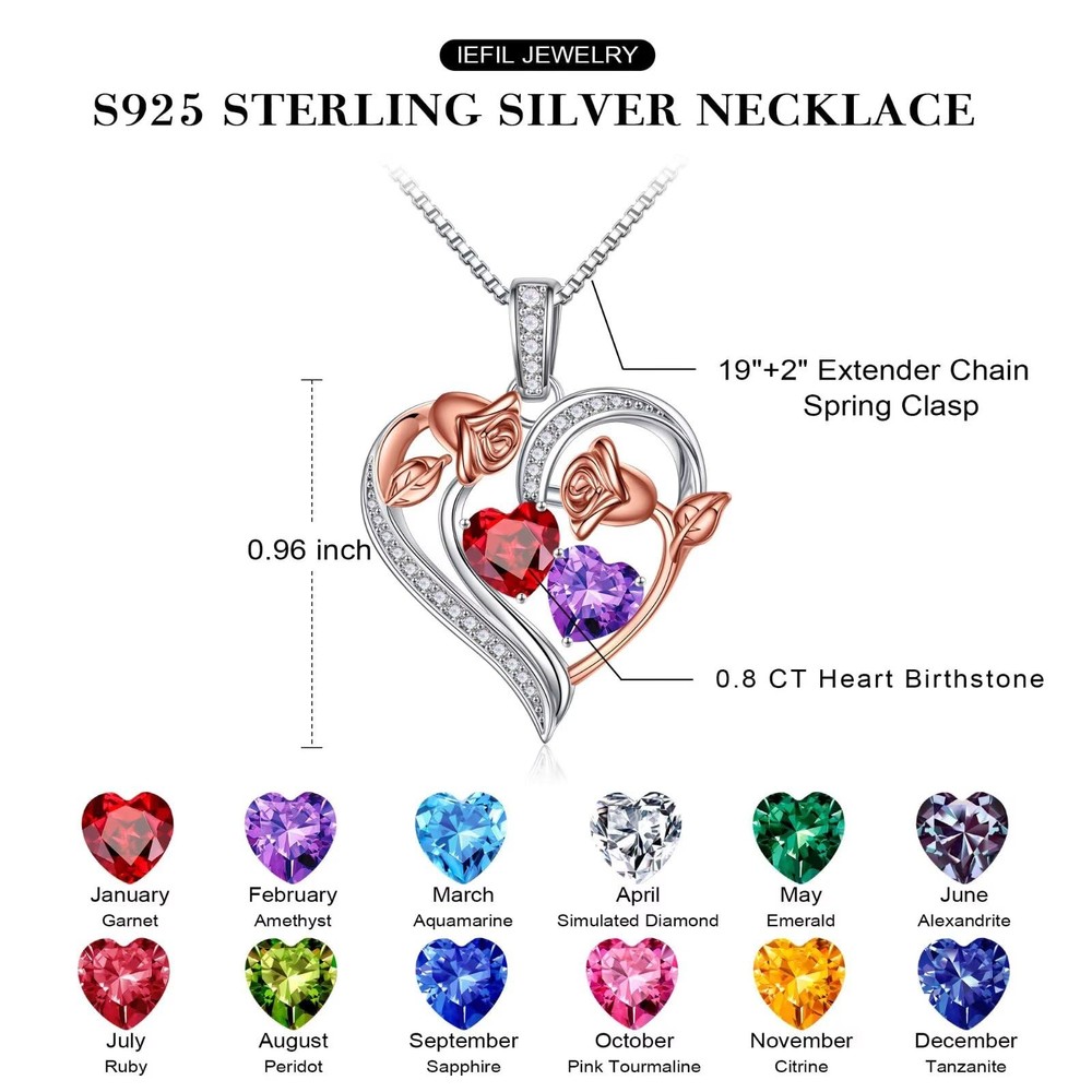 925 Sterling Silver Rose Heart Birthstone Necklace: Size: 19"+2" Material: 925 Sterling Silver Package: The rose heart pendant necklace is packaged well with a polishing cloth and a delicate PU Jewelry box. Jewelry Gifts for Women: ❤ Mom Gifts ❤ Birthday Gifts ❤ Wife Gifts ❤ Anniversary Gifts for Women Gifts for Women: Best Gifts for women. She will love it the moment she see it. We believe it will be a sentimental surprise for her. Jewelry Attention: When undressing the necklace, wipe each piece with a clean soft cloth to remove oils and perspiration. UNIQUE DESIGN:The unique rose heart design symbolizes eternal love, when she wears this necklace, she will be reminded of your love. The necklace is the perfect gift not only to express your love, but also to express your love for your wife, daughter, mother and other people you love. Wearing this 925 Sterling Silver Rose Heart Necklace you will get compliments from everyone around you. The chain length is 19"+2", suitable for most women. GIFTS FOR WOMEN: You can provide this rose heart birthstone necklace to your mother, daughter,wife on Anniversary,birthday party and other special occasions.This necklace is the perfect gift to express your love for her on any occasion! MATERIAL: Our rose Heart Birthstone necklace is made of 925 Sterling Silver, hypoallergenic and nickel-free,does not cause allergic reactions and does not damage to your skin.Our birthstone necklace is no fading,show your noble and maintaining a long-lasting luster for long time. DAINTY GIFT PACKAGE: The dainty rose heart birthstone necklace comes with a beautiful PU jewelry box and a polishing cloth, ready for giving. And our packaging is 99% biodegradable. Perfect gifts for your mom, wife, daughter, sister, friend on Birthday or other special days. AFTER SALES SERVICE: Any question about your Rose Heart Birthstone Necklace, please contact us and we will answer your question within 24hours and give you a satisfactory answer.