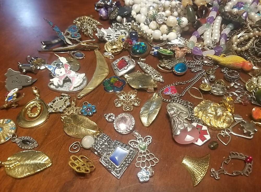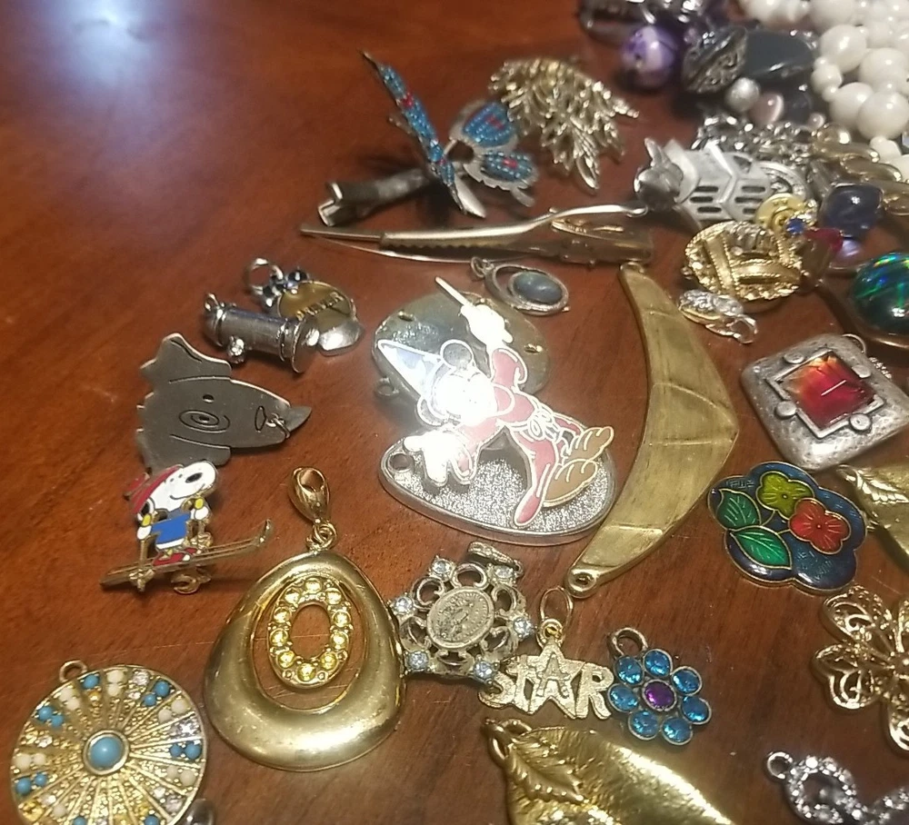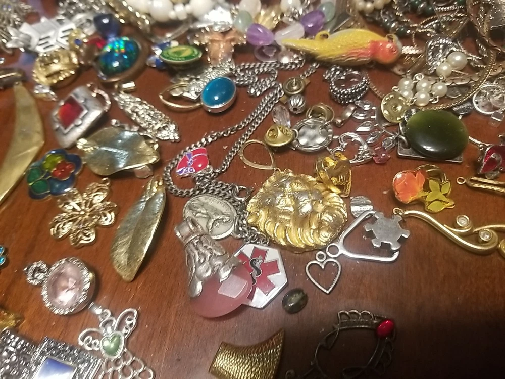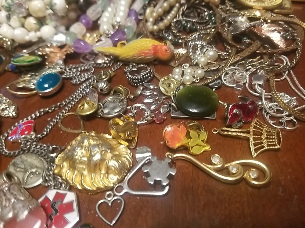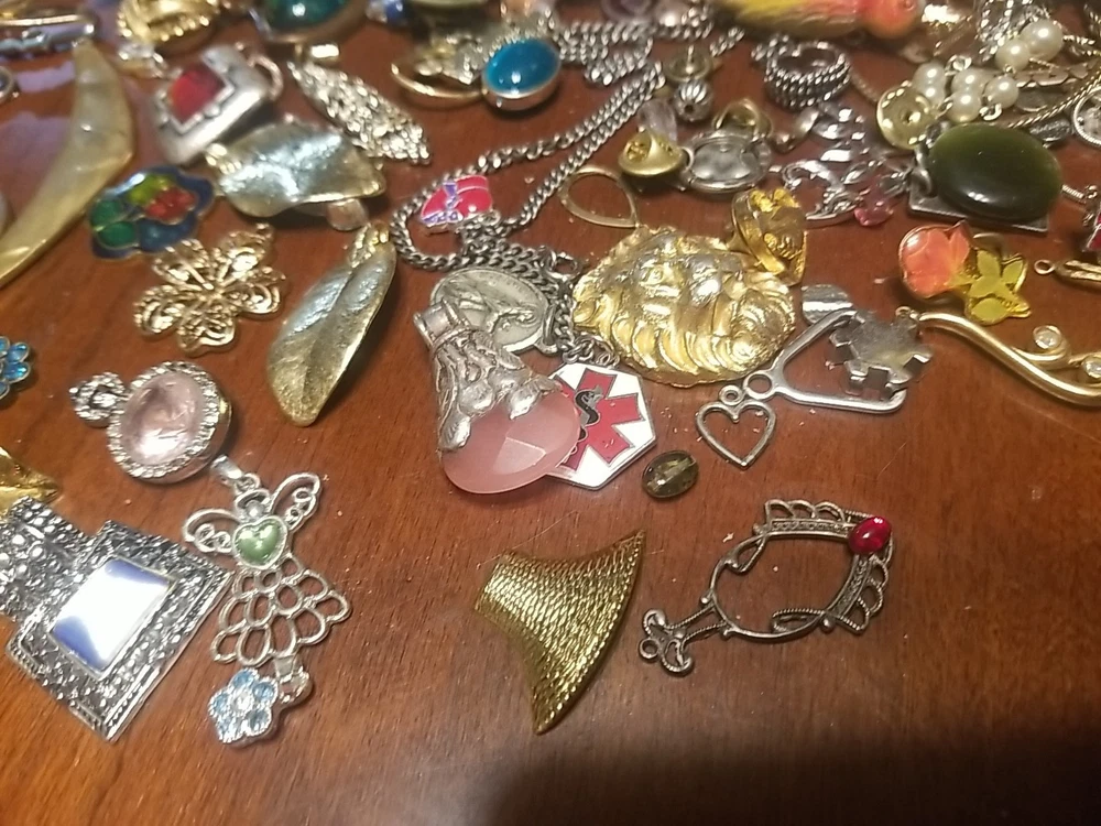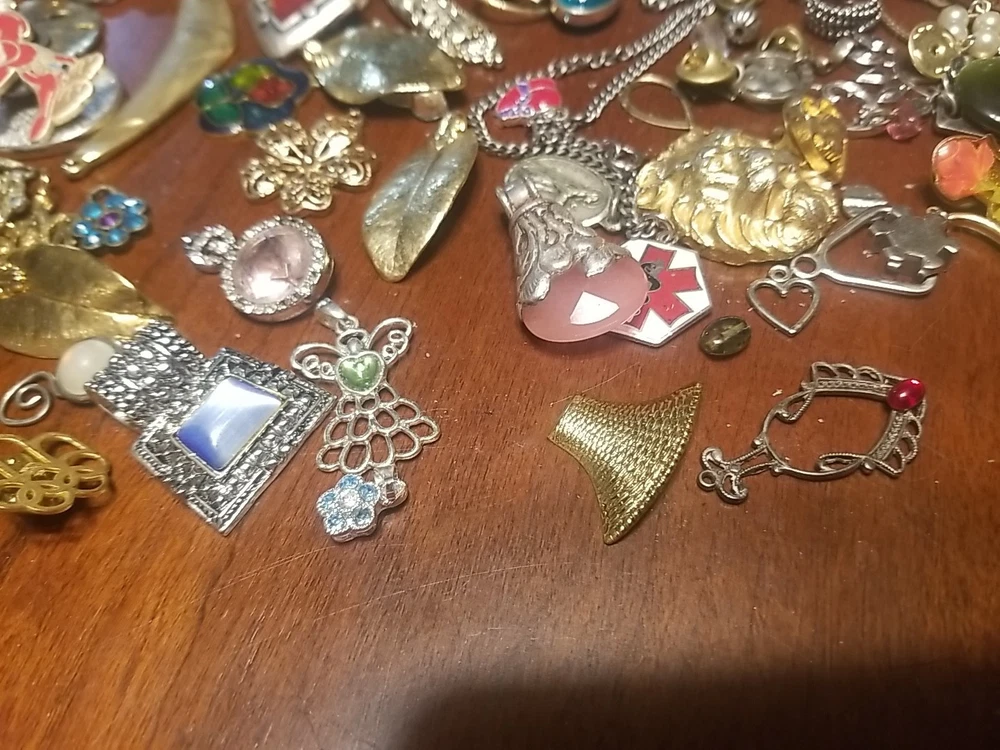 The product is a lot of assorted jewelry items including charms, key chains, pins, necklaces, pendants, brooches, and tie chips, all made from metal alloy in a variety of multicolor designs. The pieces are pre-made and not handmade, providing a convenient selection for crafters and jewelry makers looking to add unique and colorful accents to their creations. This lot offers a diverse range of options for adding decorative elements to various projects. I am getting so tired of shorting threw my jewelry. I am going to start selling unsorted jewelry lots like this. If you buy multiple items. I will ship them together and save you on shipping. I will refund overpayment of shipping.