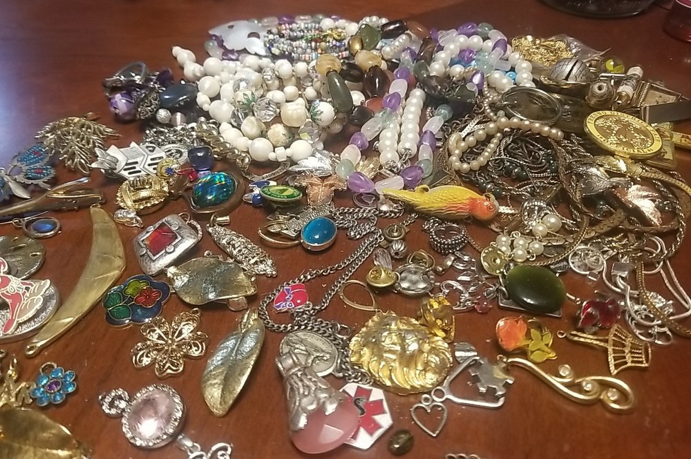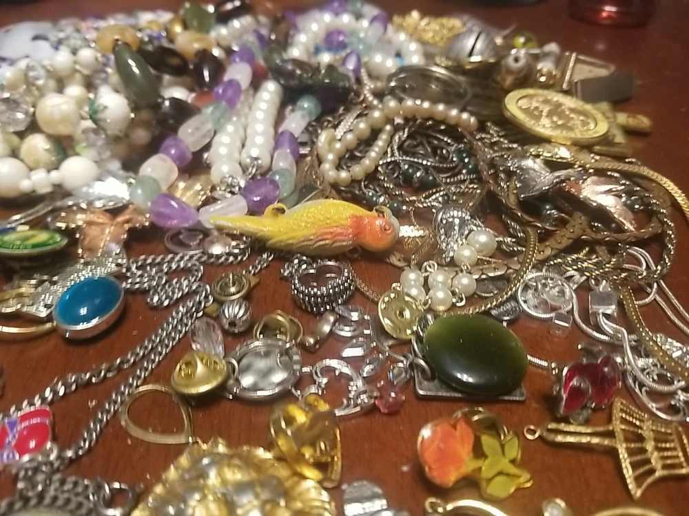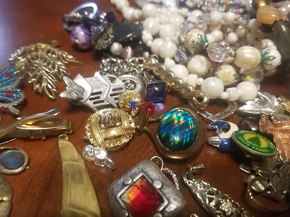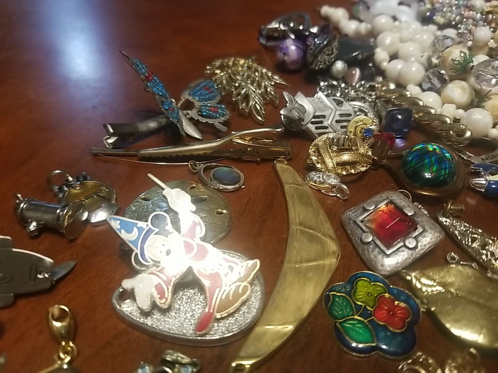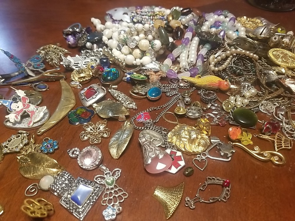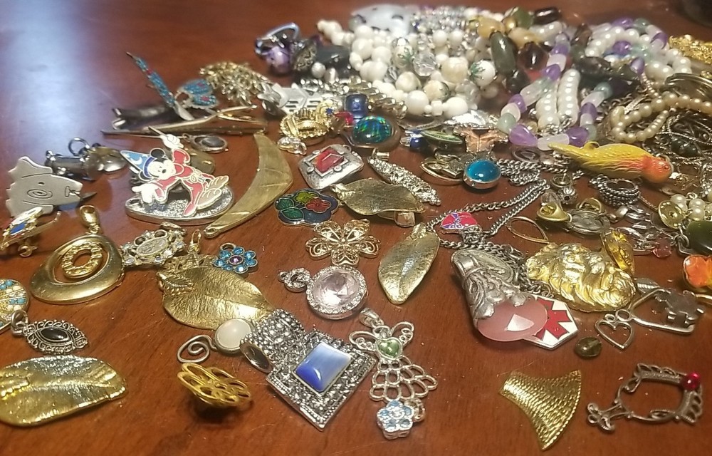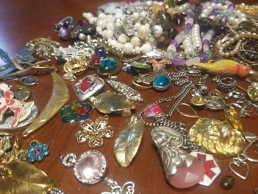 The product is a lot of assorted jewelry items including charms, key chains, pins, necklaces, pendants, brooches, and tie chips, all made from metal alloy in a variety of multicolor designs. The pieces are pre-made and not handmade, providing a convenient selection for crafters and jewelry makers looking to add unique and colorful accents to their creations. This lot offers a diverse range of options for adding decorative elements to various projects. I am getting so tired of shorting threw my jewelry. I am going to start selling unsorted jewelry lots like this. If you buy multiple items. I will ship them together and save you on shipping. I will refund overpayment of shipping.