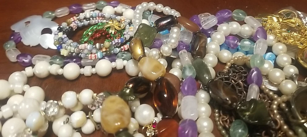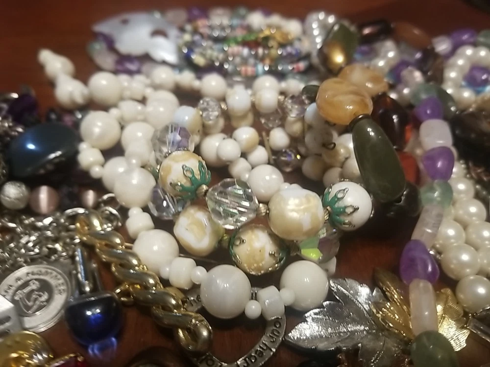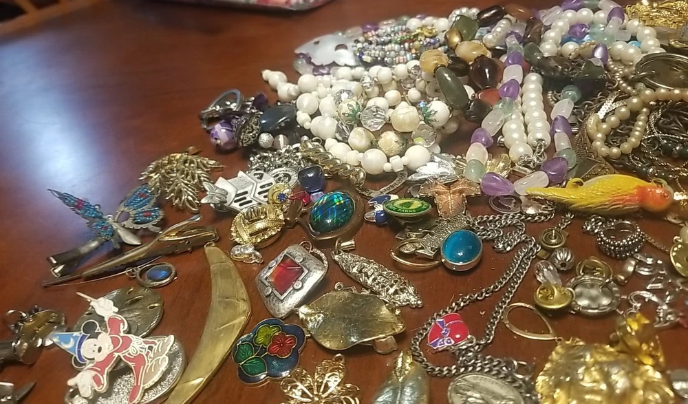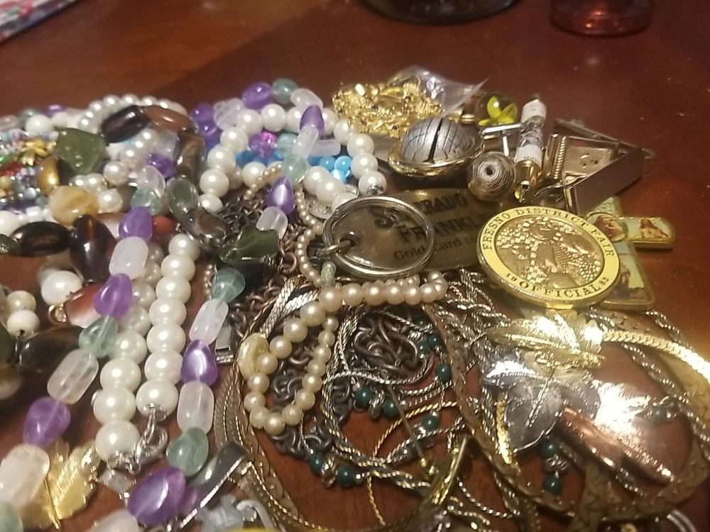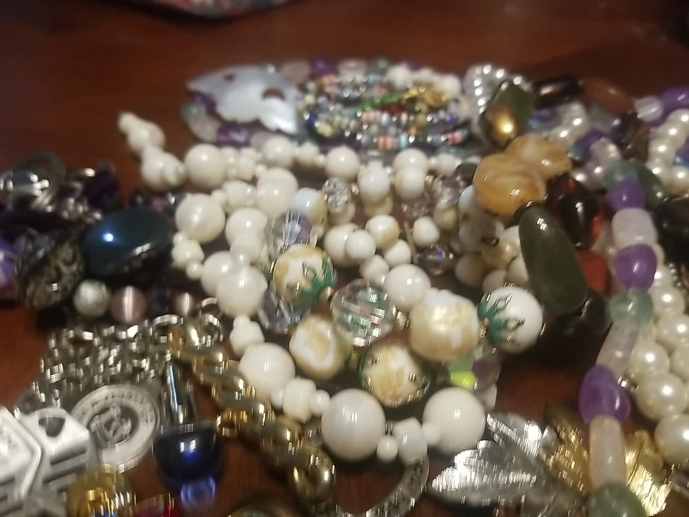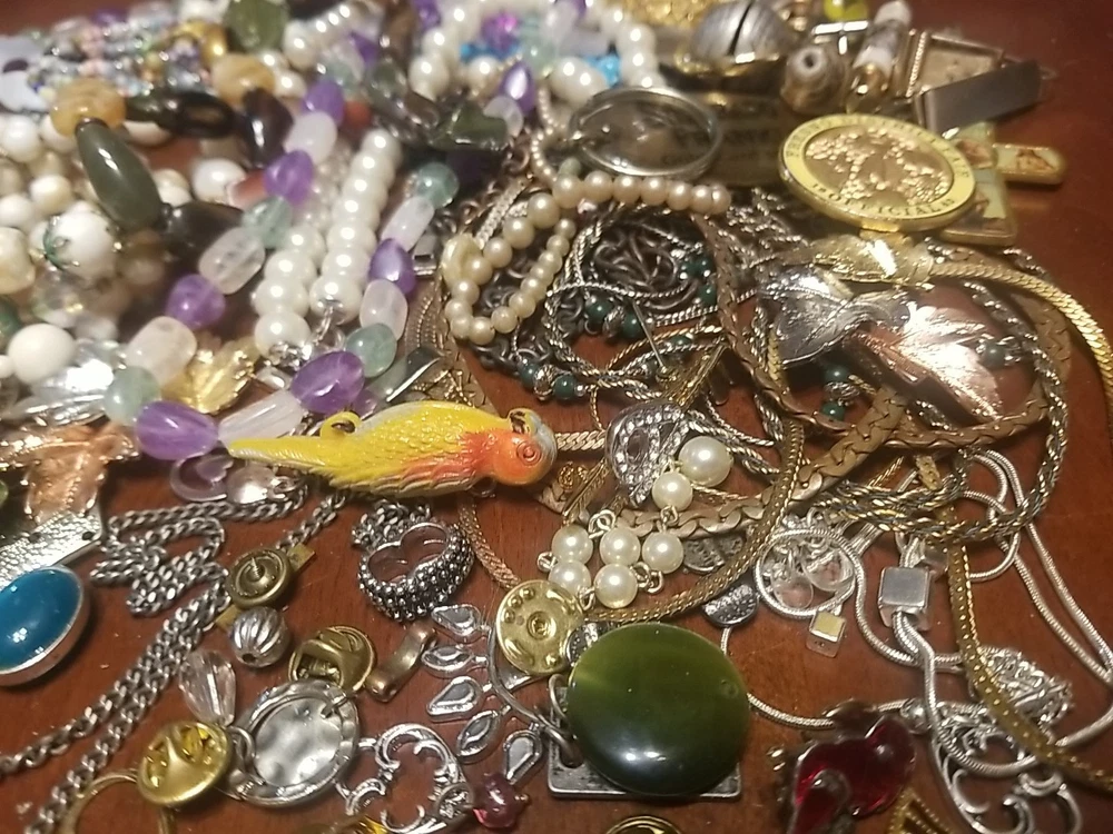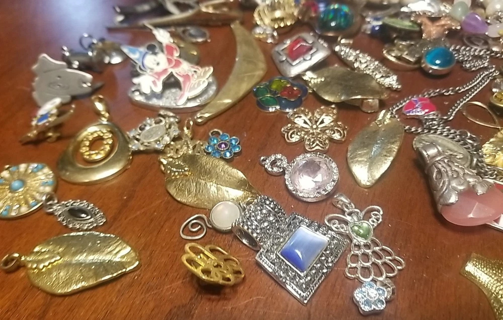 The product is a lot of assorted jewelry items including charms, key chains, pins, necklaces, pendants, brooches, and tie chips, all made from metal alloy in a variety of multicolor designs. The pieces are pre-made and not handmade, providing a convenient selection for crafters and jewelry makers looking to add unique and colorful accents to their creations. This lot offers a diverse range of options for adding decorative elements to various projects. I am getting so tired of shorting threw my jewelry. I am going to start selling unsorted jewelry lots like this. If you buy multiple items. I will ship them together and save you on shipping. I will refund overpayment of shipping.