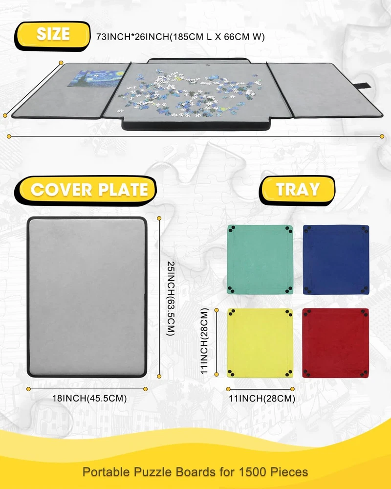 [Upgrade Your Puzzle Board] - Our portable puzzle board is perfect for storing, transporting and assembling your favorite puzzles. It has a flexible and sturdy carrying handle and black waterproof bag, as well as 2 separate puzzle mat that you can easily move around, while the portable design makes it safe from pets and children! it's lighter than traditional wooden storage racks and superior to other materials used for portable puzzle boards. [Perfect Size For Your Puzzles] -Our Folding puzzle table Unfolded size 73inch*26inch, and fits most 1500 piece puzzles. Plus, our 2-in-1 multi-purpose colorful puzzle sorting trays help you keep your puzzles organized. you can easily organize unfinished puzzles by 4 different color, picture, or edge pieces. Perfect for solo puzzlers or families. [Designed For Puzzle Lovers] - Our Puzzle Caddy Board With a high-quality zipper for a sturdy closure system, premium vegan leather for a stylish look and long-lasting durability, waterproof material for the safety of your masterpiece, non-slip microsuede work surface, and a sturdy carrying handle for easy maneuvering, you'll love the portability of jigsaw puzzle boards portable and find them a great solution for completing puzzles on the go. [Stay Organized] - Don't let your puzzles take over your space. Our Puzzle Storage Board is the perfect portable puzzle table for adults or anyone who wants to keep their puzzle boards organized and stored when not in use. With a removable puzzle board work surface, you can easily go from working on a puzzle to storing it. [Perfect Gift For Puzzle Lovers] - Looking for the perfect gift for the puzzle lover in your life? our beautifully designed portable puzzle caddy board is of the best puzzle accessories to use as a birthday gift, gift for mom, Father's Day gift, grandma gifts, especially during the holiday season like Thanksgiving and Christmas.