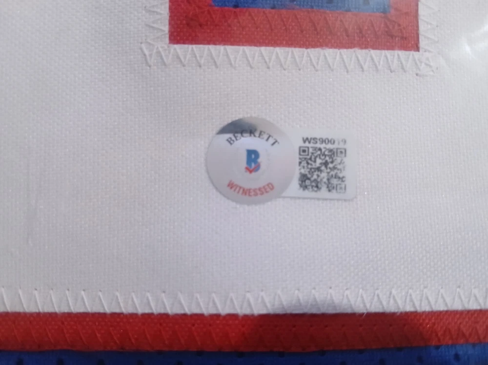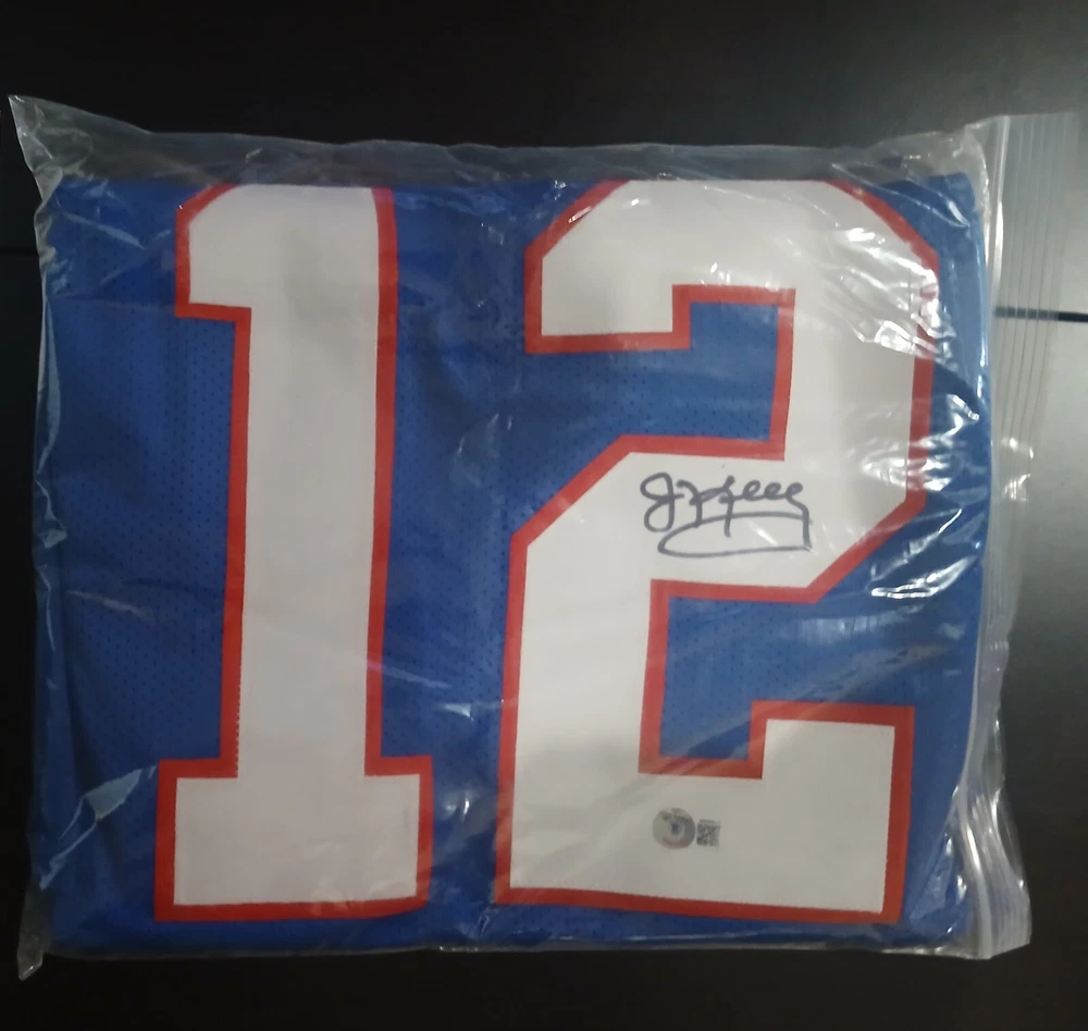This Jim Kelly autographed jersey is a must-have for any NFL fan. The jersey is an original, certified by Beckett Authentication Services (BAS). The signature is pristine, making this a valuable addition to any sports memorabilia collection. The jersey is perfect for displaying or wearing to your next tailgate party. It is a great way to show your support for the former Buffalo Bills quarterback and appeal to your fan base. Don't miss out on this opportunity to own a piece of football history.