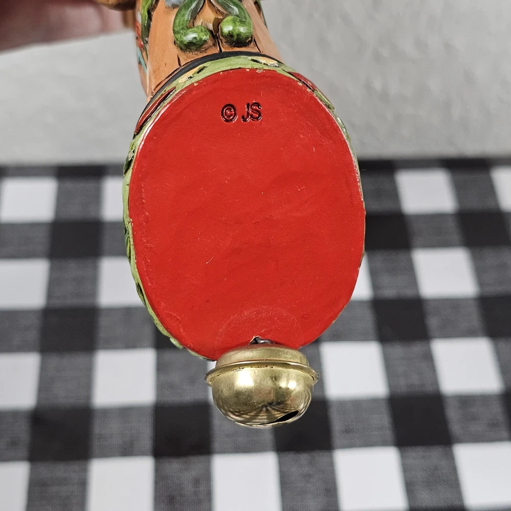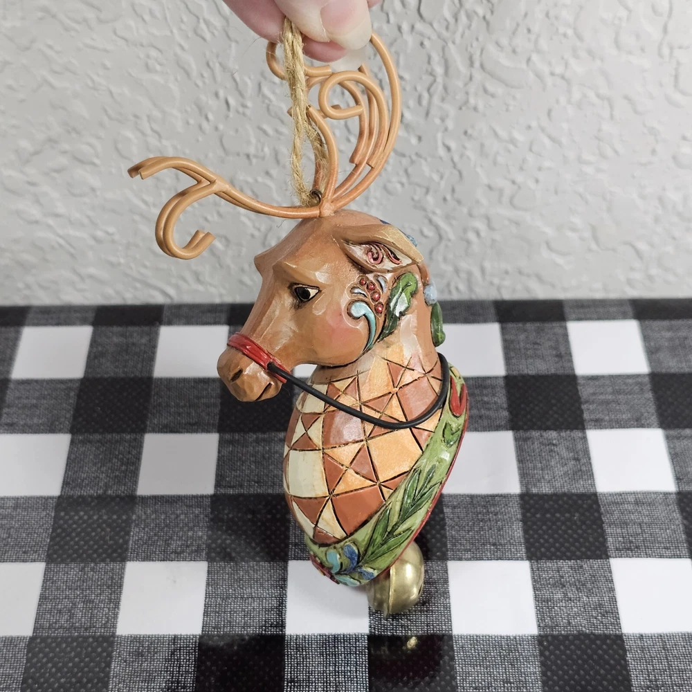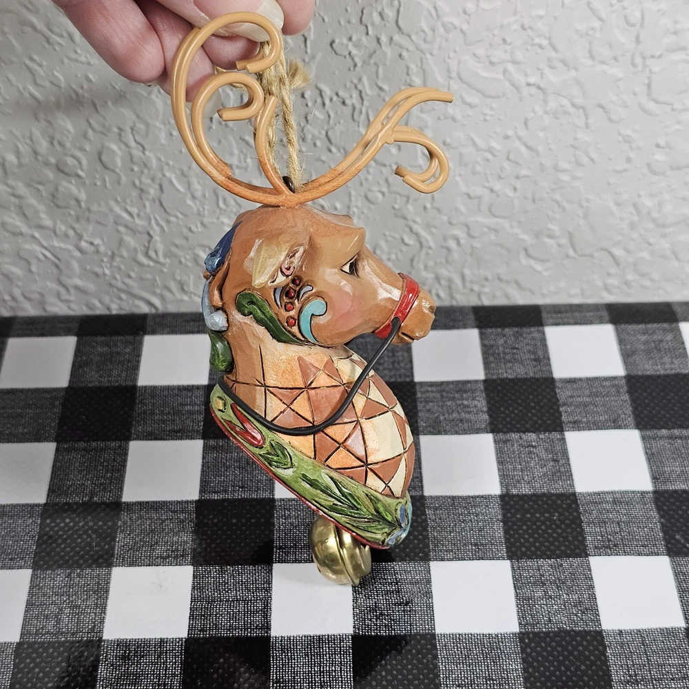 Jim Shore Reindeer w/ Dangle Bell Holiday Hanging Christmas Ornament Enesco 2010 We have decided to downsize our Christmas tree so I'm selling a BUNCH of our ornaments as well as some Christmas decor. Lots of vintage items. Most still have original packaging. Smoke free home. Sold as is. From artist Jim Shore - this is a beautifully crafted and painted reindeer ornament with a small bell attached. The ornament has the signature red and white plaid coloring, with a Christmas themed bottom. Nicely appointed antlers made from sturdy wire. Measures 5 inches long.
